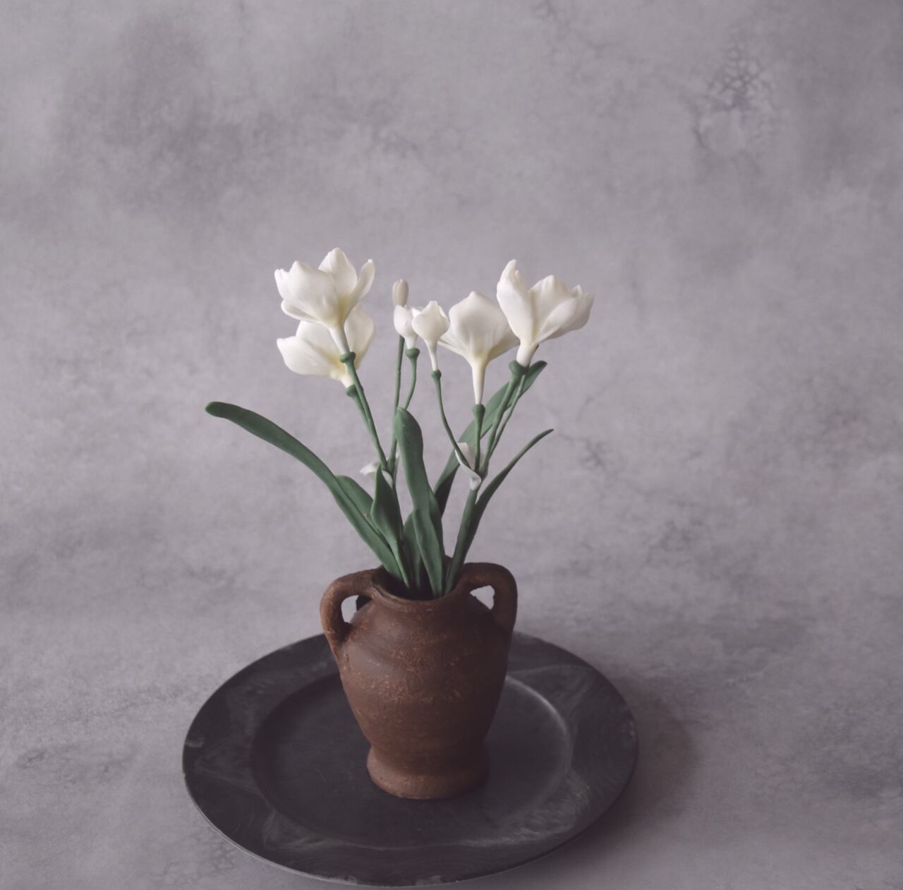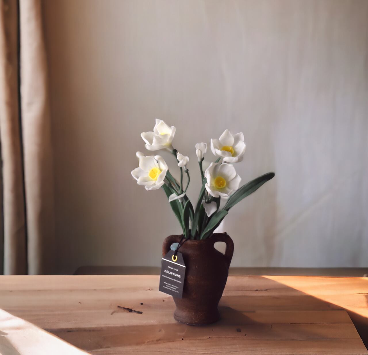 粘土で水仙(スイセン)を作り、手のひらサイズの壺に生けました。
