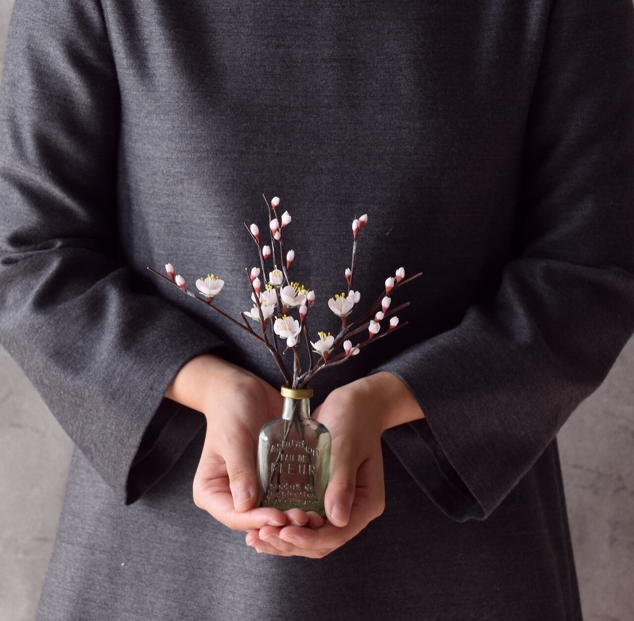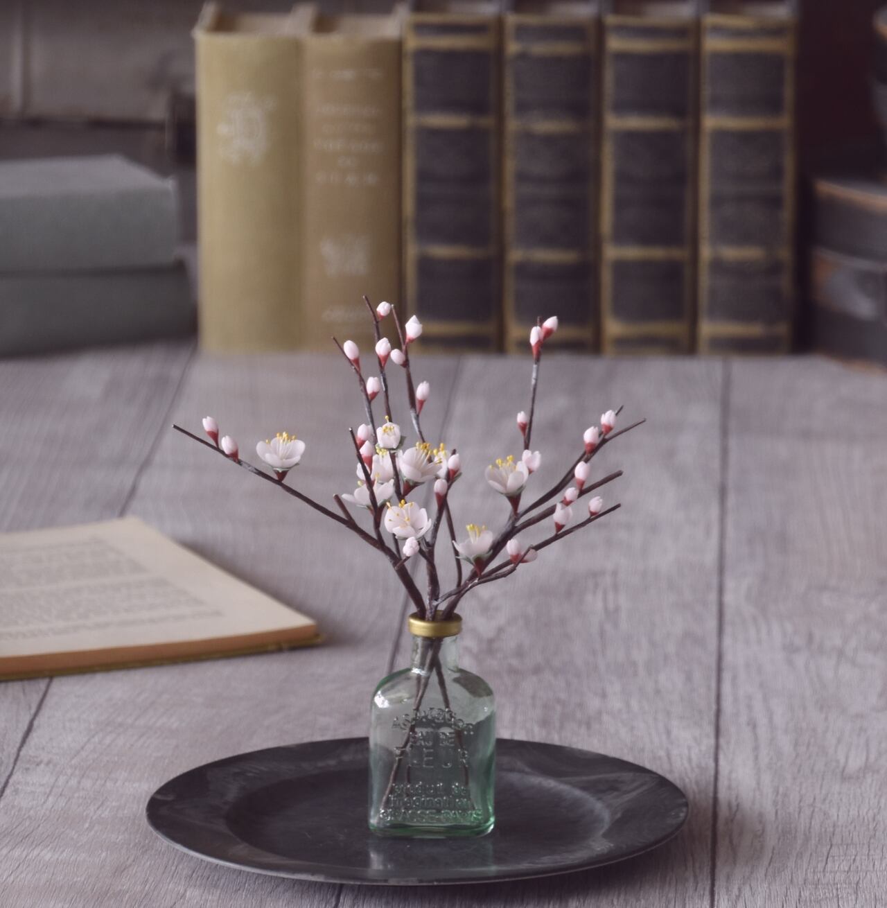 梅は細い枝をゆったりと活けましたのでよく映え、ピンクの花色で春を感じていただけます。