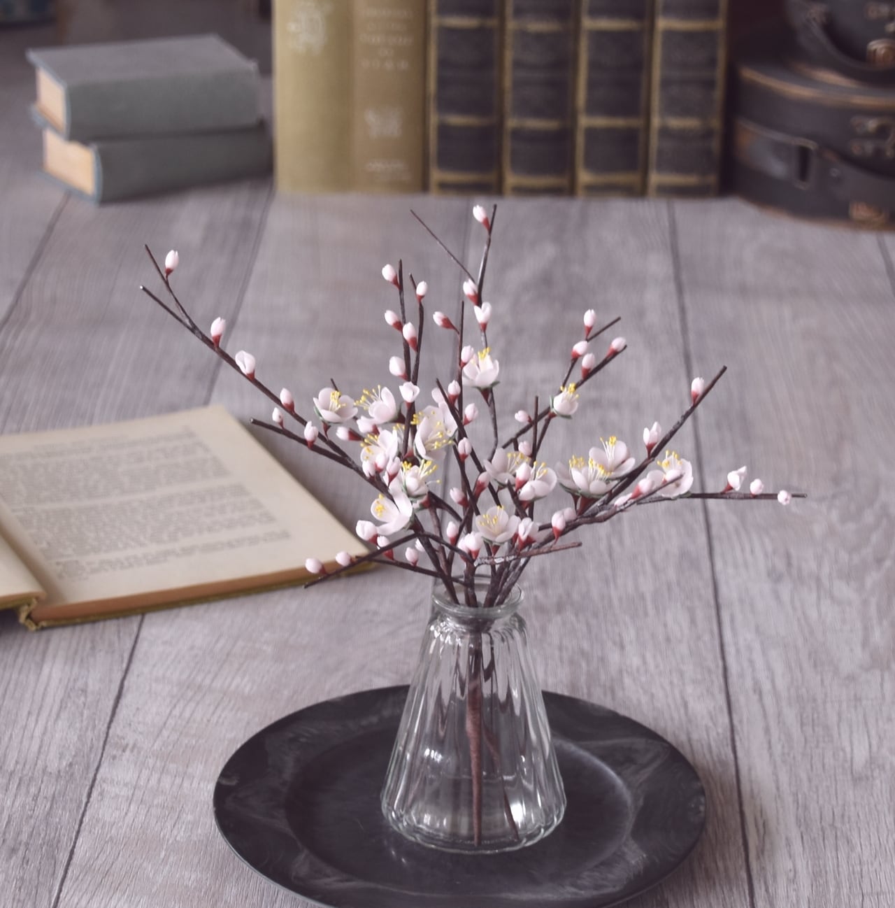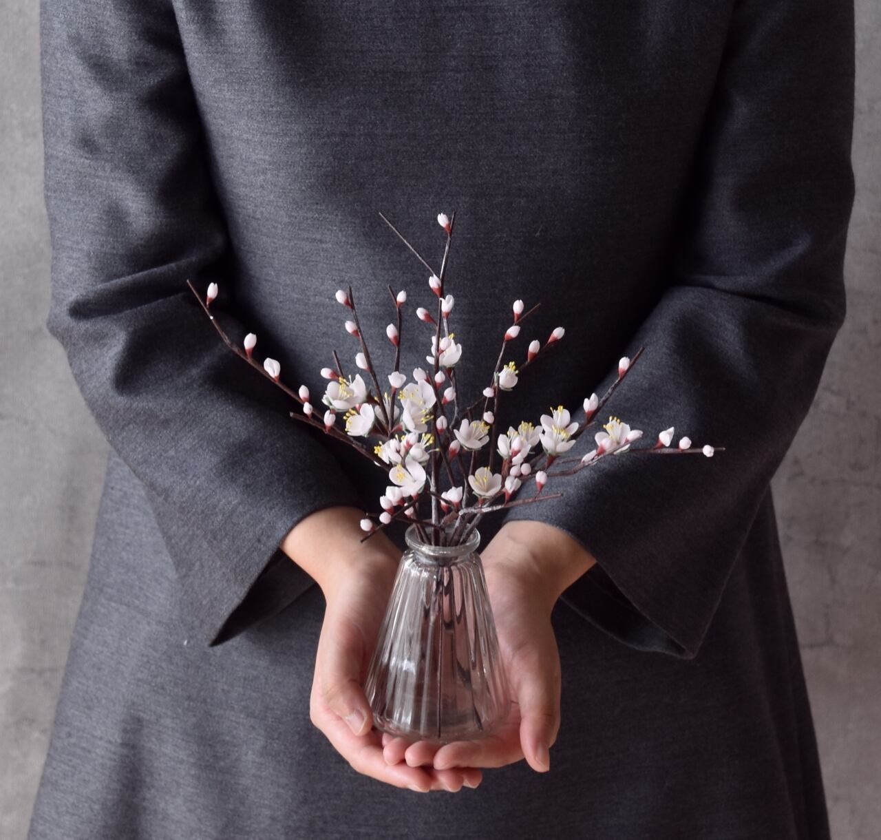 ボトルは一輪挿しや、小花を生けたりするのにぴったりのサイズなので使いやすく、梅の小さな花の可愛らしさを引き立ててくれます。