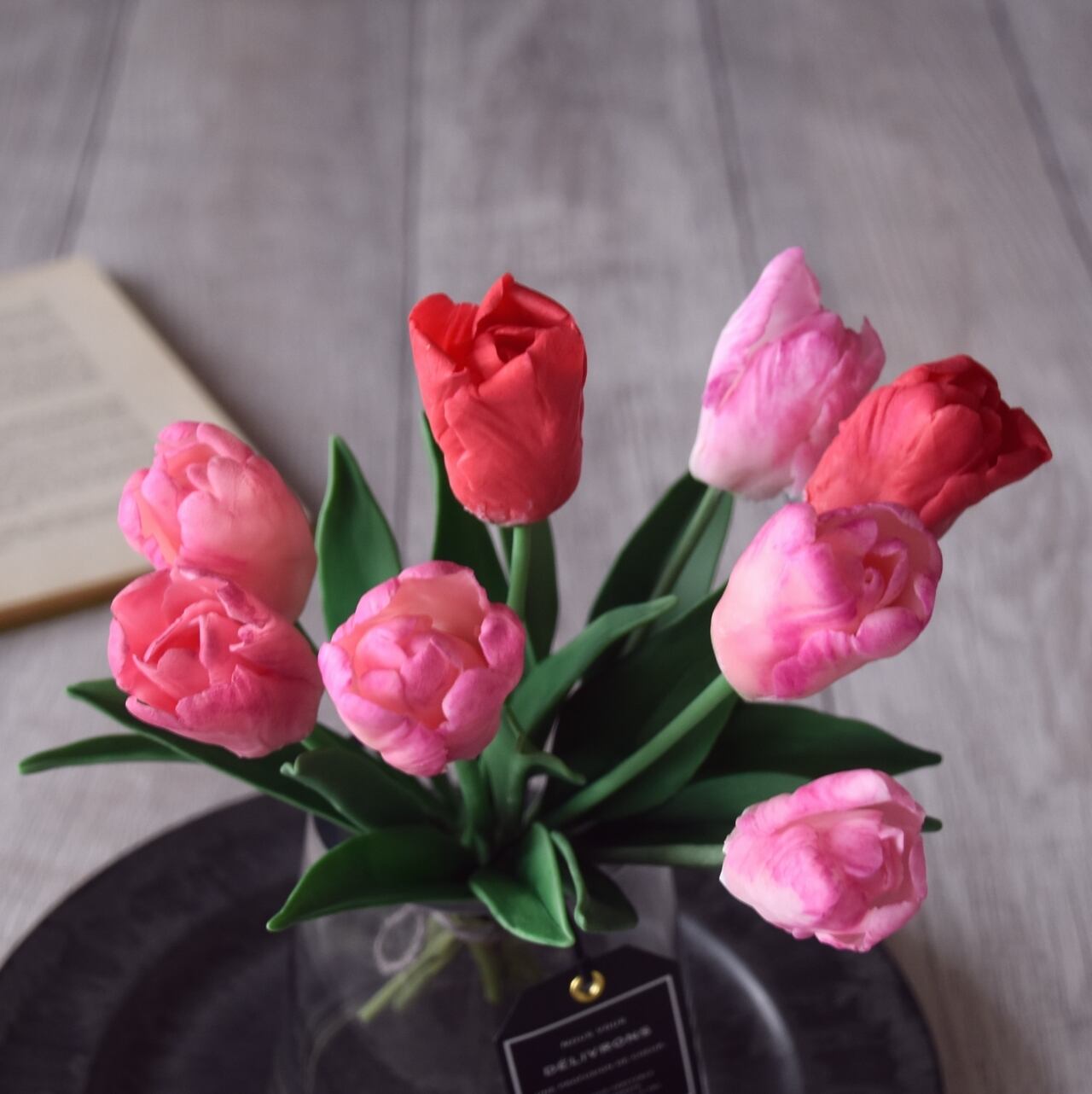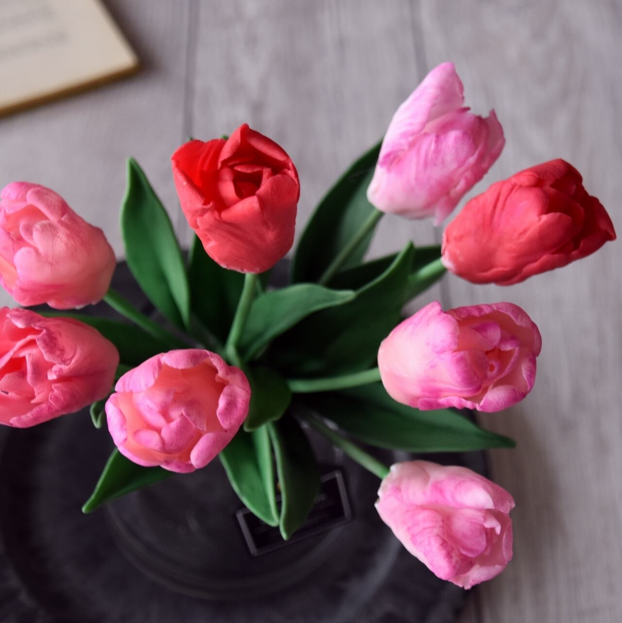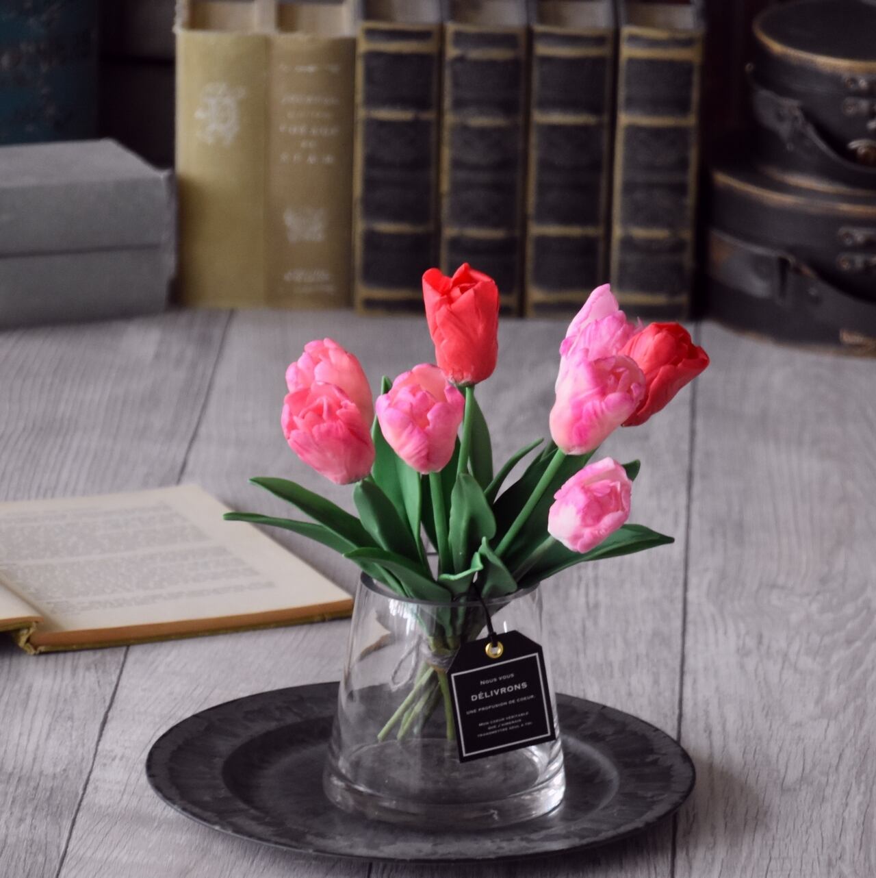 粘土でチューリップを制作し、シンプルなガラスボトルに生けました。
