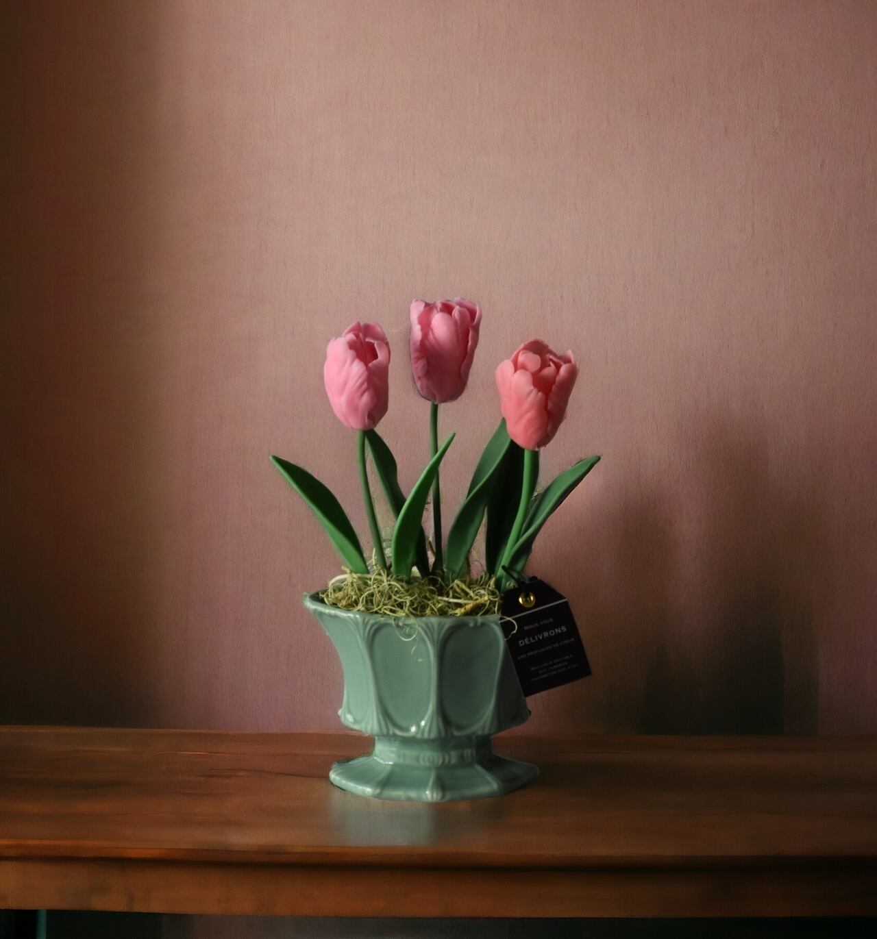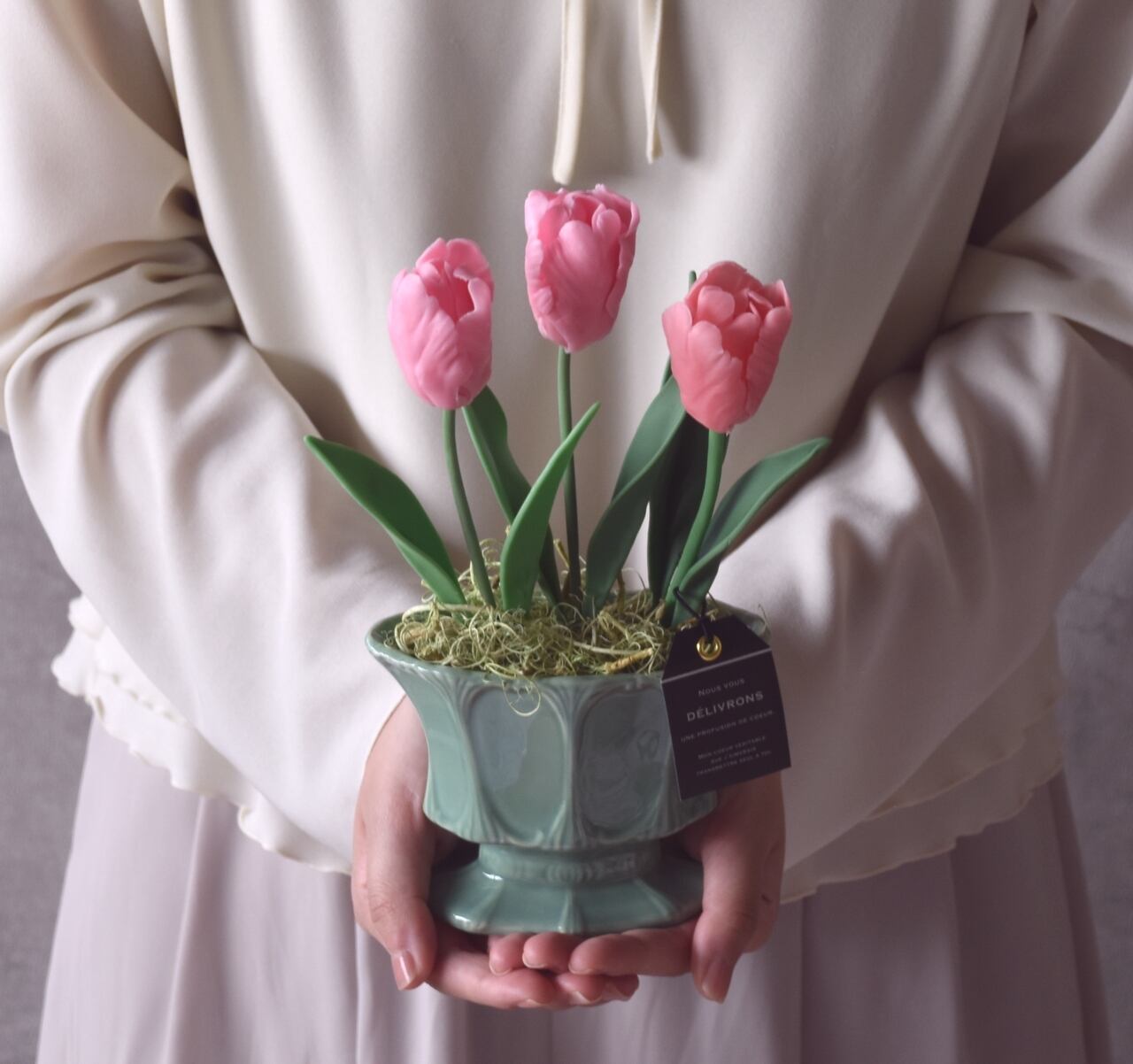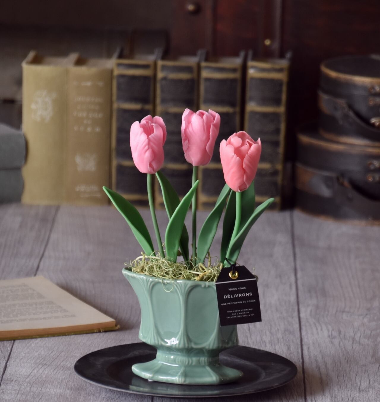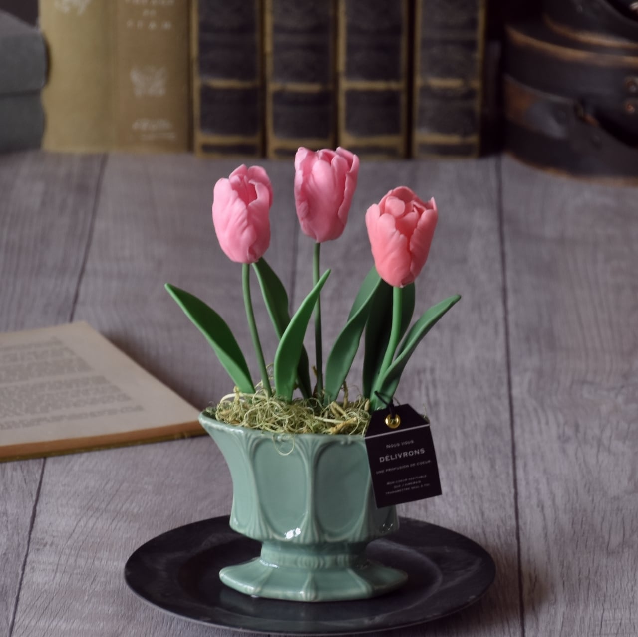 粘土でチューリップを制作し、エレガントなベースに植え込みました。
