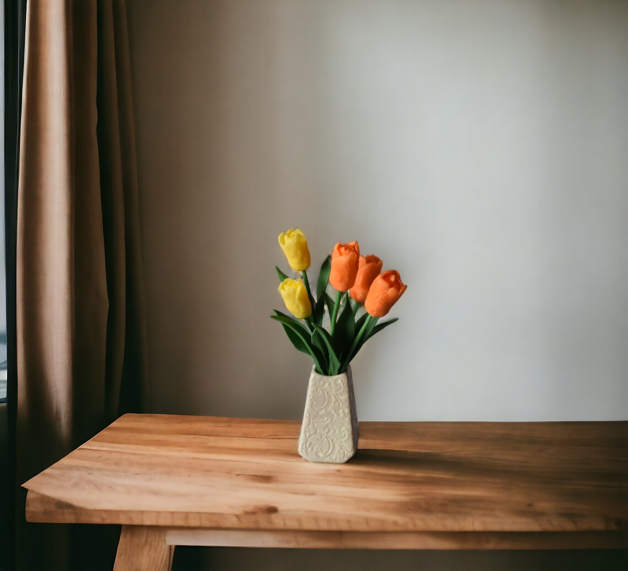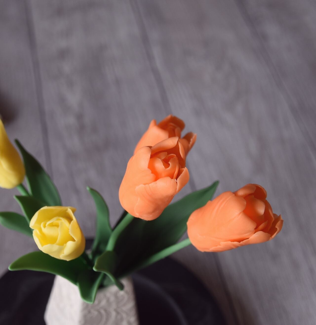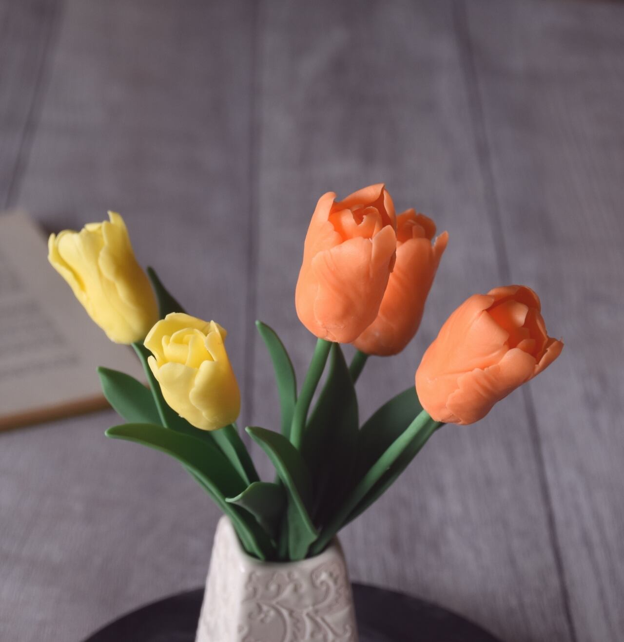 粘土でチューリップを制作し、エレガントなフラワーベースに生けました。