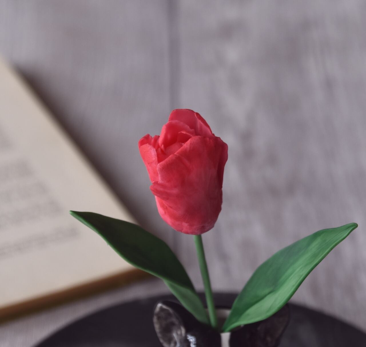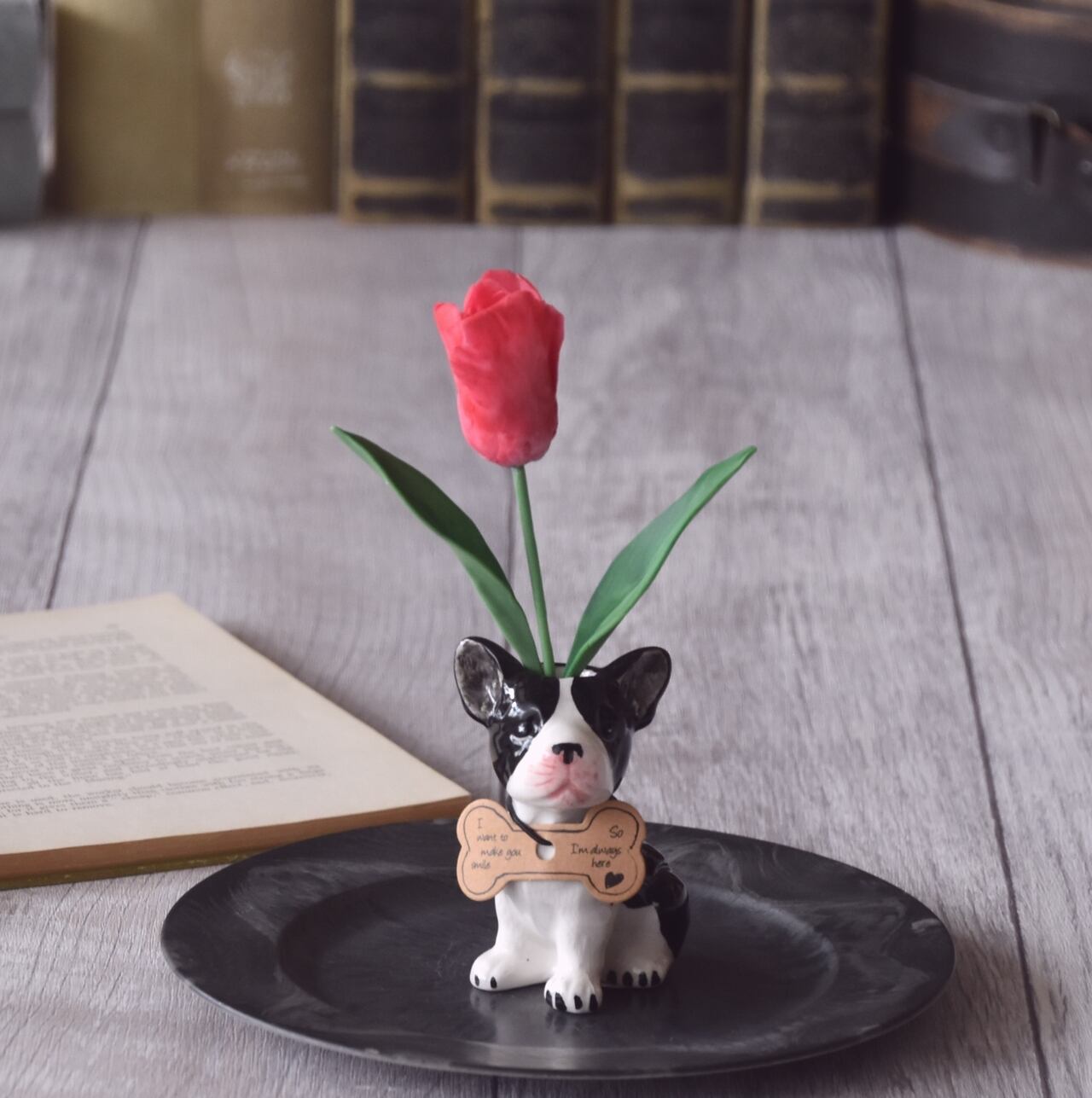 粘土でチューリップを制作し、フレンチブルドッグのベースに生けました。