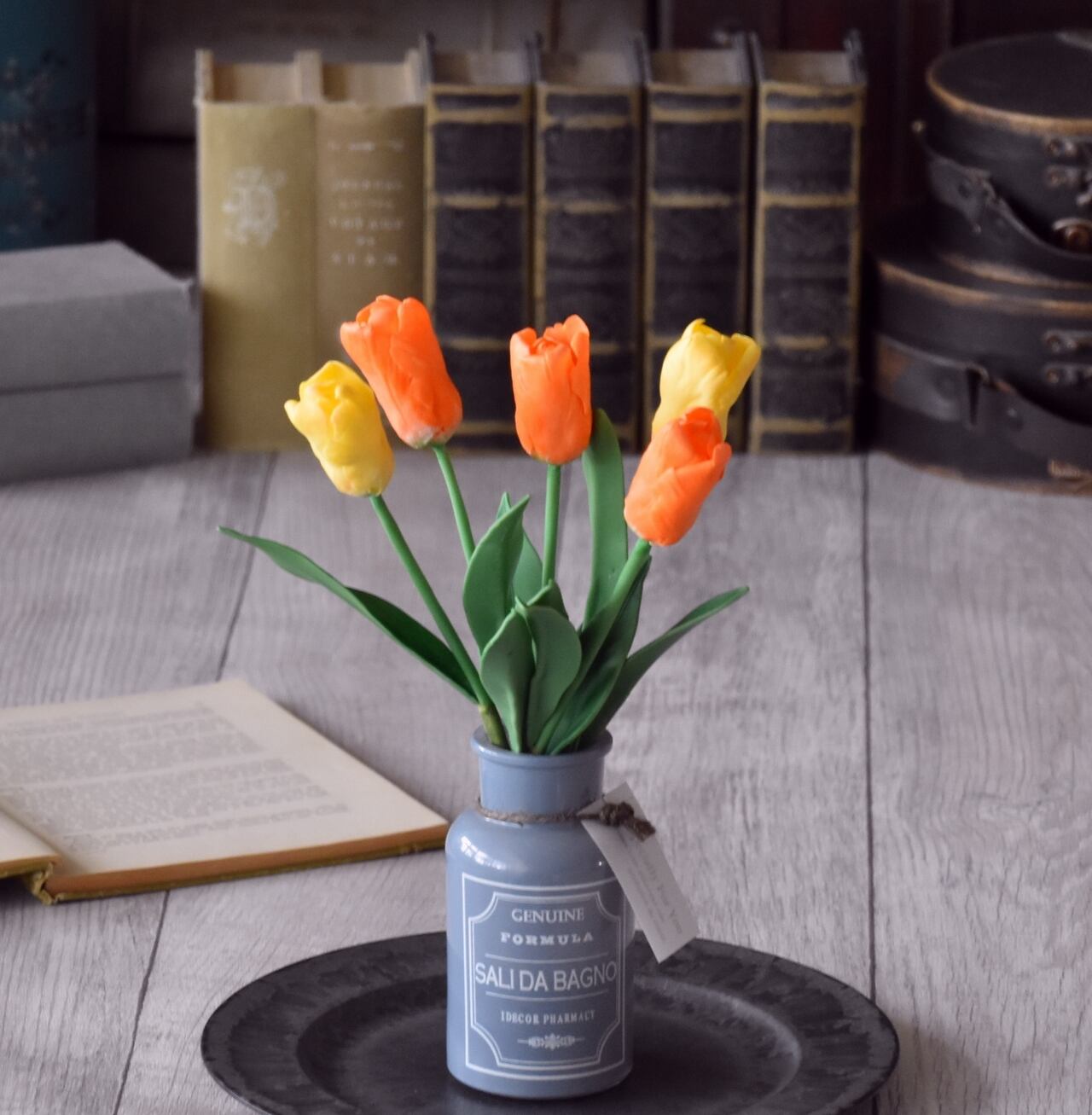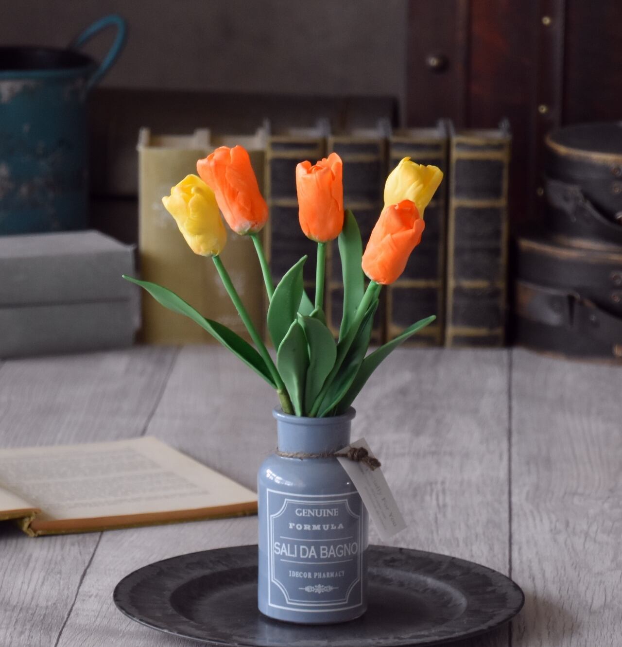 粘土でチューリップを制作し、おしゃれなボトルに生けました。