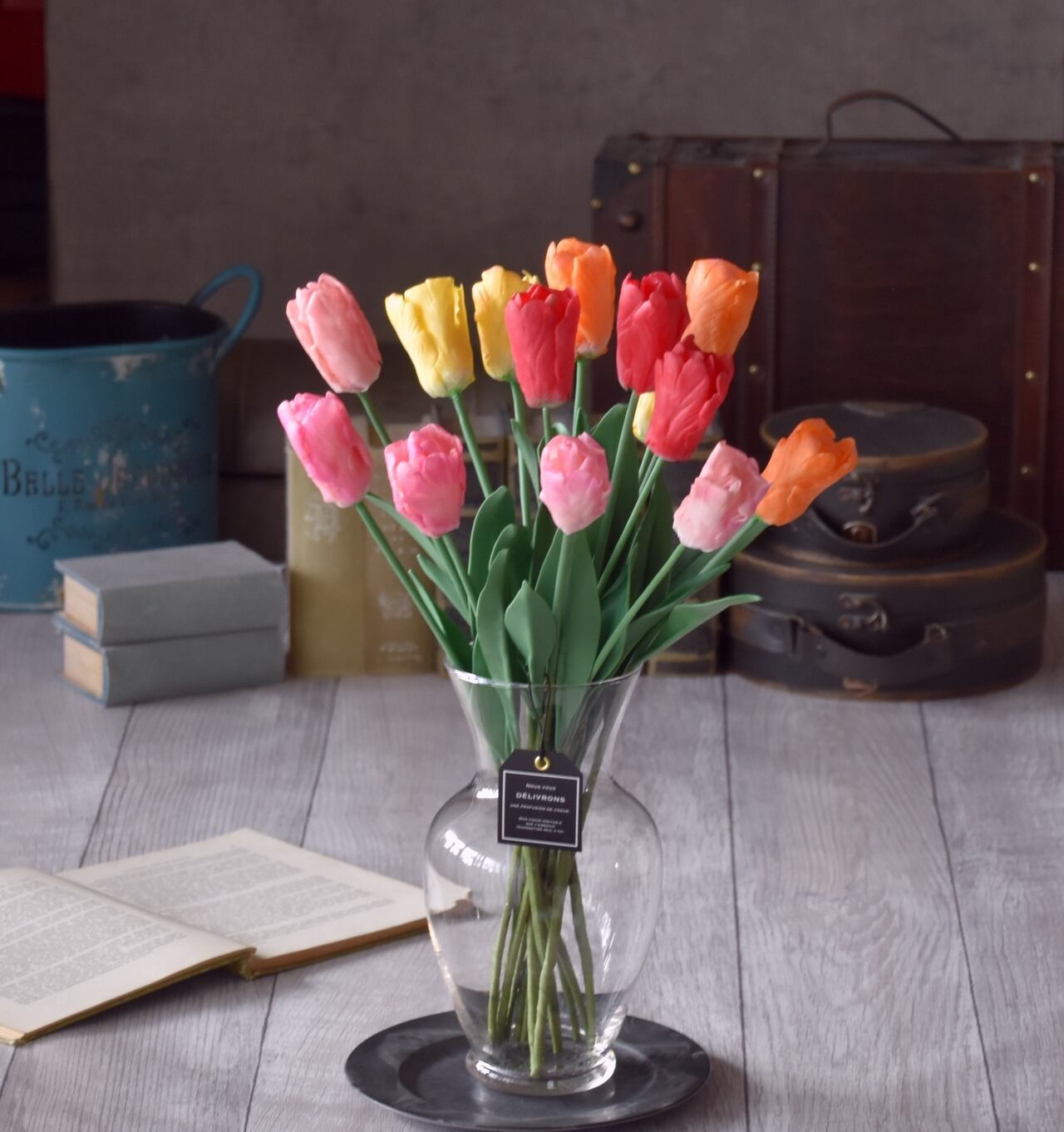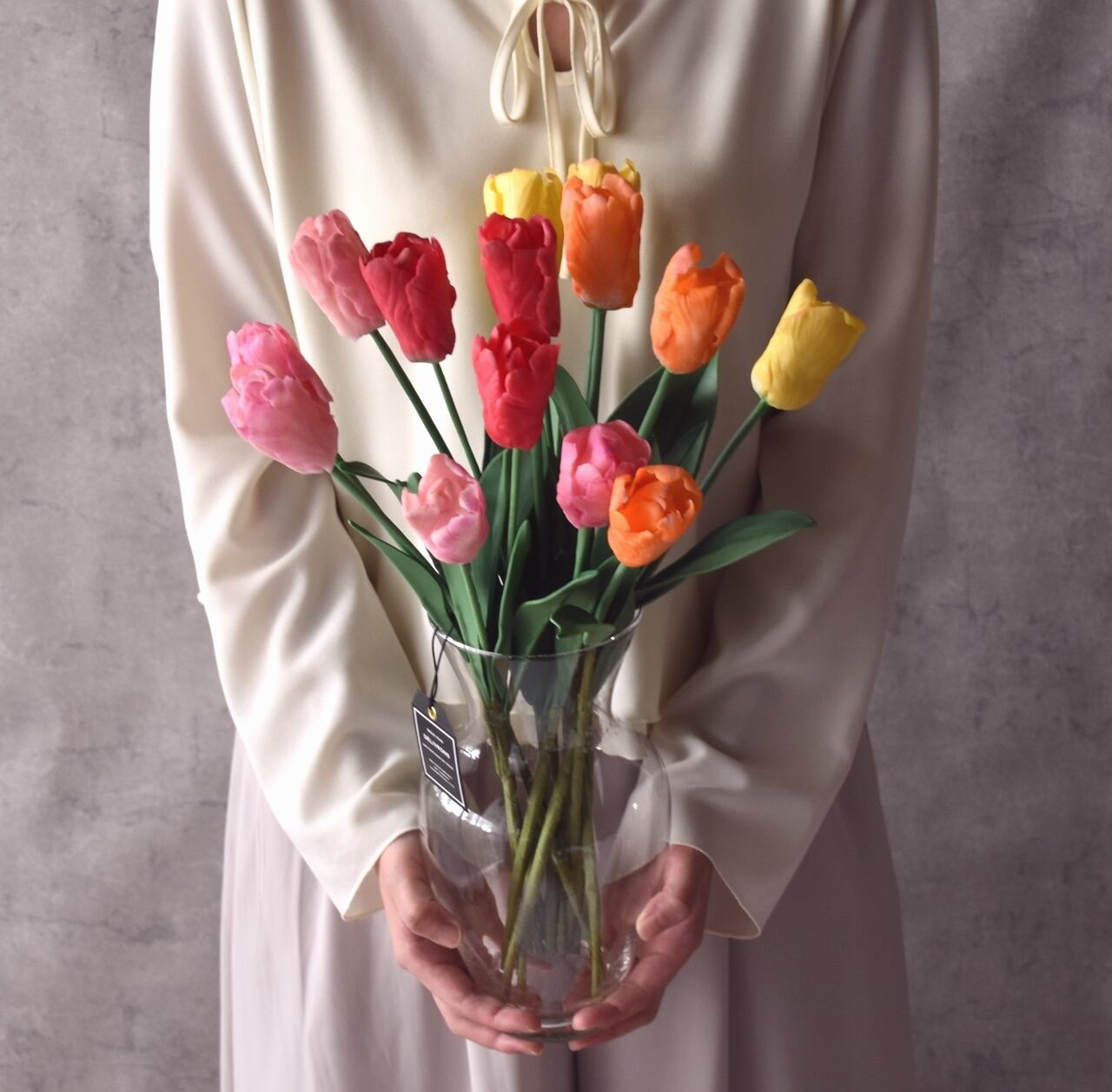 シンプルなデザインのフラワーベースはどんな空間にでも合わせていただきやすく、華やかなチューリップの魅力を引き立ててくれます。