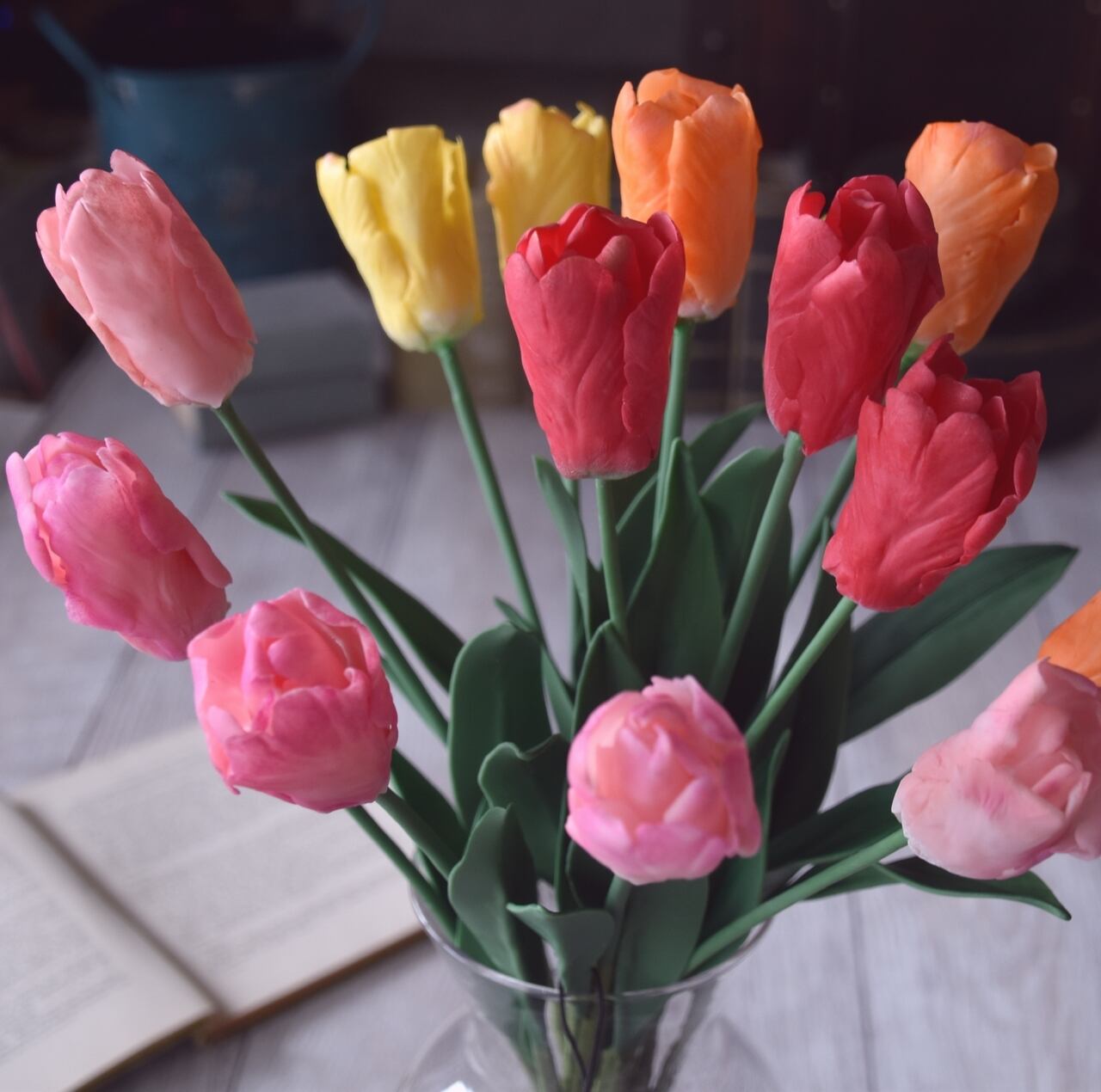 粘土でチューリップを制作し、エレガントなフラワーベースに生けました。