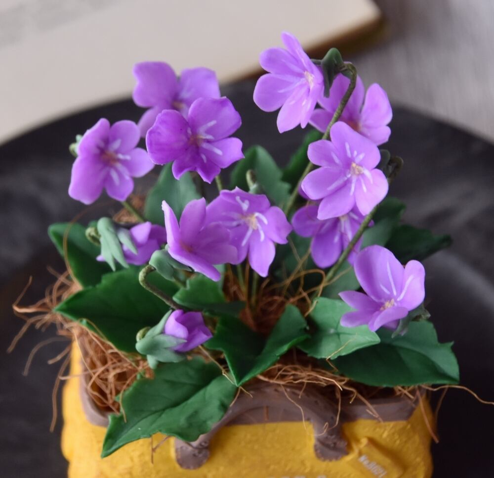 粘土でスミレをつくり、手のひらサイズのミニポットにスミレを植えました。