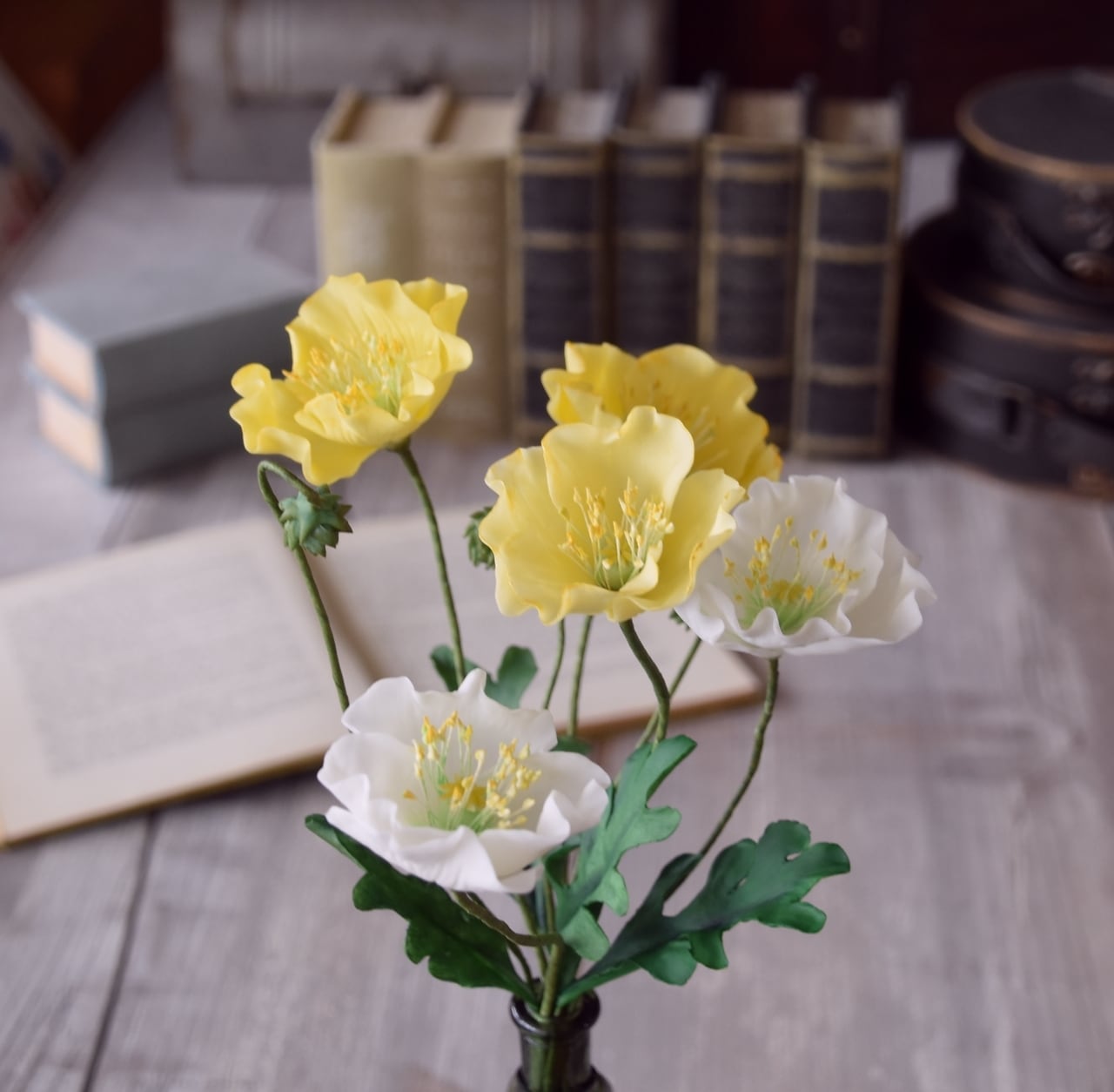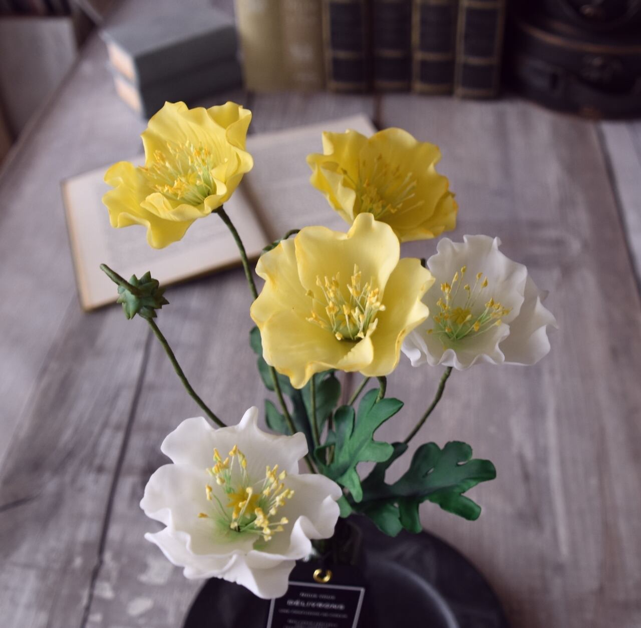 ポピーの柔らかく繊細な花びらを表現するために、粘土を薄く薄く伸ばし、フリルをたくさんつけました。