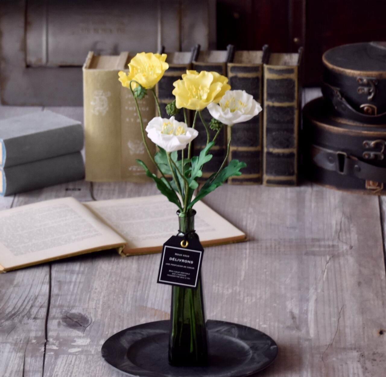 ◆粘土のお花◆ ポピー イエロー&ホワイト グリーンボトル S983