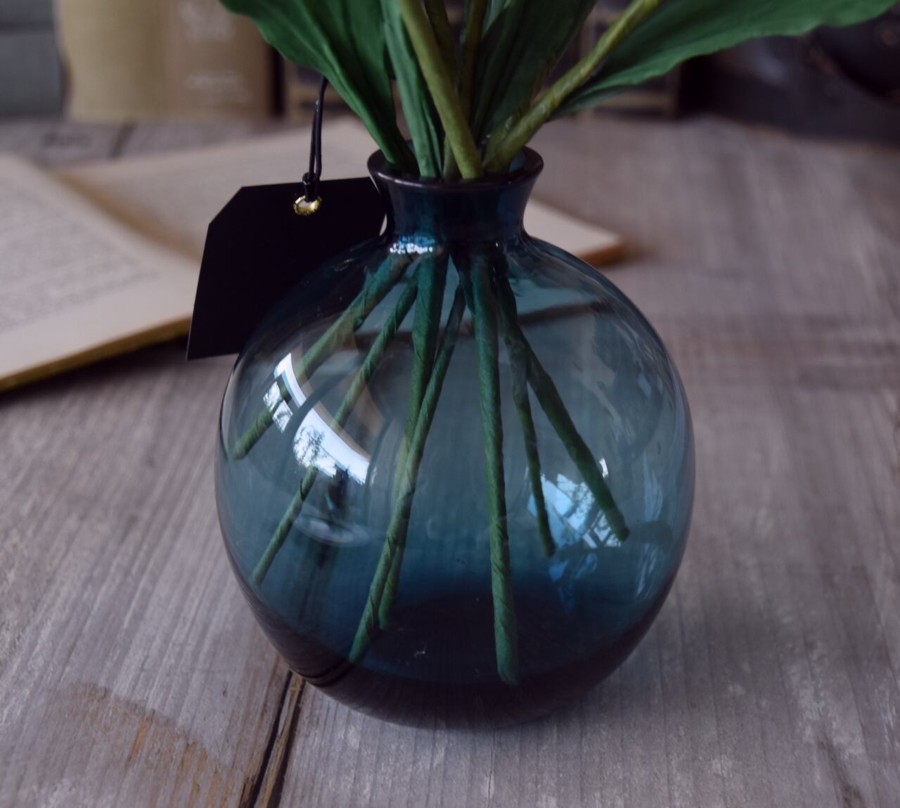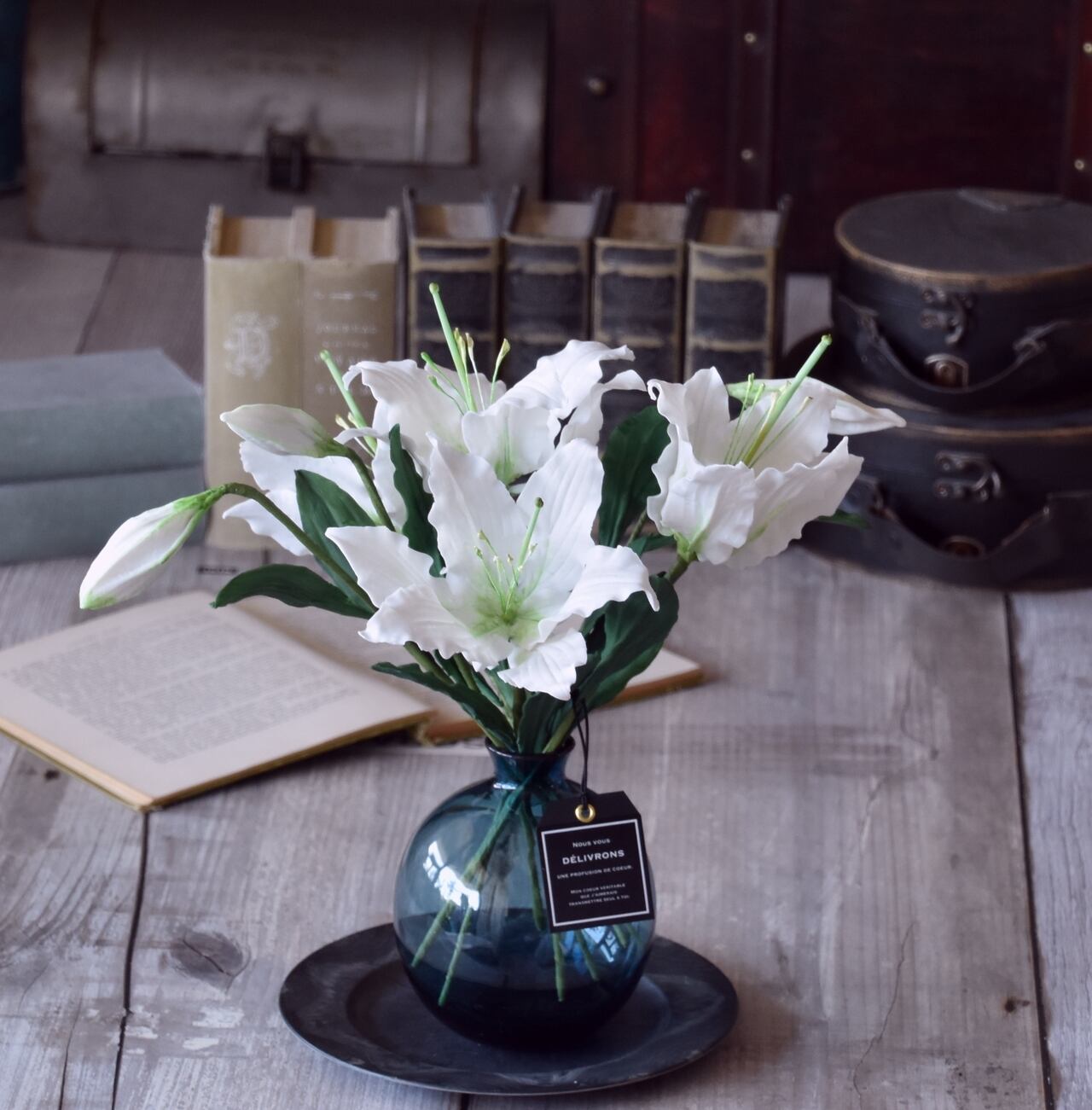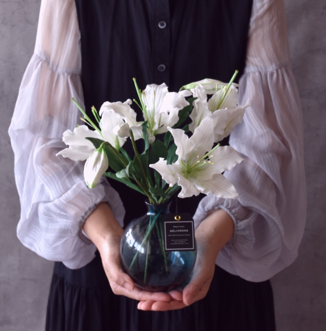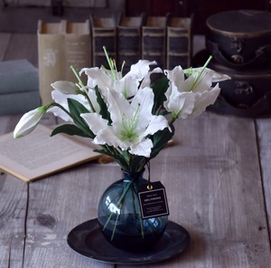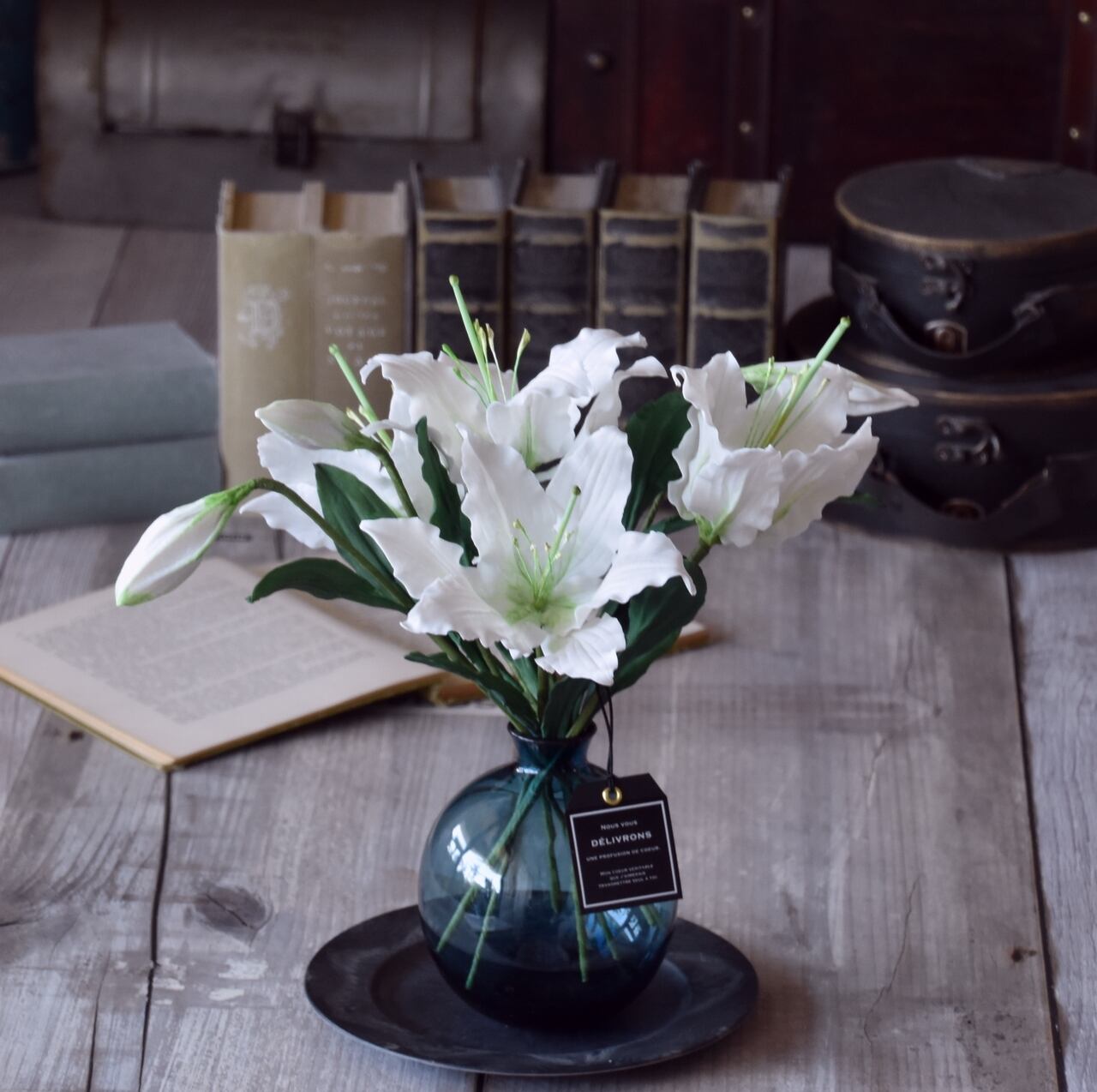 ボトルの濃いブルーが白いカサブランカを花姿を引き立ててくれます。