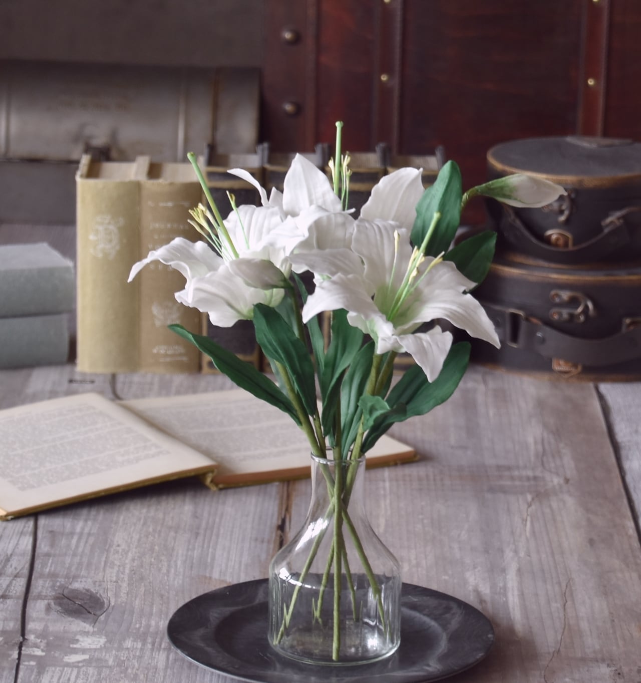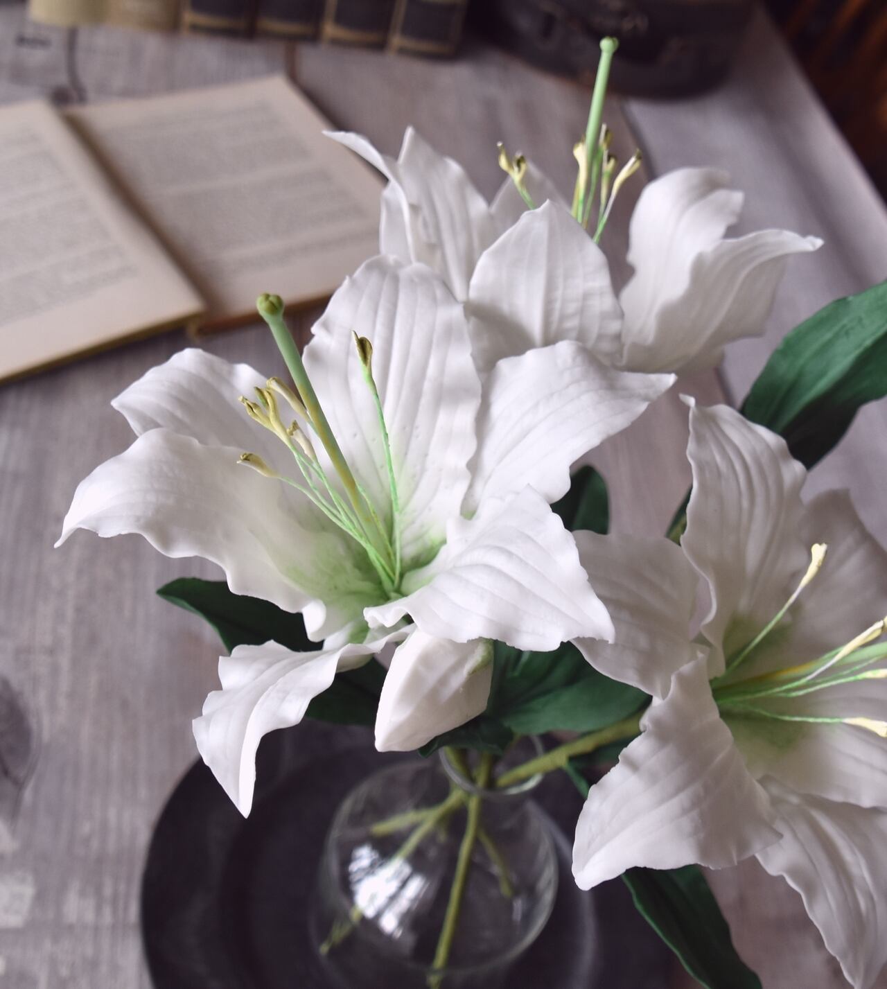 粘土でカサブランカ(ユリ)をつくり、シンプルなボトルにアレンジしました。
