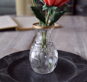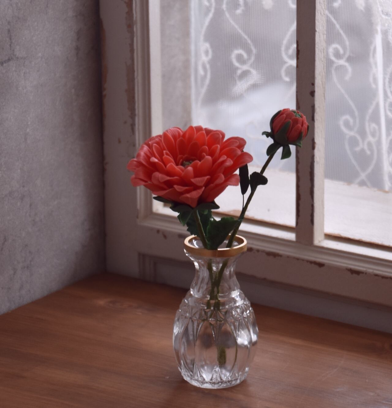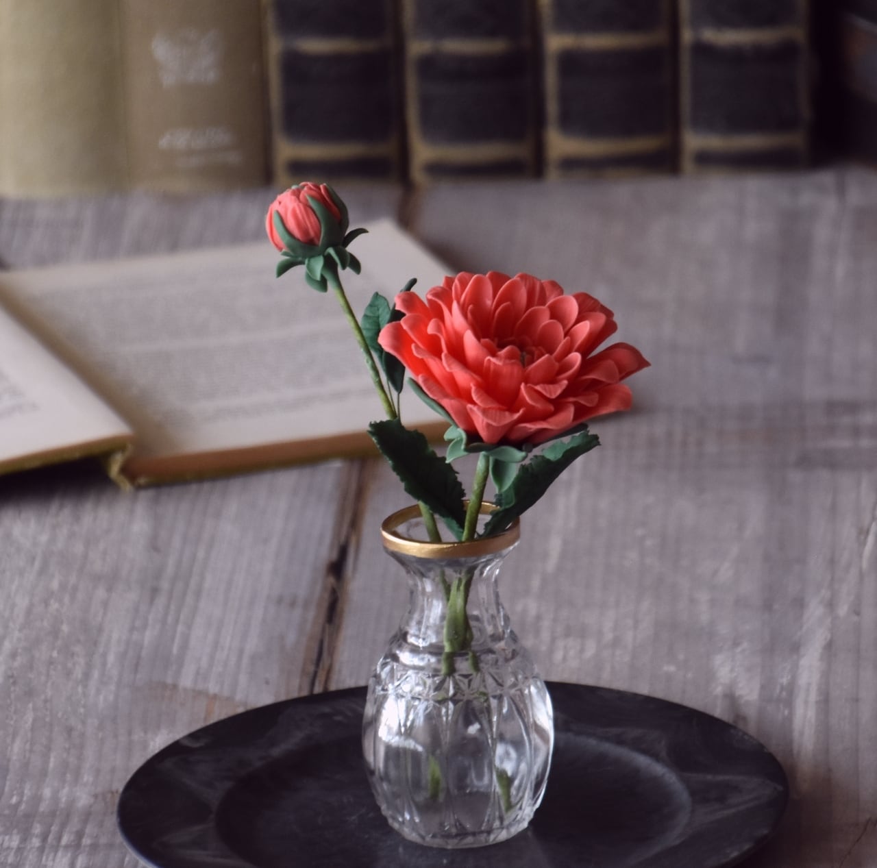 ダリアは色の種類だけでなく、花弁の形や咲き方も様々なものがありますが、八重咲きの豪華な花弁を一輪挿しサイズのフラワーベースに合うように制作しました。