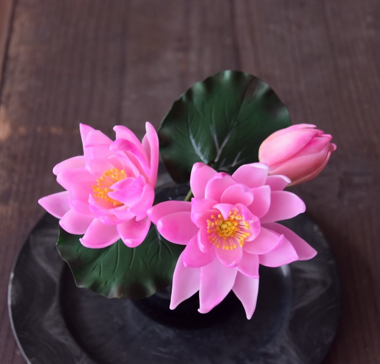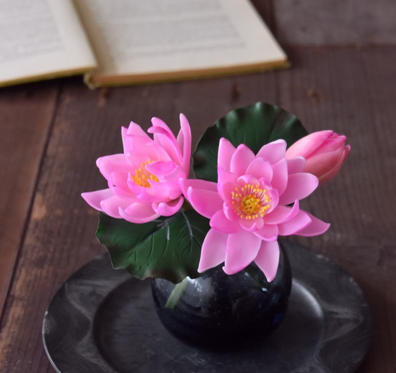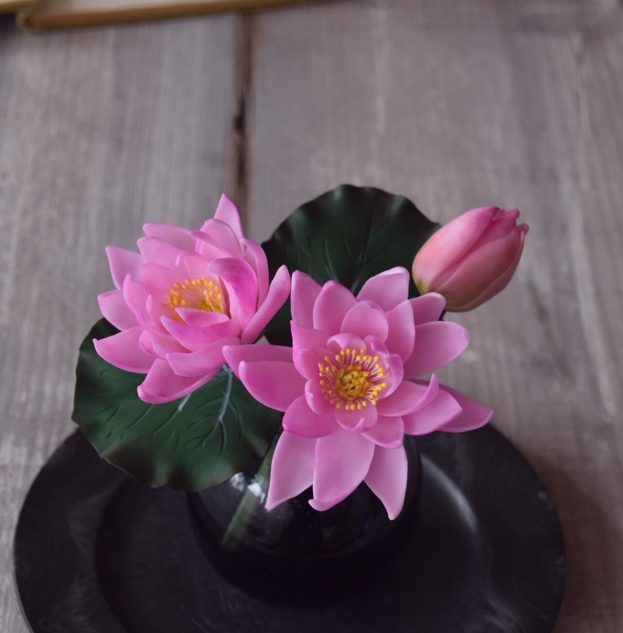 水面に浮かぶ睡蓮を水の心配がない粘土のお花で楽しんでください。