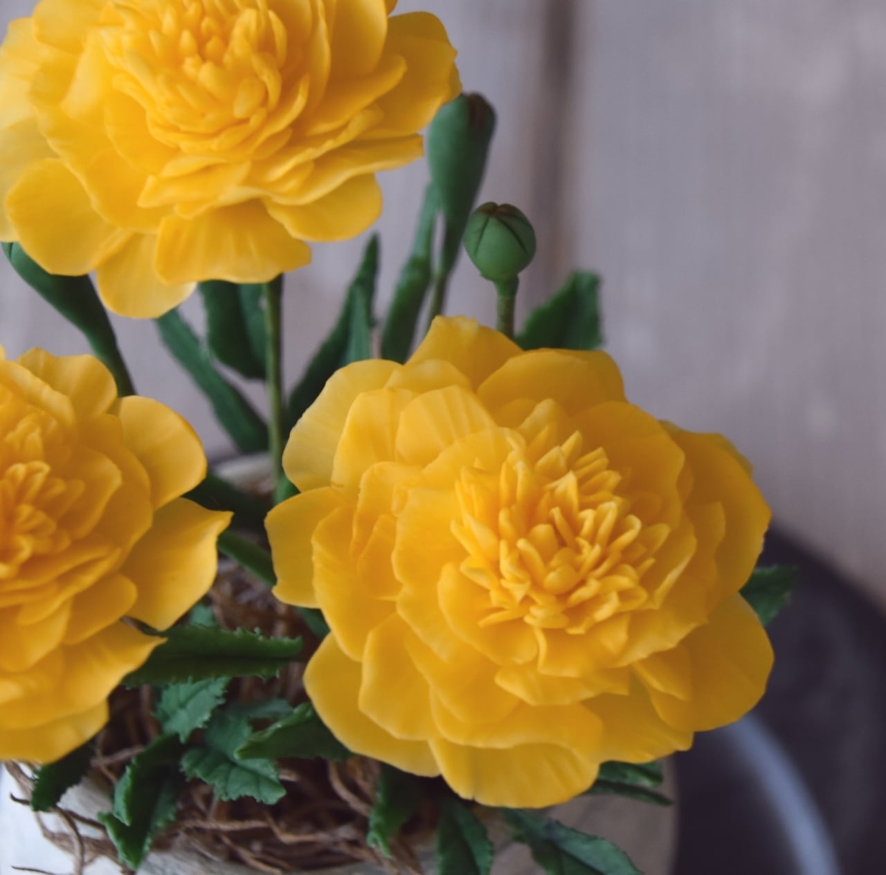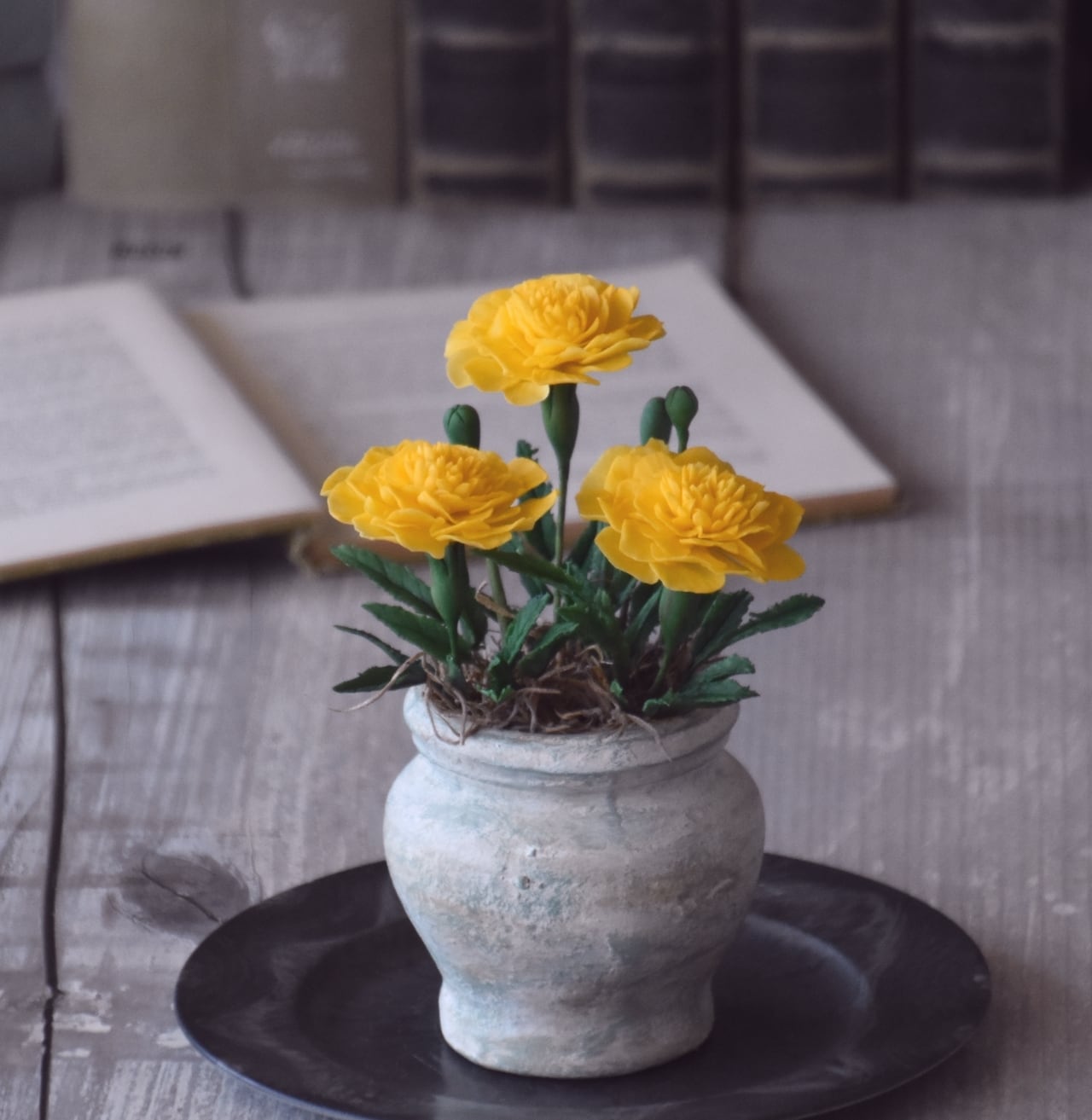 ●マリーゴールドは花びらを一つ一つ最高級彫塑用ネンドで手作りしています。