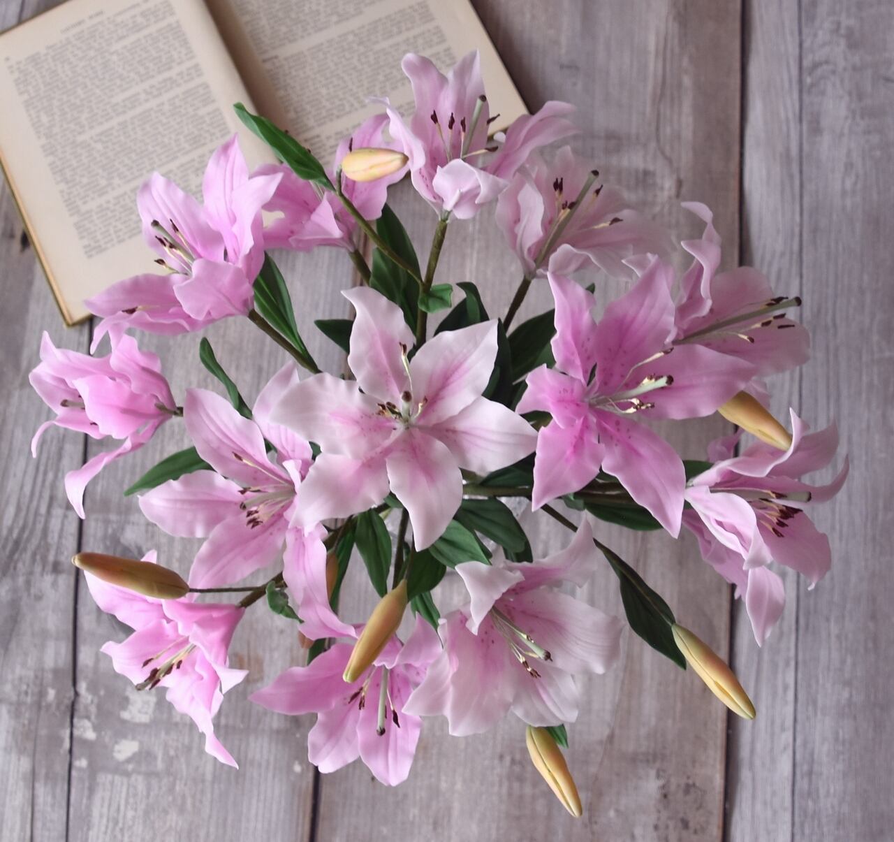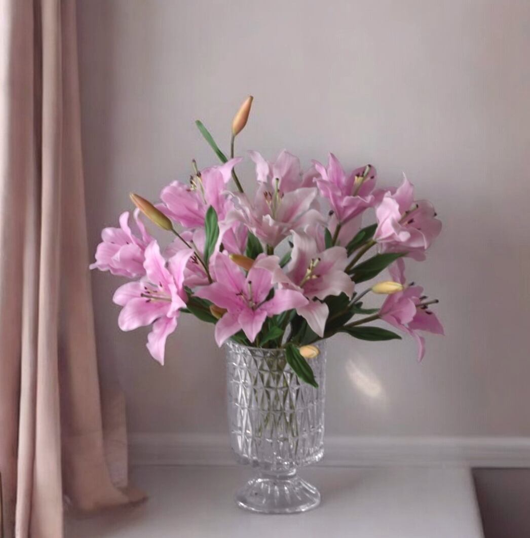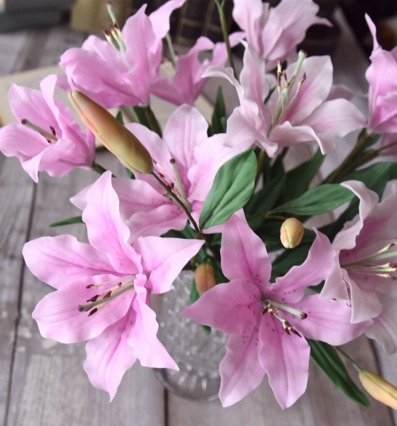 花びら一枚一枚を薄く薄く伸ばしてより本物のユリに近づくように作り、おしやれなゴブレットフラワーベースに飾りました。