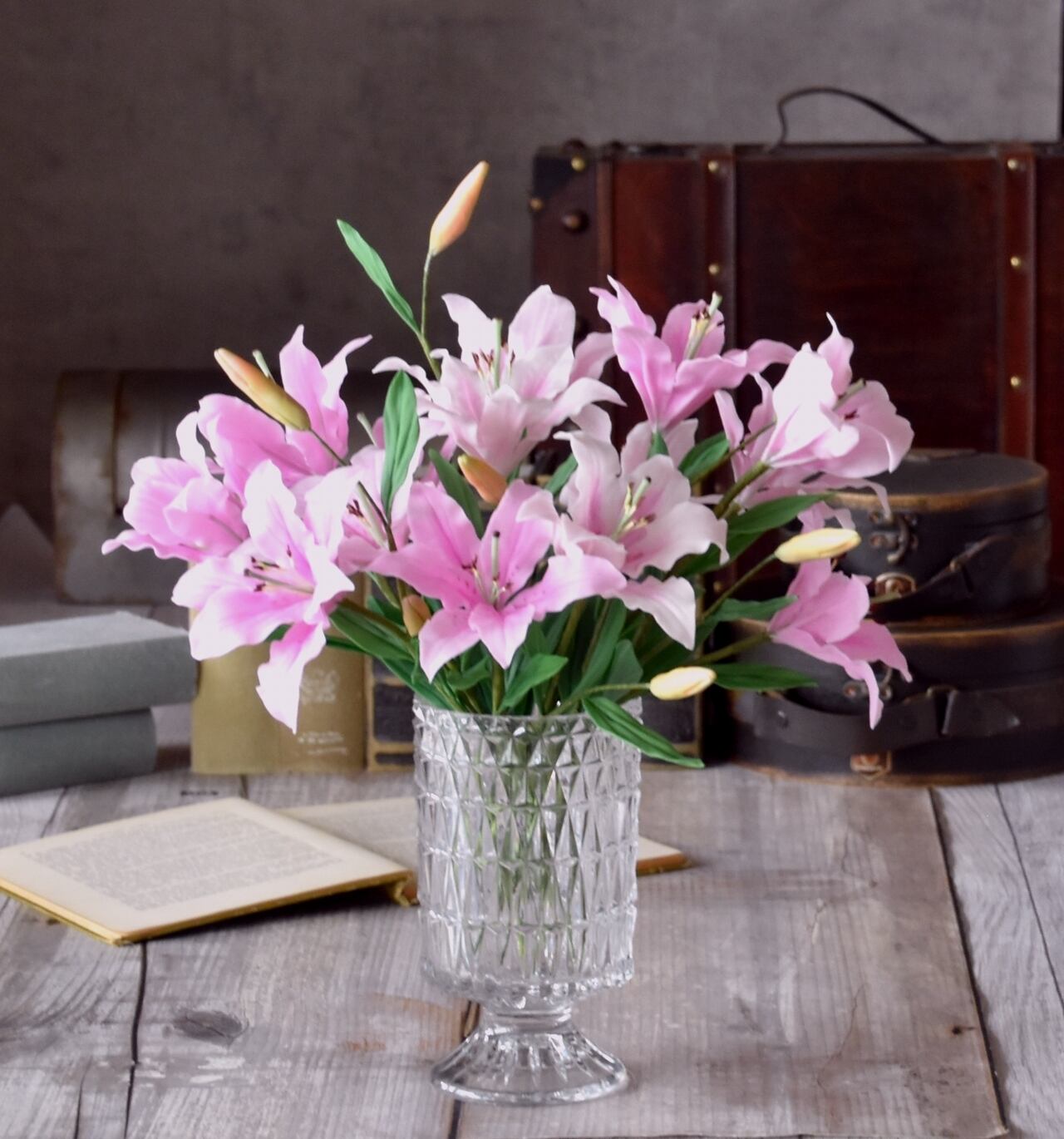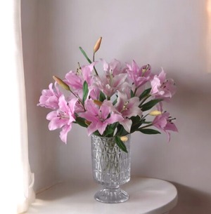 エレガントで上品なガラスカットのフラワーベースで、淡いピンク色の花びらの可愛らしさを引き立ててくれます。