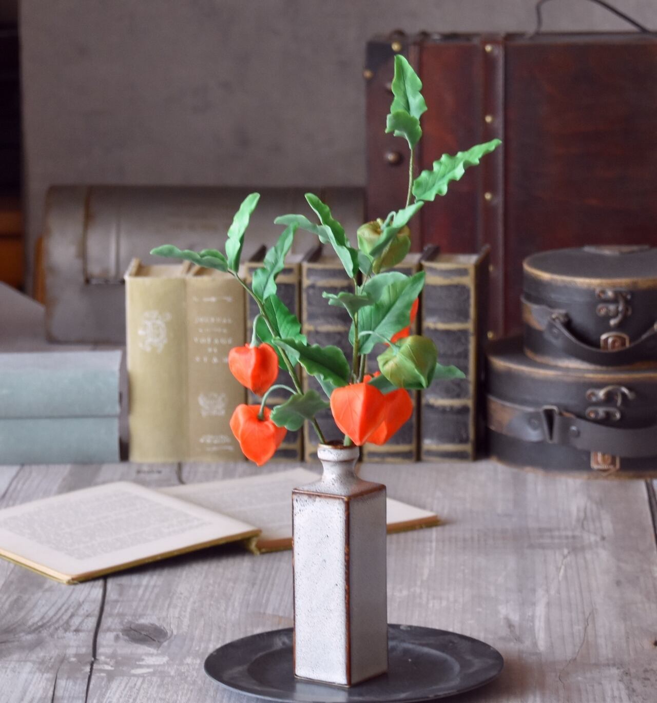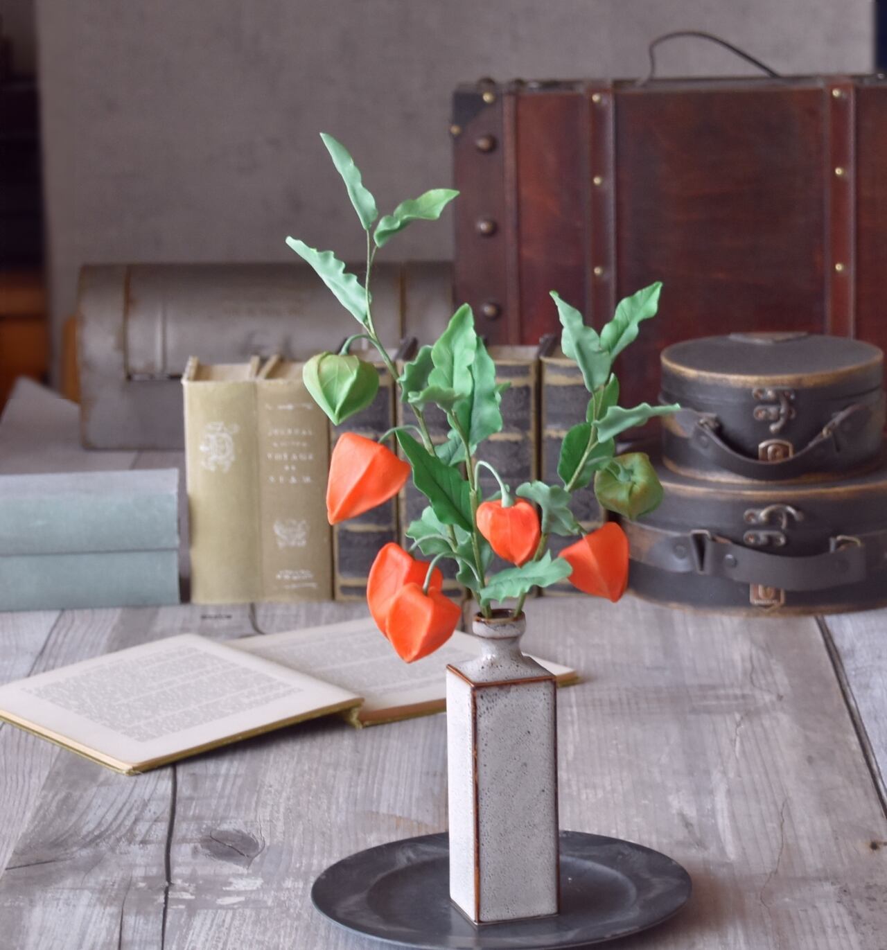 粘土でホオズキ(鬼灯)をつくり、和モダンでシンプルなデザインの波佐見焼(はさみやき)の花瓶にアレンジしました。