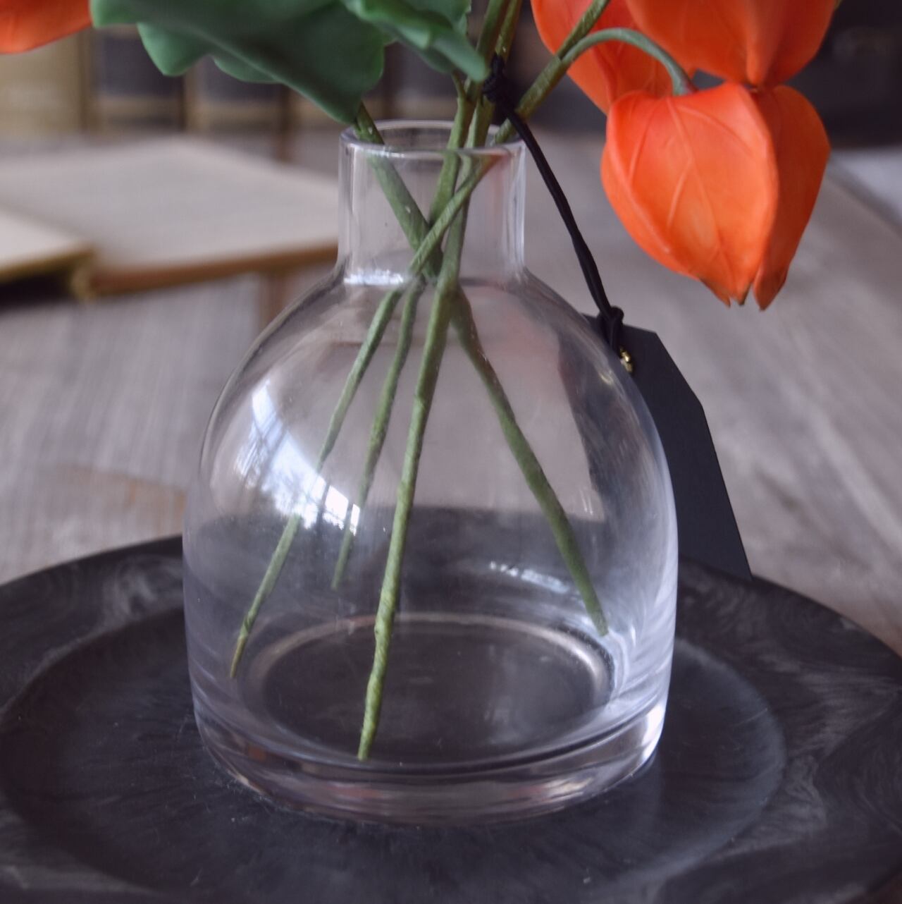 粘土でホオズキをつくり、ぽってりした形が魅力のシンプルなガラスベースに生けました。