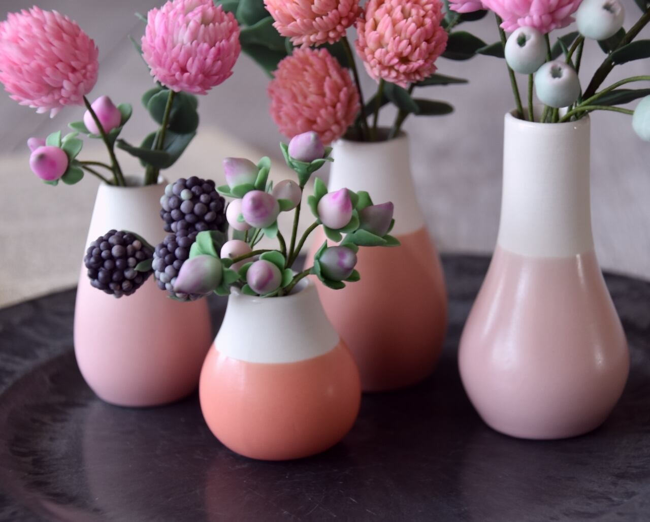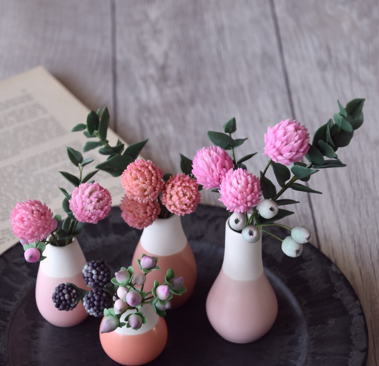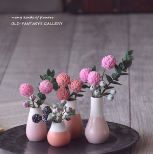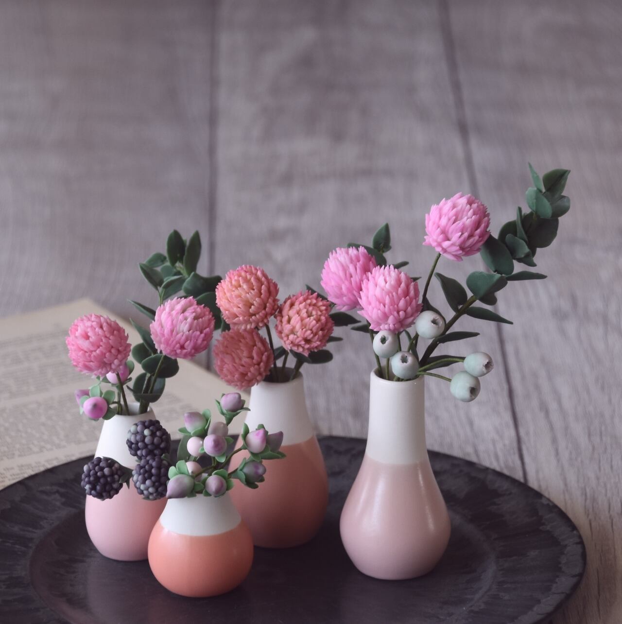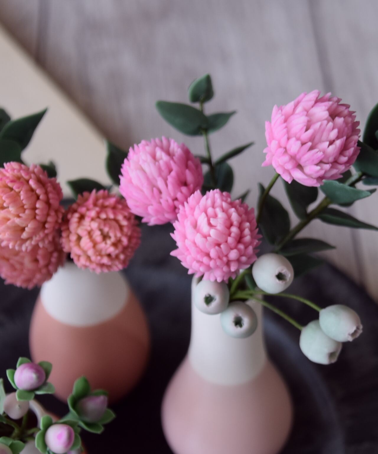 粘土で千日紅を小花やユーカリ実物の植物をつくり、2トーンのフラワーベース4個に生けました。