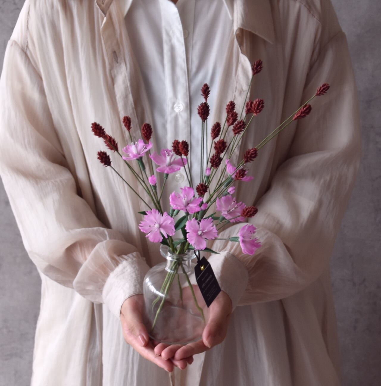 ナデシコは花びらを一枚一枚薄く伸ばし、ピンクの優しげな花に、吾亦紅は夏から秋に移り変わる季節をより感じていただけるように暗紅色で仕上げました。