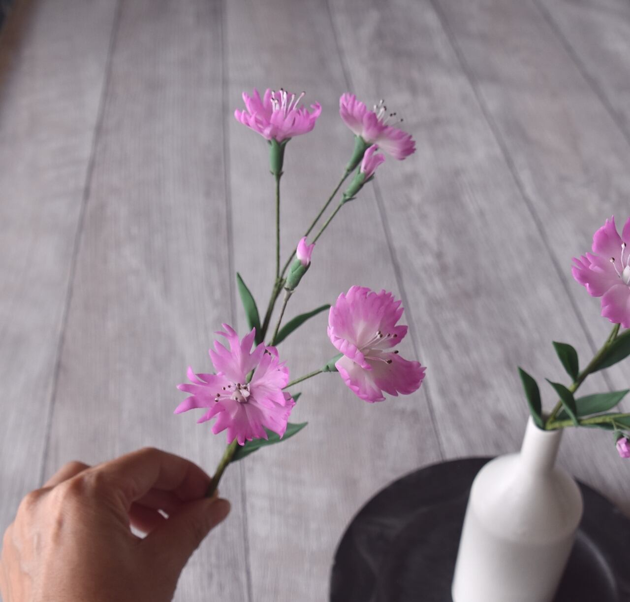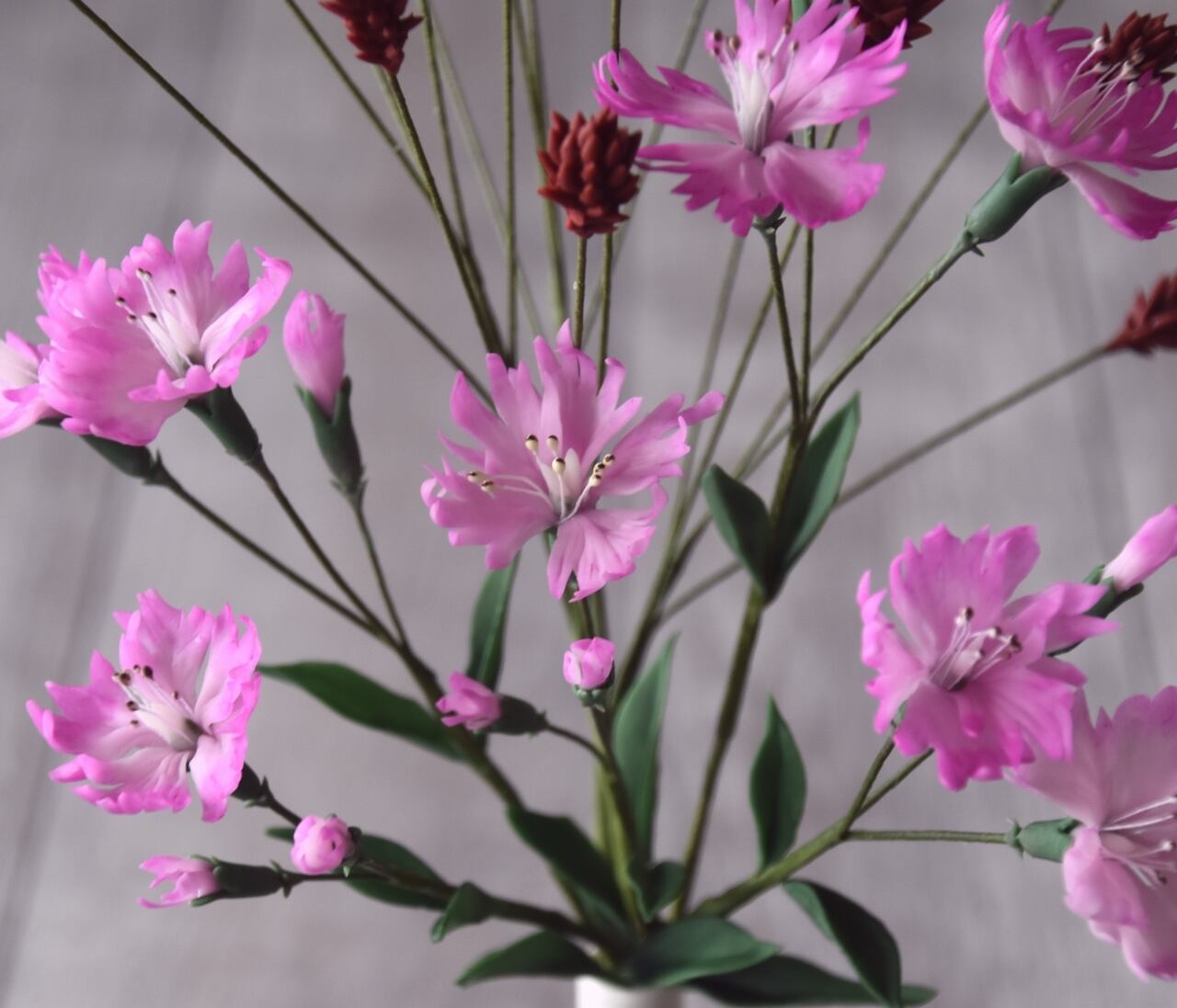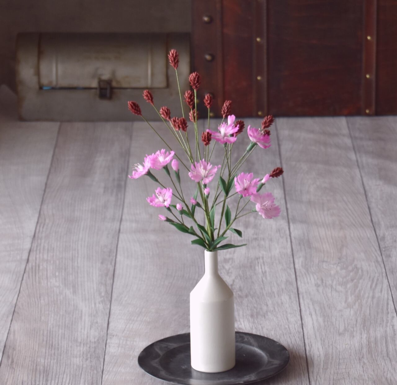 ナデシコは花びらを一枚一枚薄く伸ばし、ピンクの優しげな花に、吾亦紅は夏から秋に移り変わる季節をより感じていただけるように暗紅色で仕上げました。