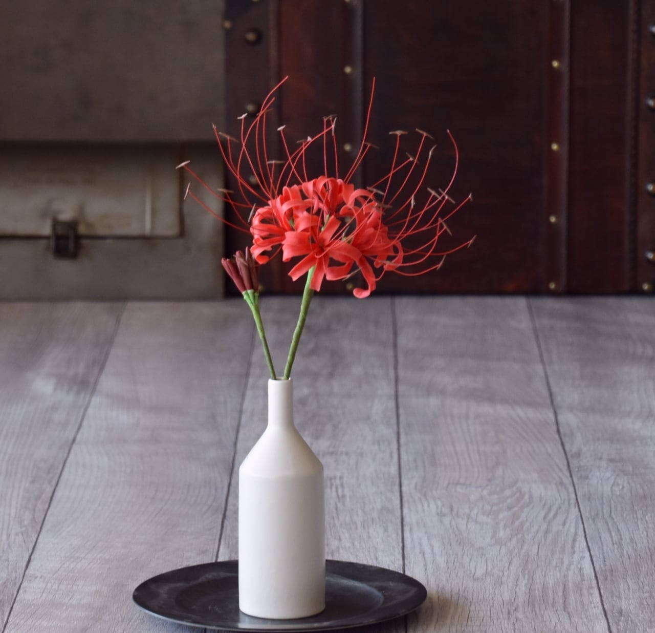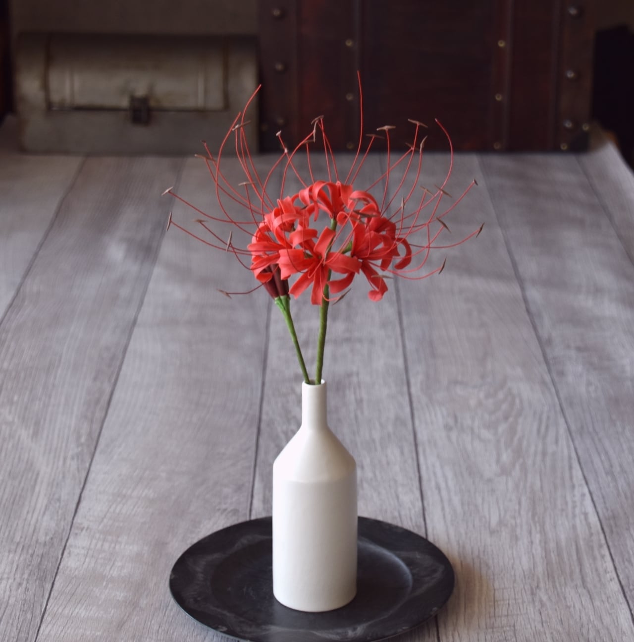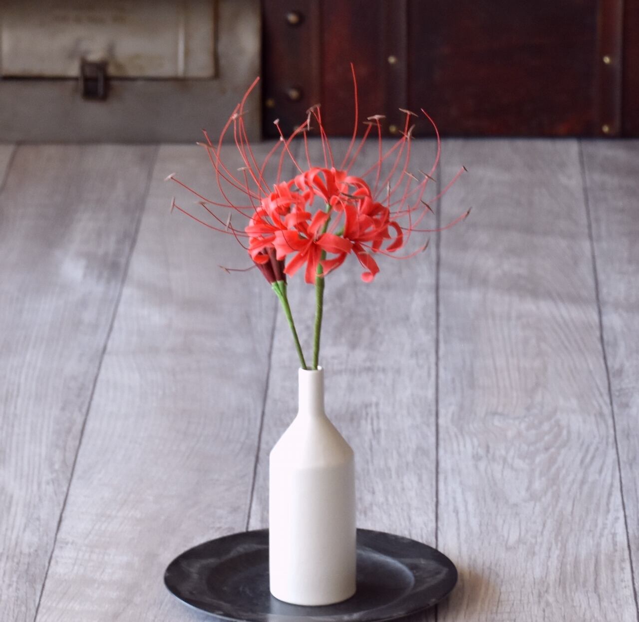 粘土で彼岸花をつくり、和モダンでシンプルなデザインの波佐見焼(はさみやき)の花瓶に生けました。