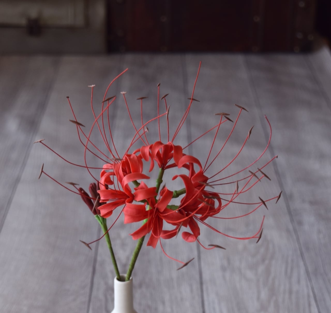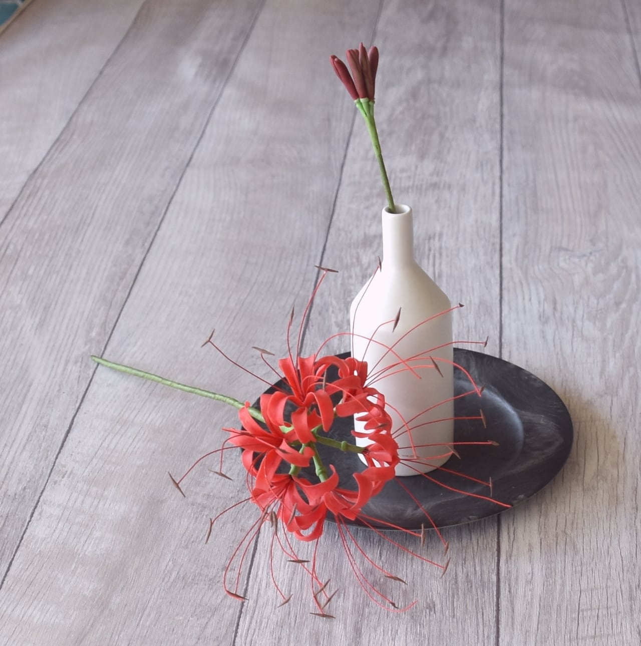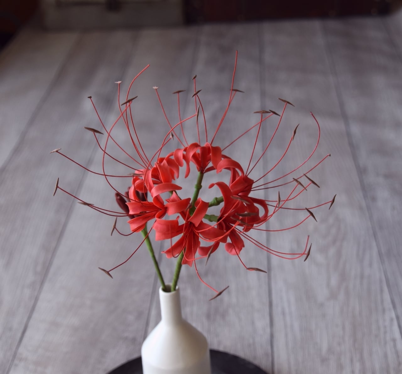粘土で彼岸花をつくり、和モダンでシンプルなデザインの波佐見焼(はさみやき)の花瓶に生けました。