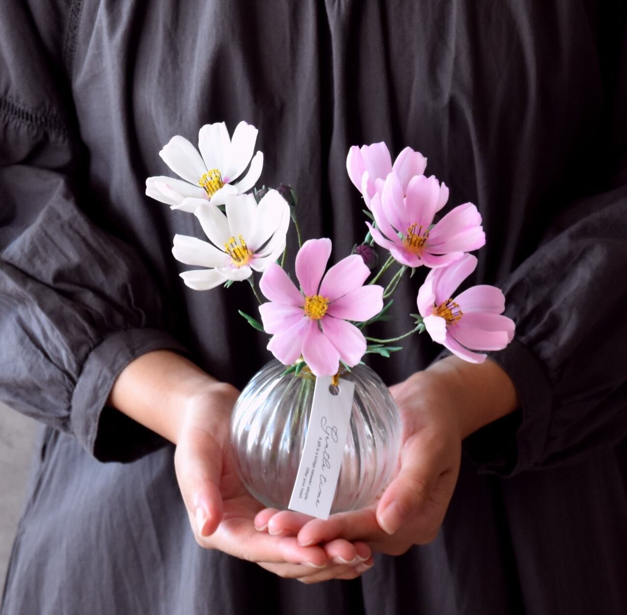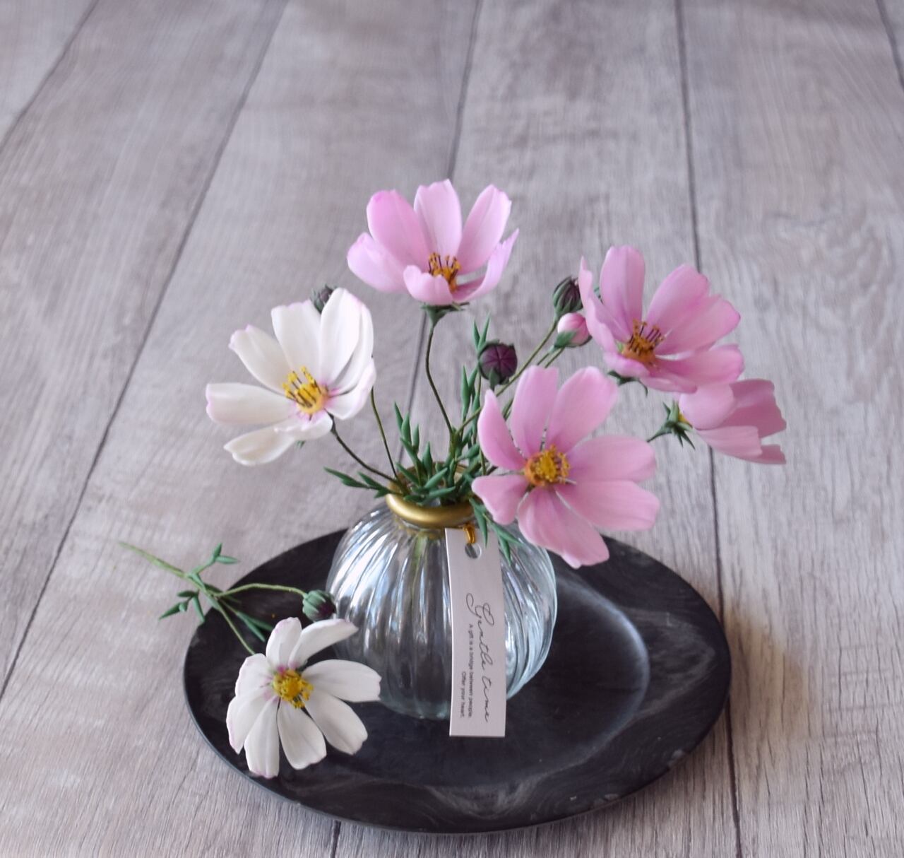粘土でコスモスを作り、可愛いガラスボトルに飾りました。