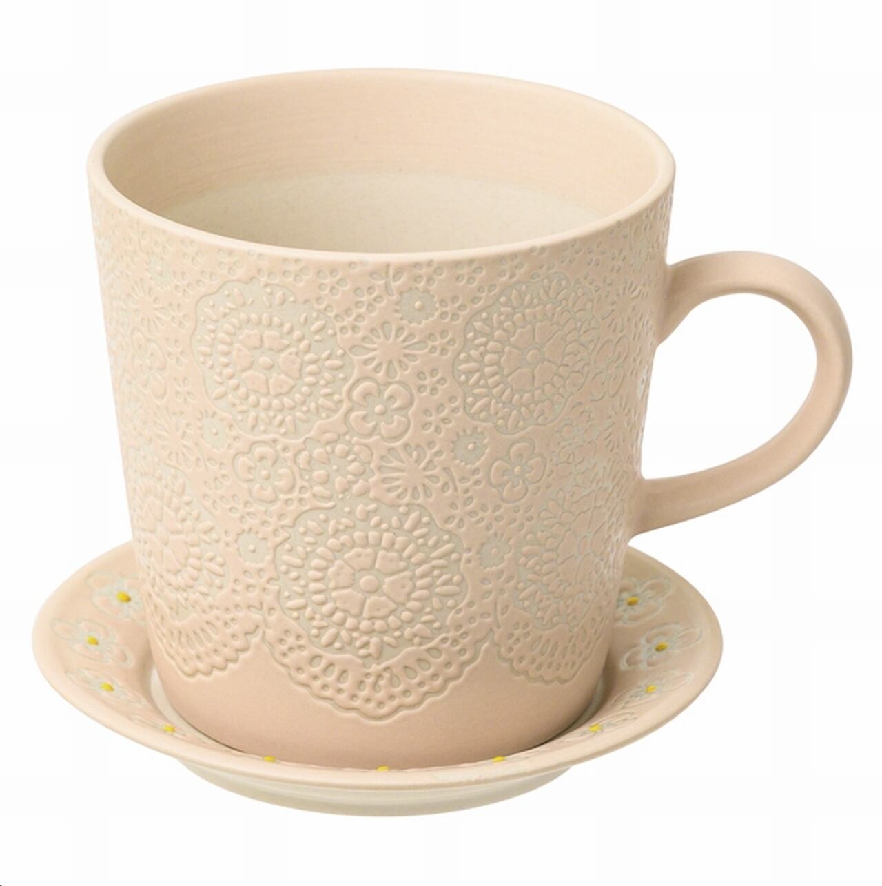 フラワーポット(カップ&ソーサー型ポット)はベージュにエンボス加工の可愛いレース柄です。