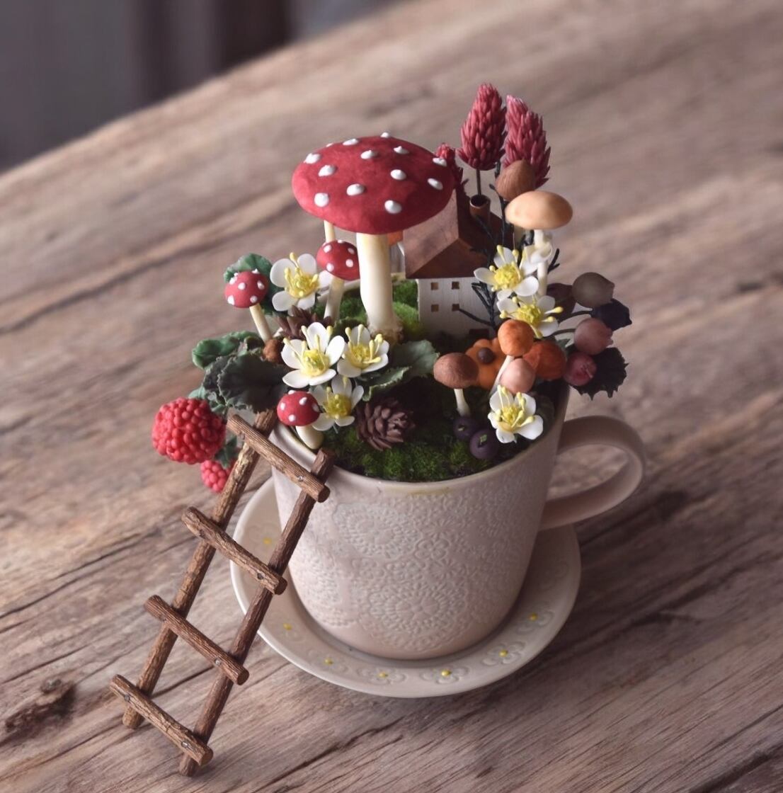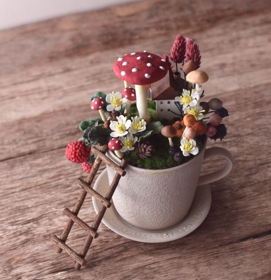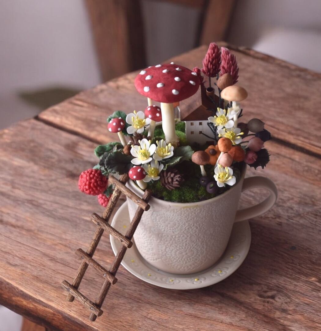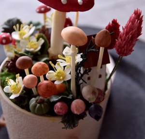 小さなキノコたちをアレンジしていくと、気が付けばとってもメルヘンな世界が出来上がりました。