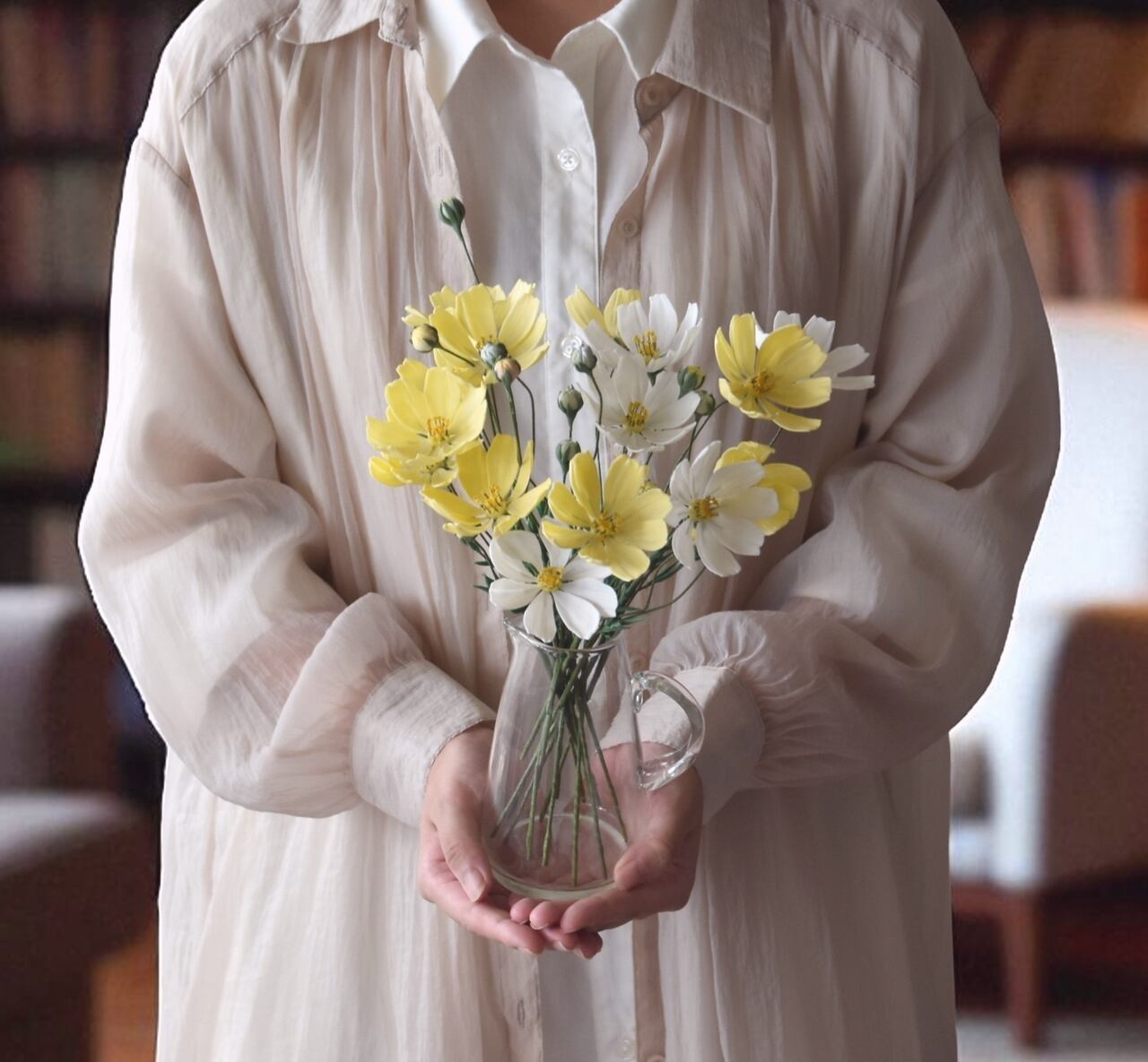 コスモスの花びらは、一枚一枚、粘土を丁寧に薄く伸ばして成形しました。風に揺れるようなやわらかなシルエットが、秋にぴったりの爽やかなアレンジに仕上がっています。