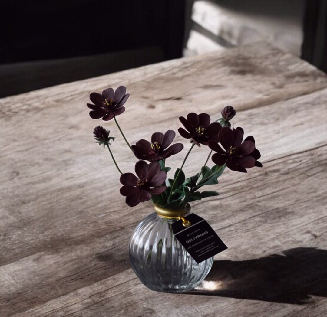 少し小ぶりで可愛い花弁のチョコレートコスモスをまるいコロンとしたを可愛いガラスボトル(クリアーボトル)に飾りました。