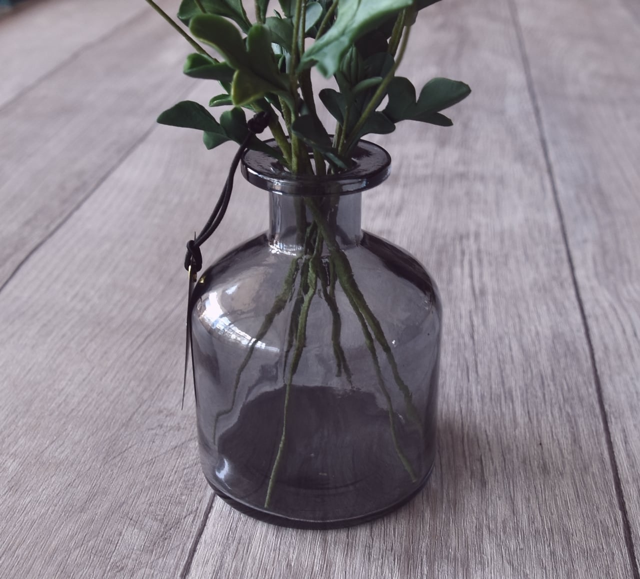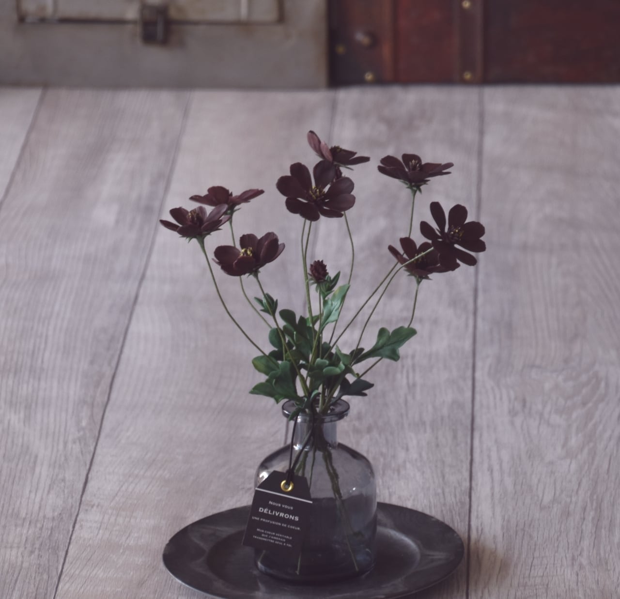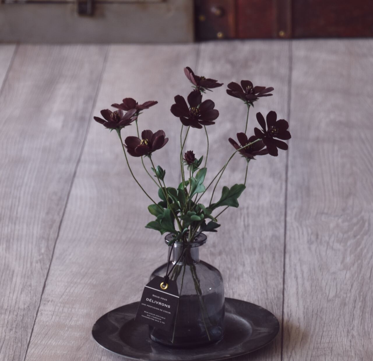 少し小ぶりで可愛い花弁のチョコレートコスモスをガラスボトル(ブラックボトル)に飾りました。