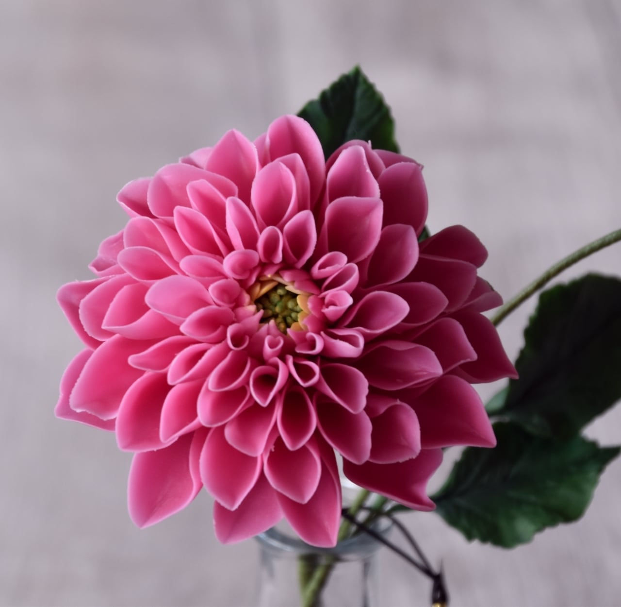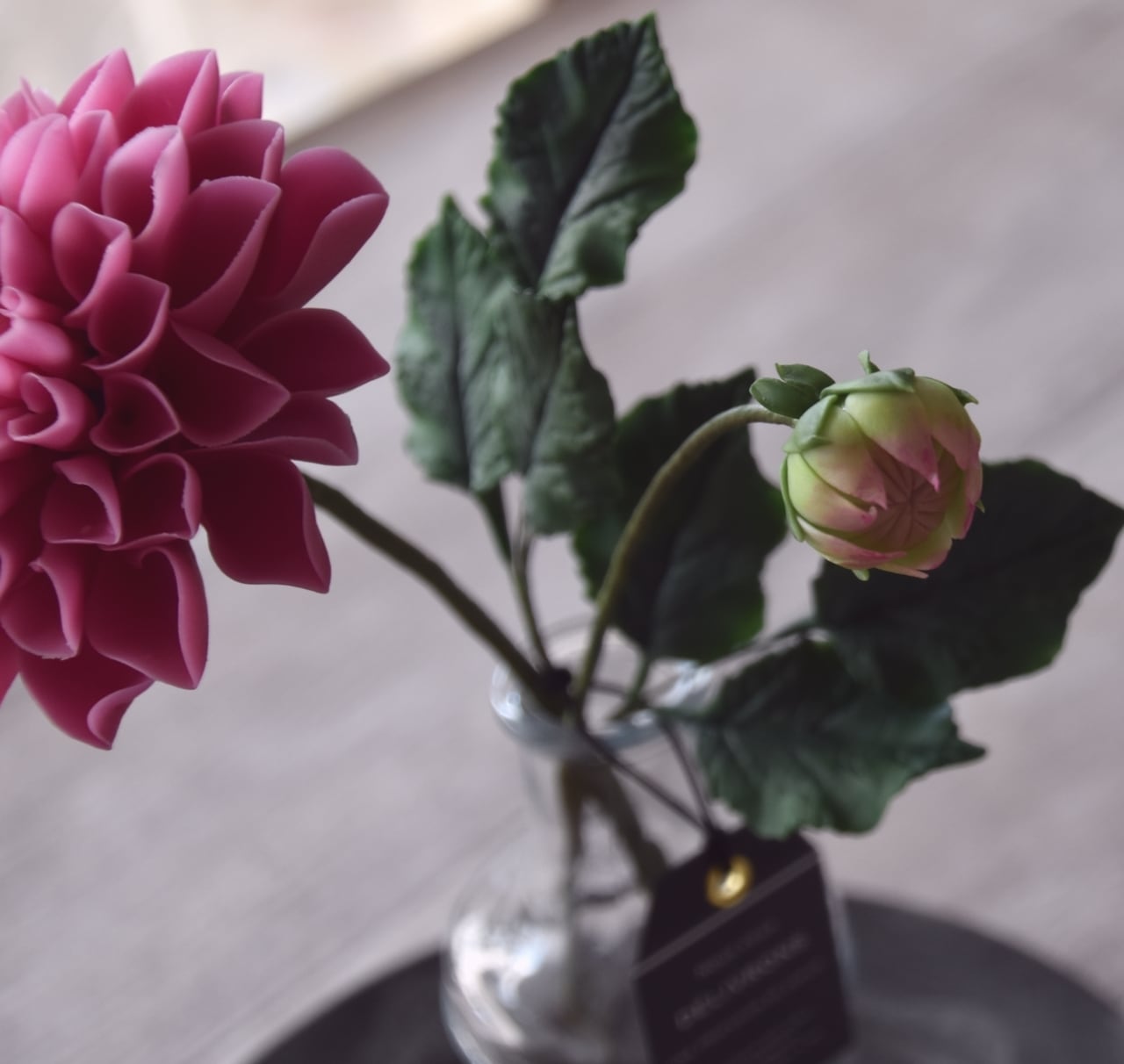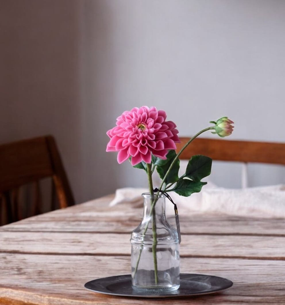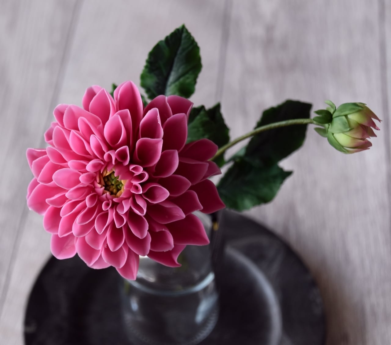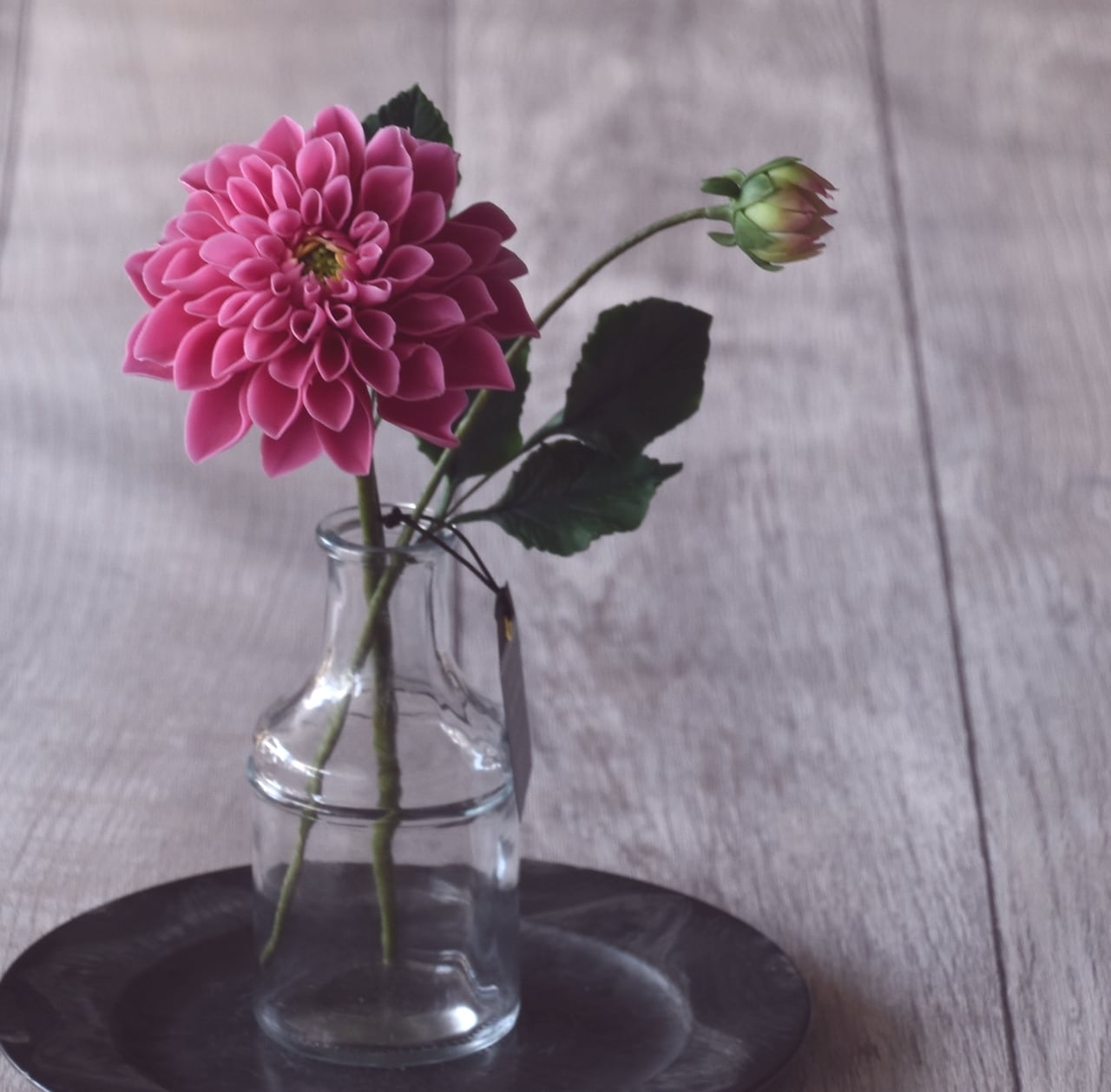 粘土でダリアをつくり、シンプルなデザイン花瓶に生けました。