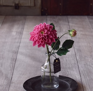 一輪挿しのフラワーベースはガラス製のシンプルなデザインで、ボリュームのあるダリアの可愛らしさを引き立ててくれます。