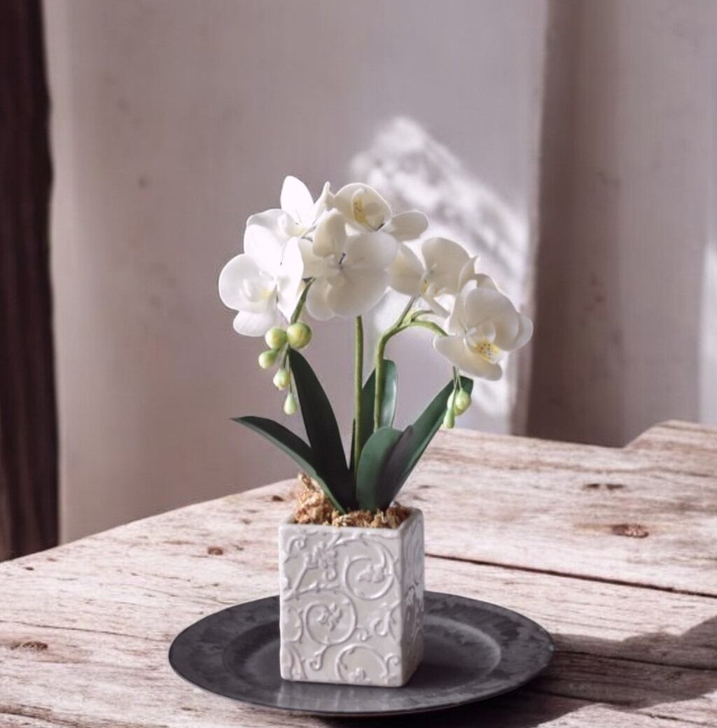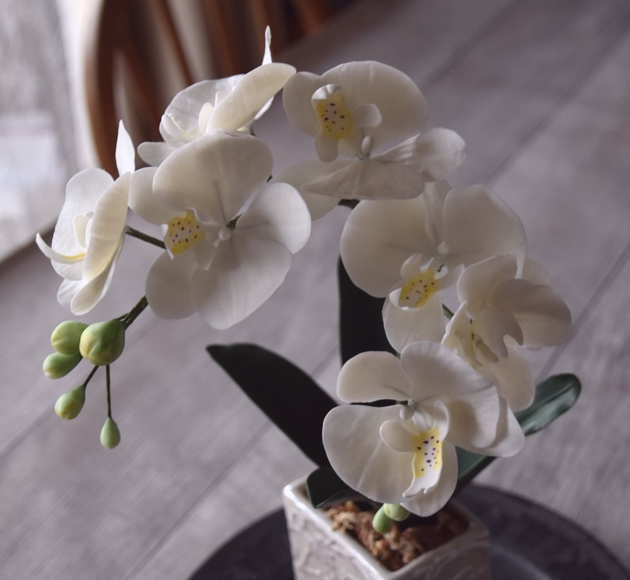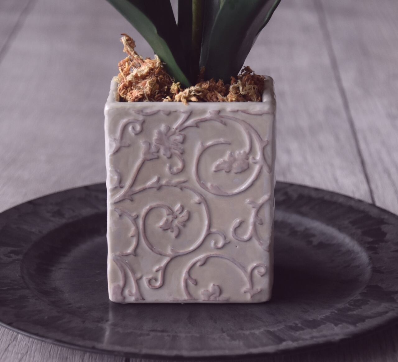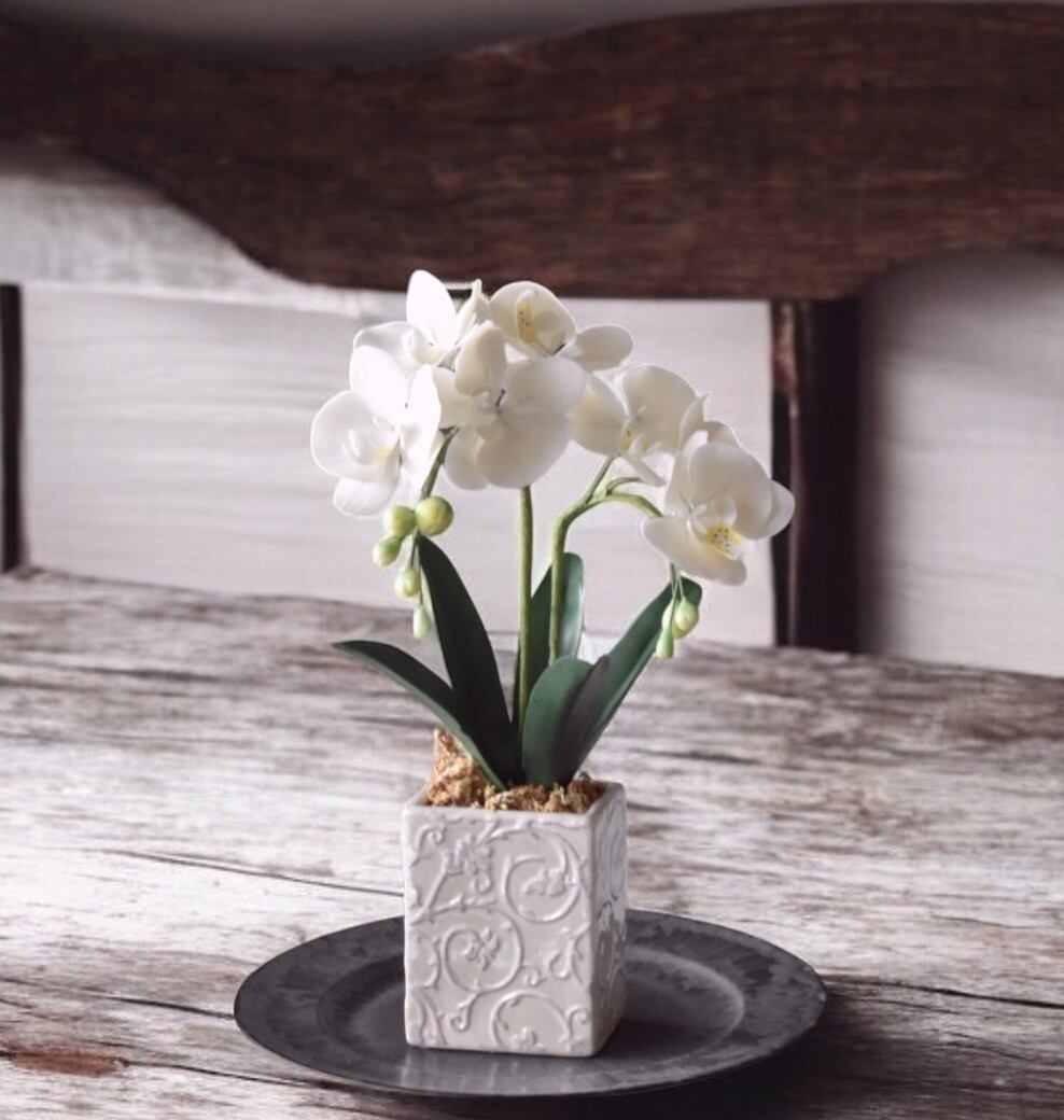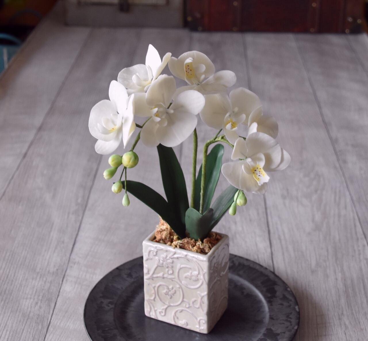 粘土でミニ胡蝶蘭をつくり、エレガントなデザインのフラワーベースに植え込みました。