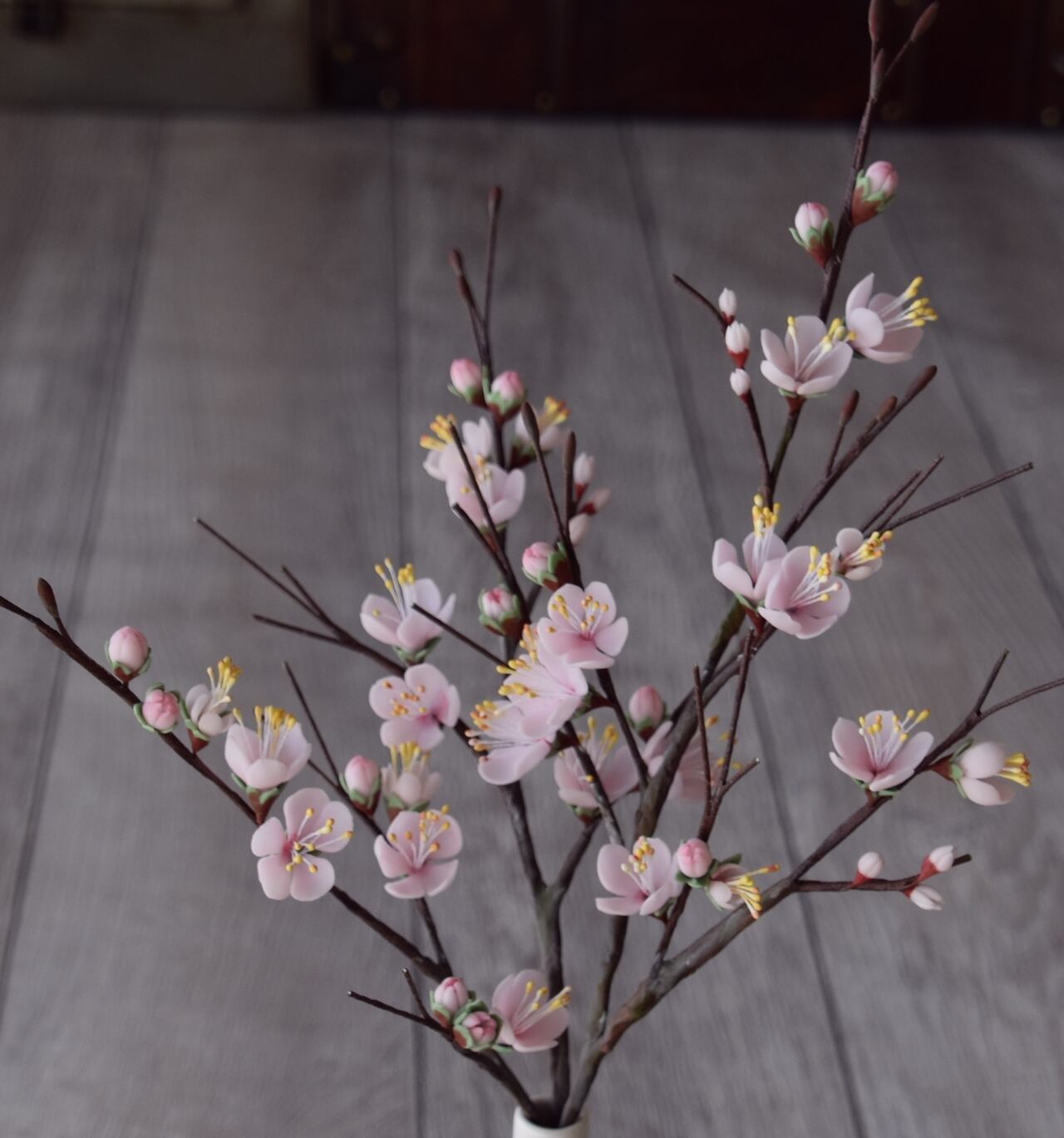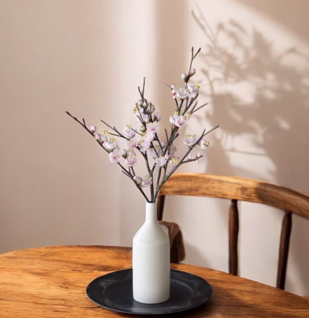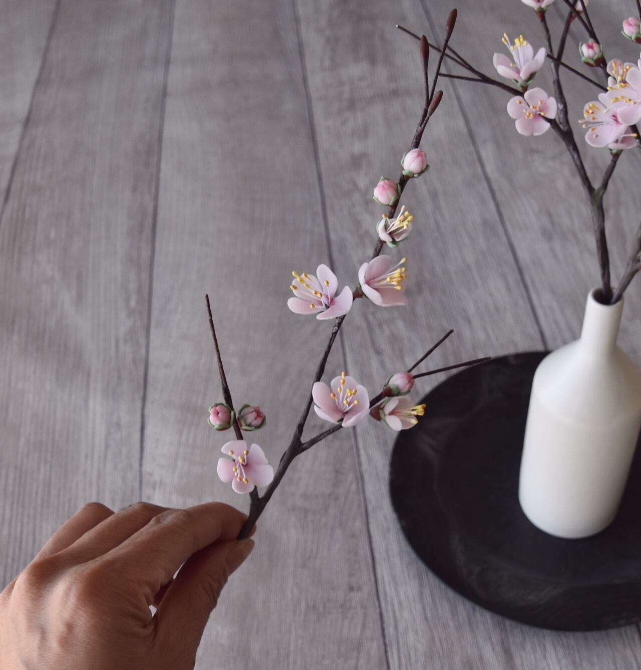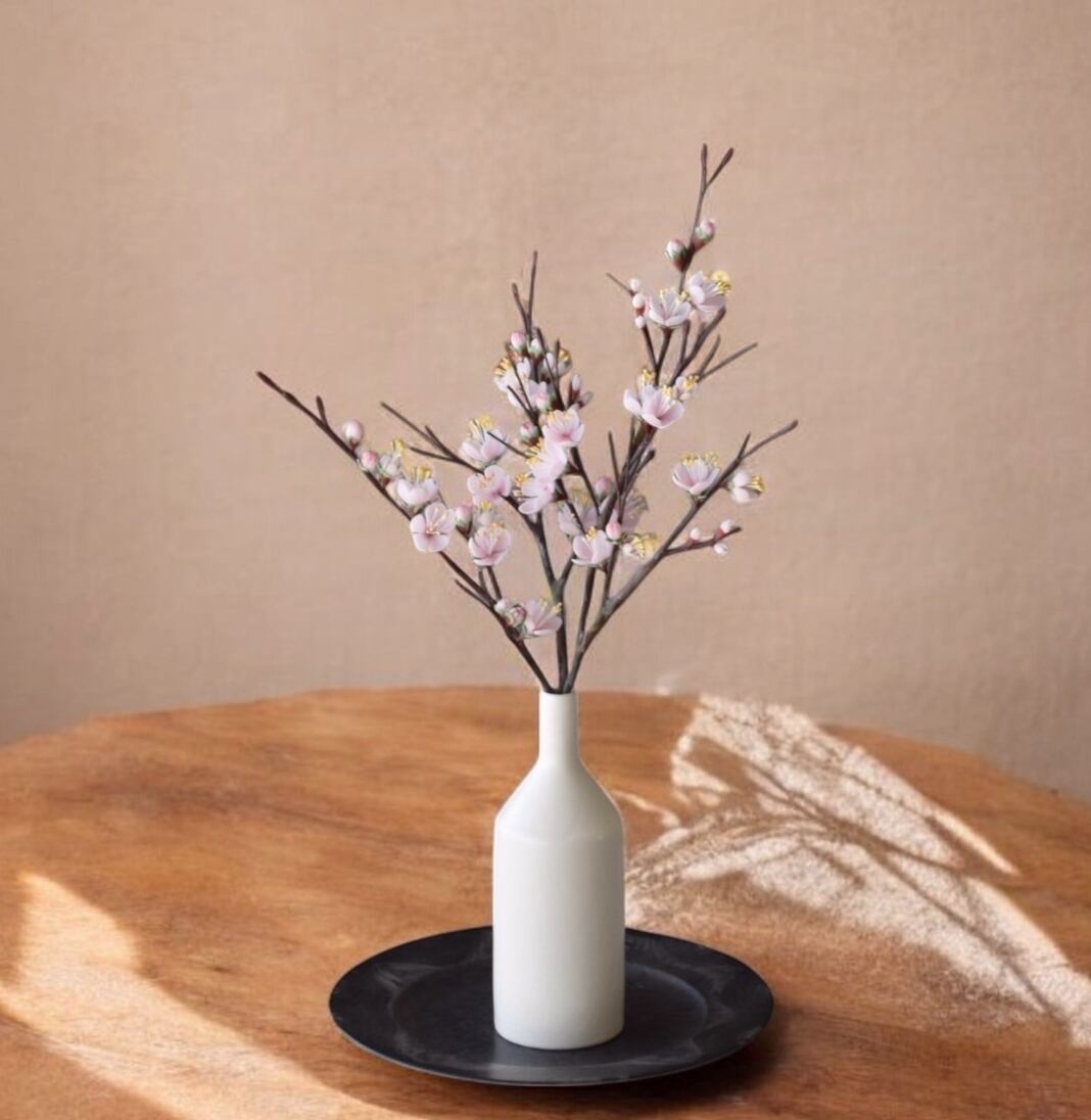 粘土で梅をつくり、和モダンでシンプルなデザインの波佐見焼(はさみやき)の花瓶に生けました。
