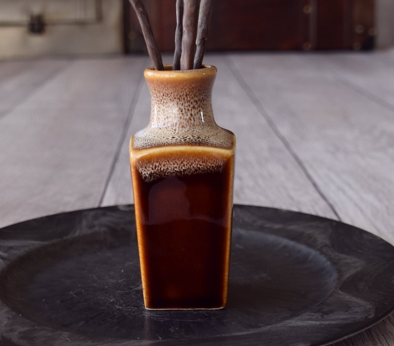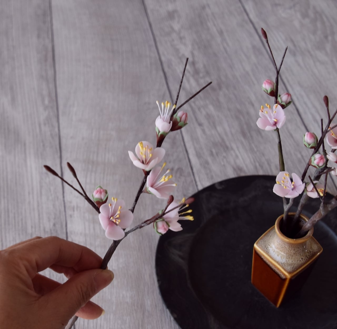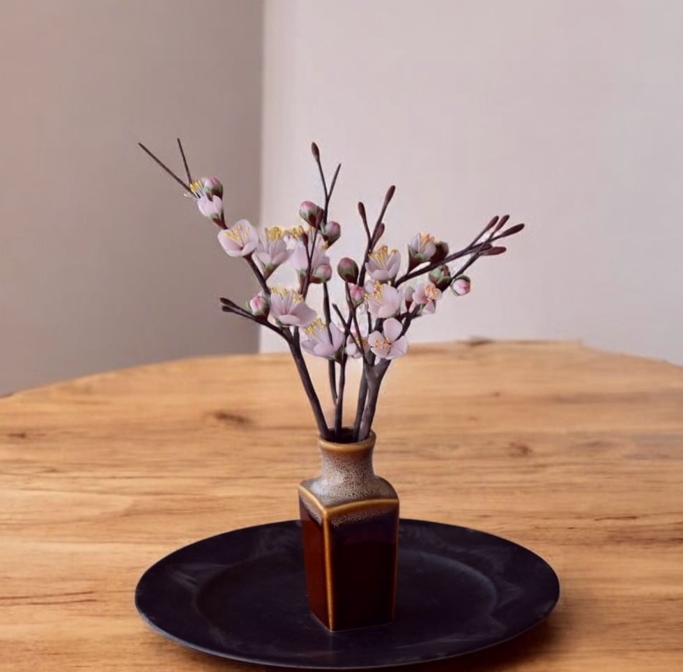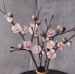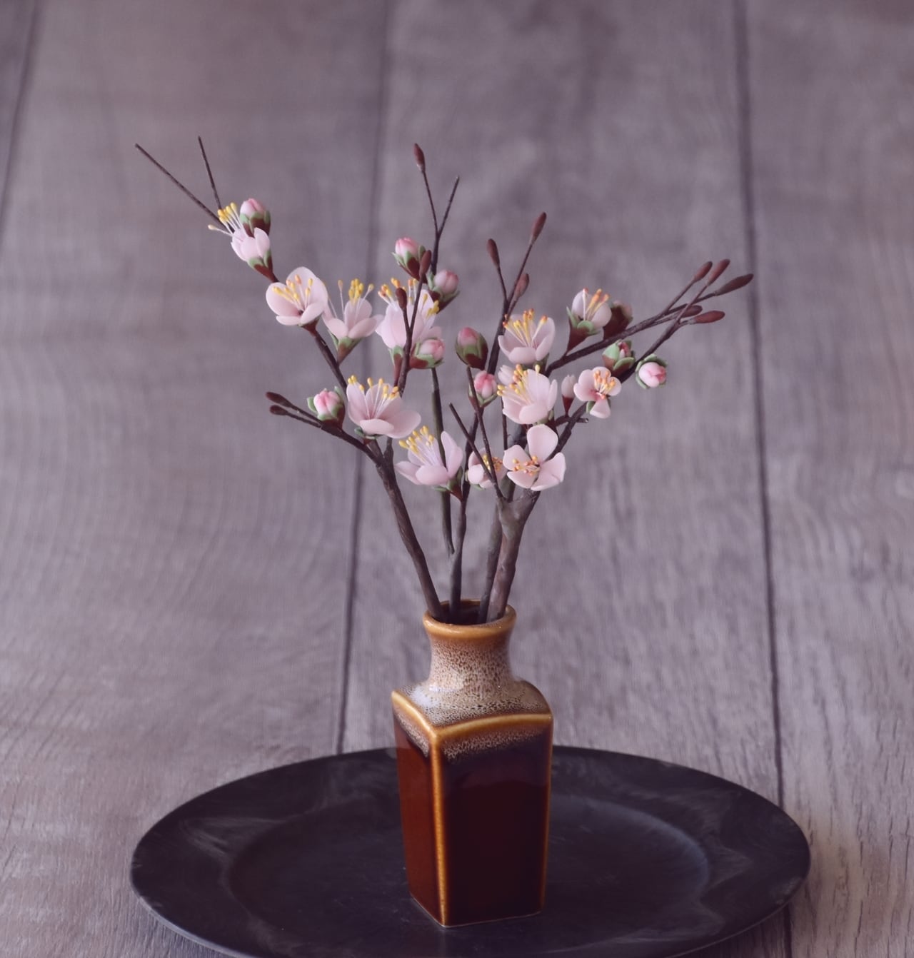 粘土で梅の花を制作し、小さなボトルに活けました。
