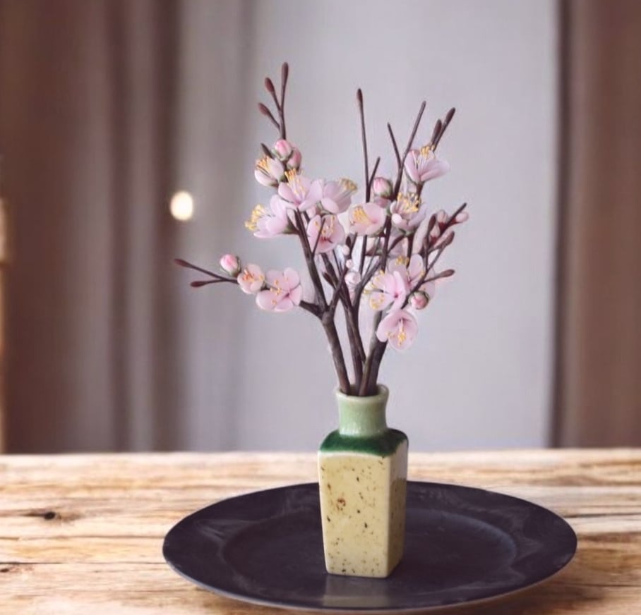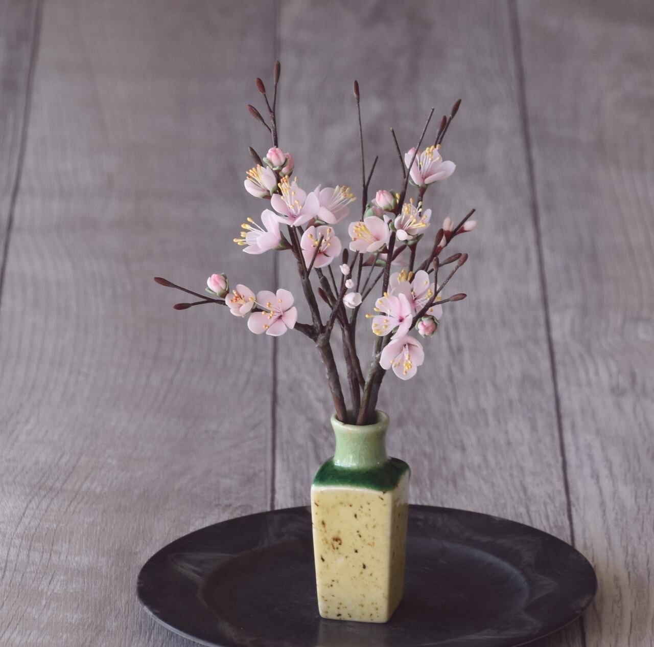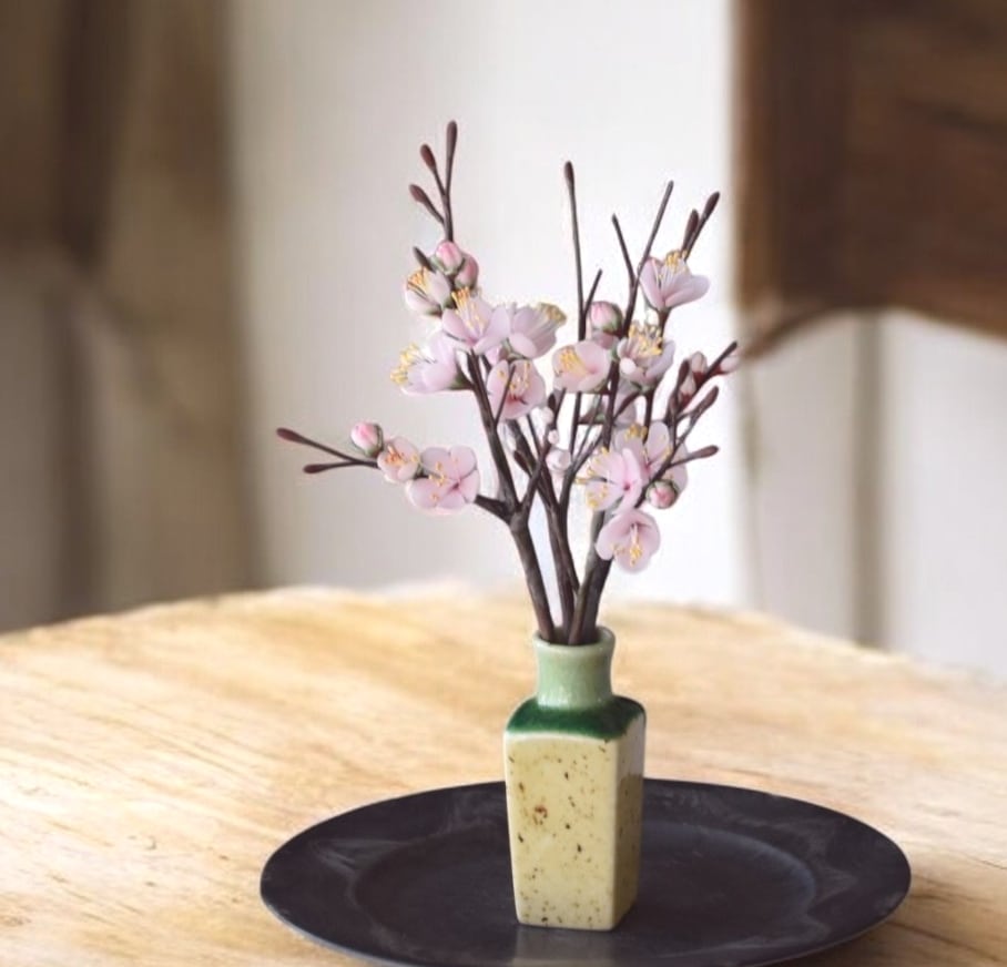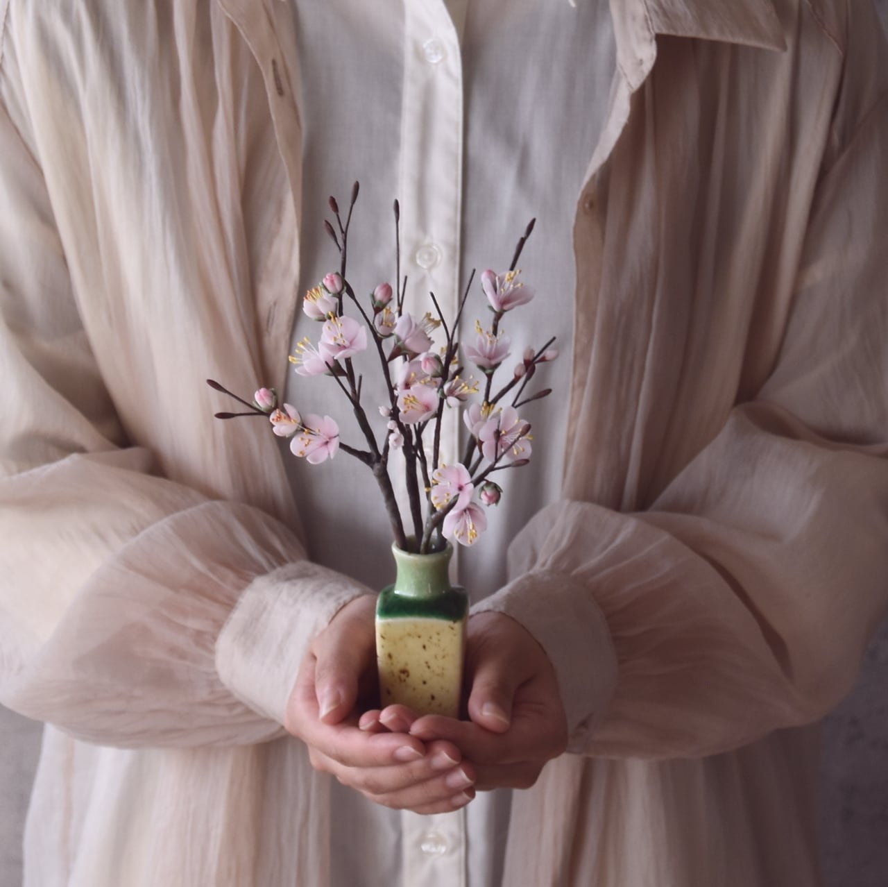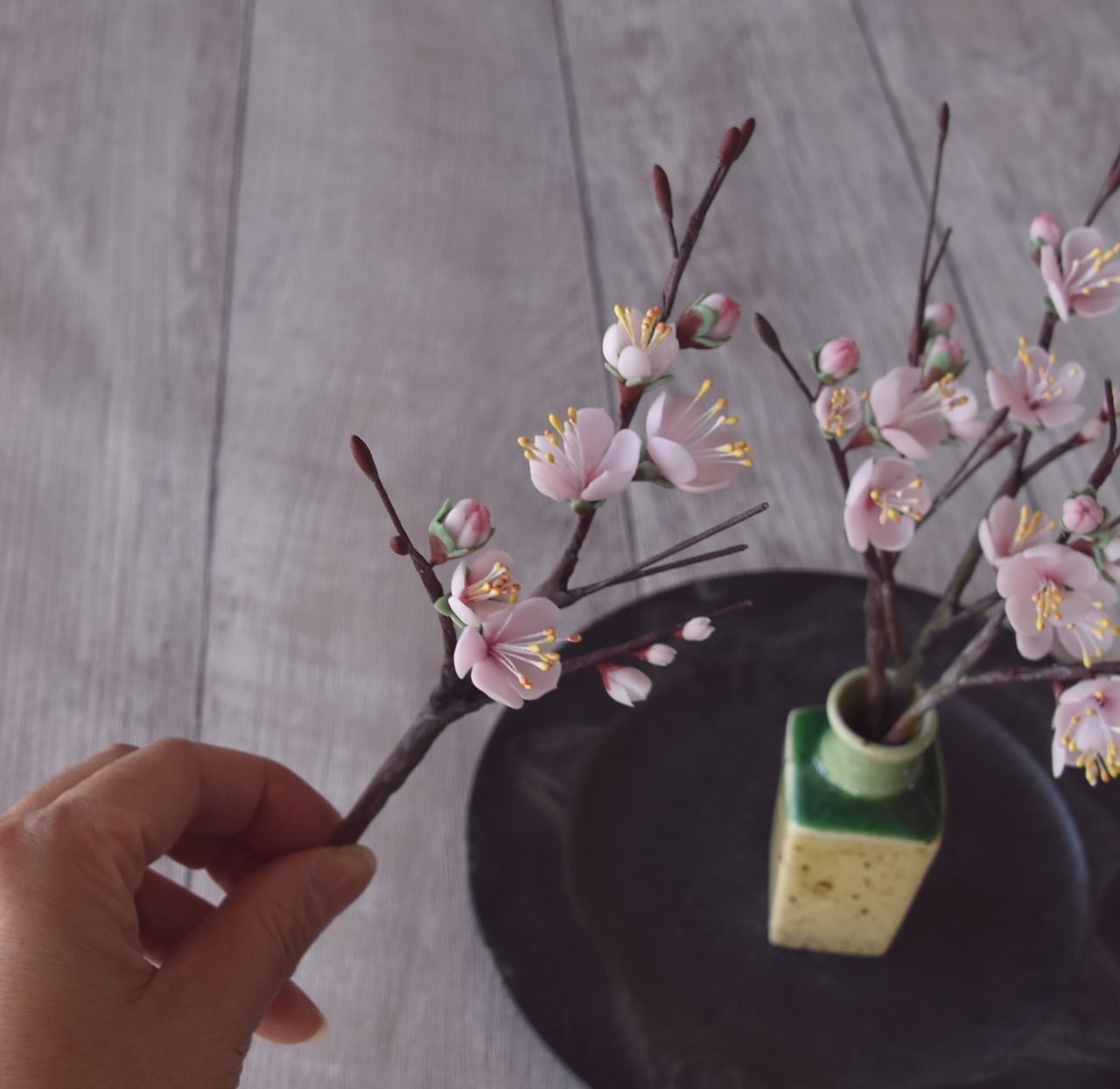 粘土で梅の花を制作し、小さなボトルに活けました。