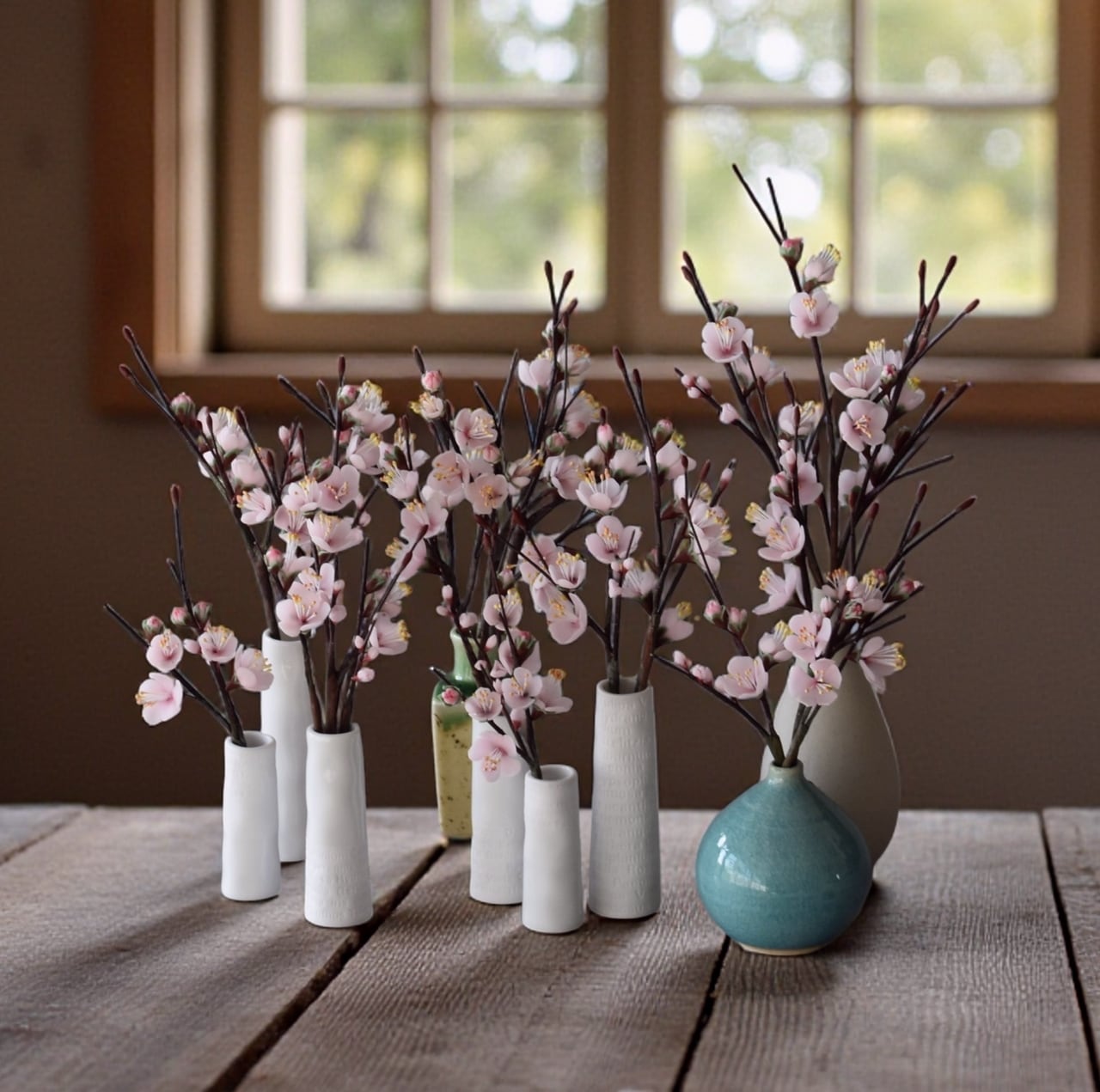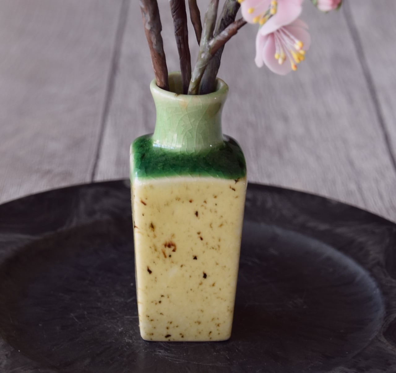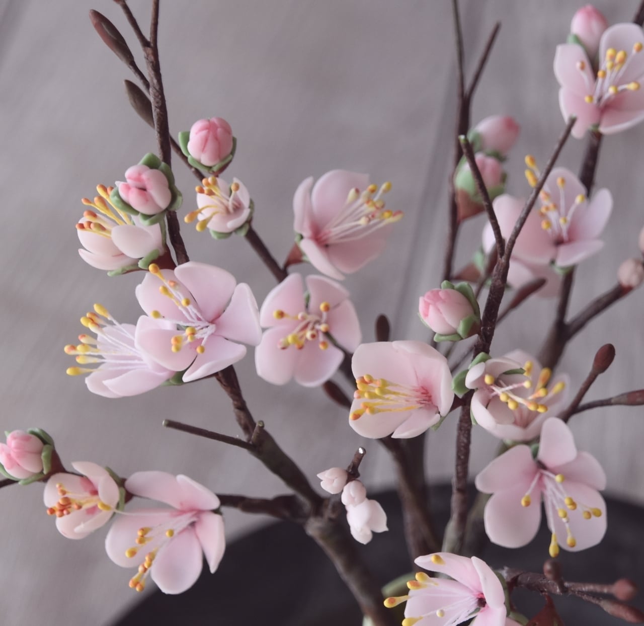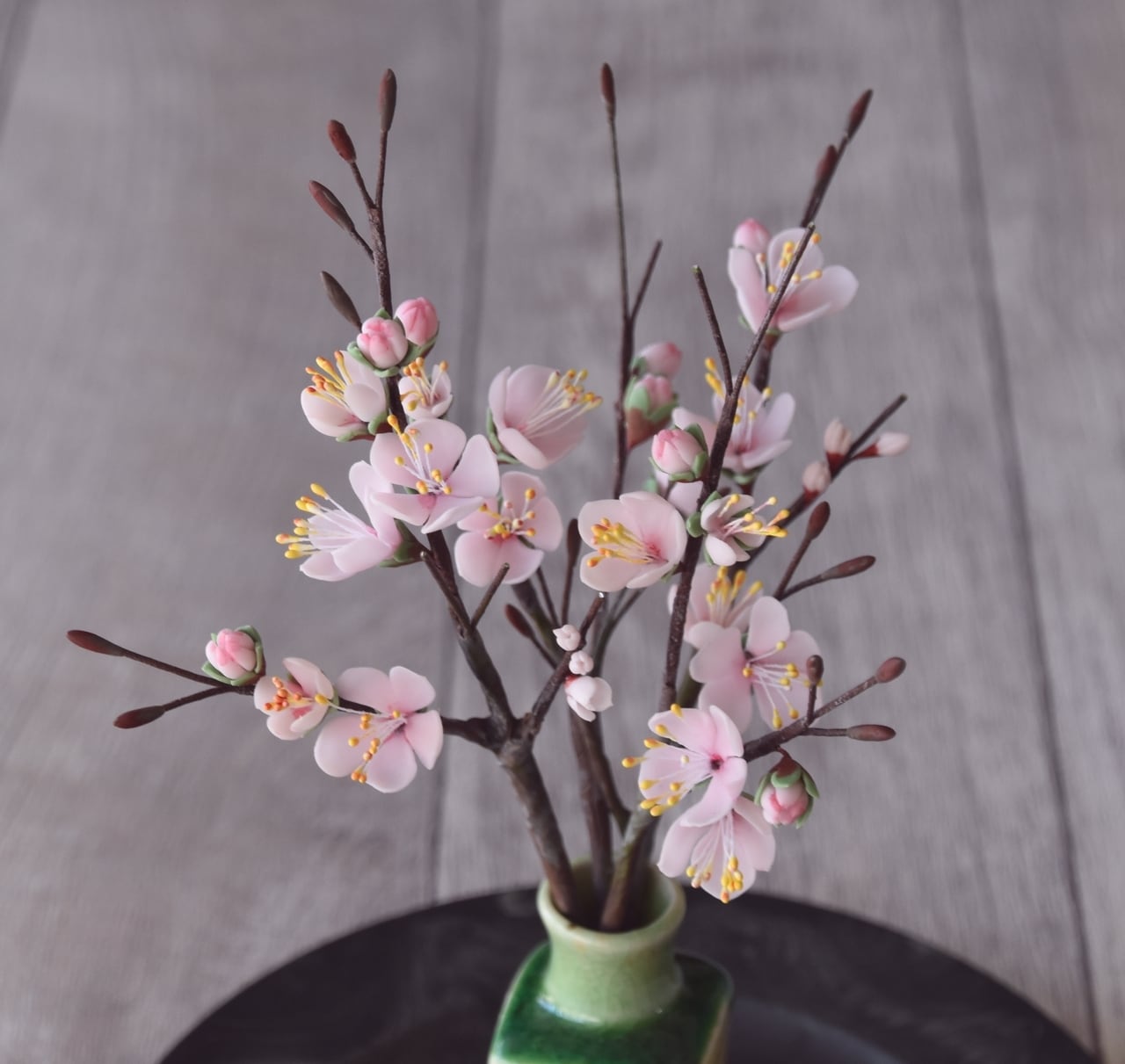粘土で梅の花を制作し、小さなボトルに活けました。