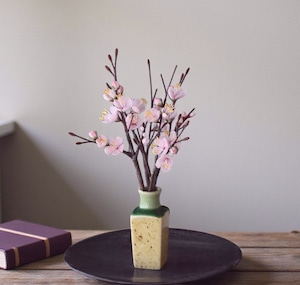 梅は細い枝をゆったりと活けましたのでよく映え、薄いピンクの花色で春を感じていただけます。