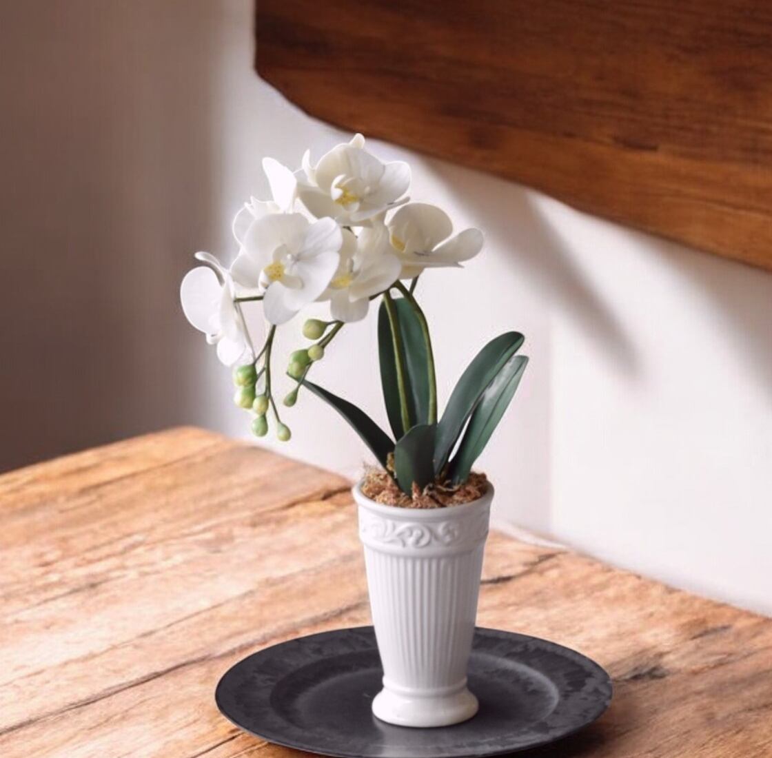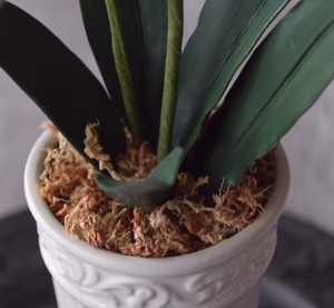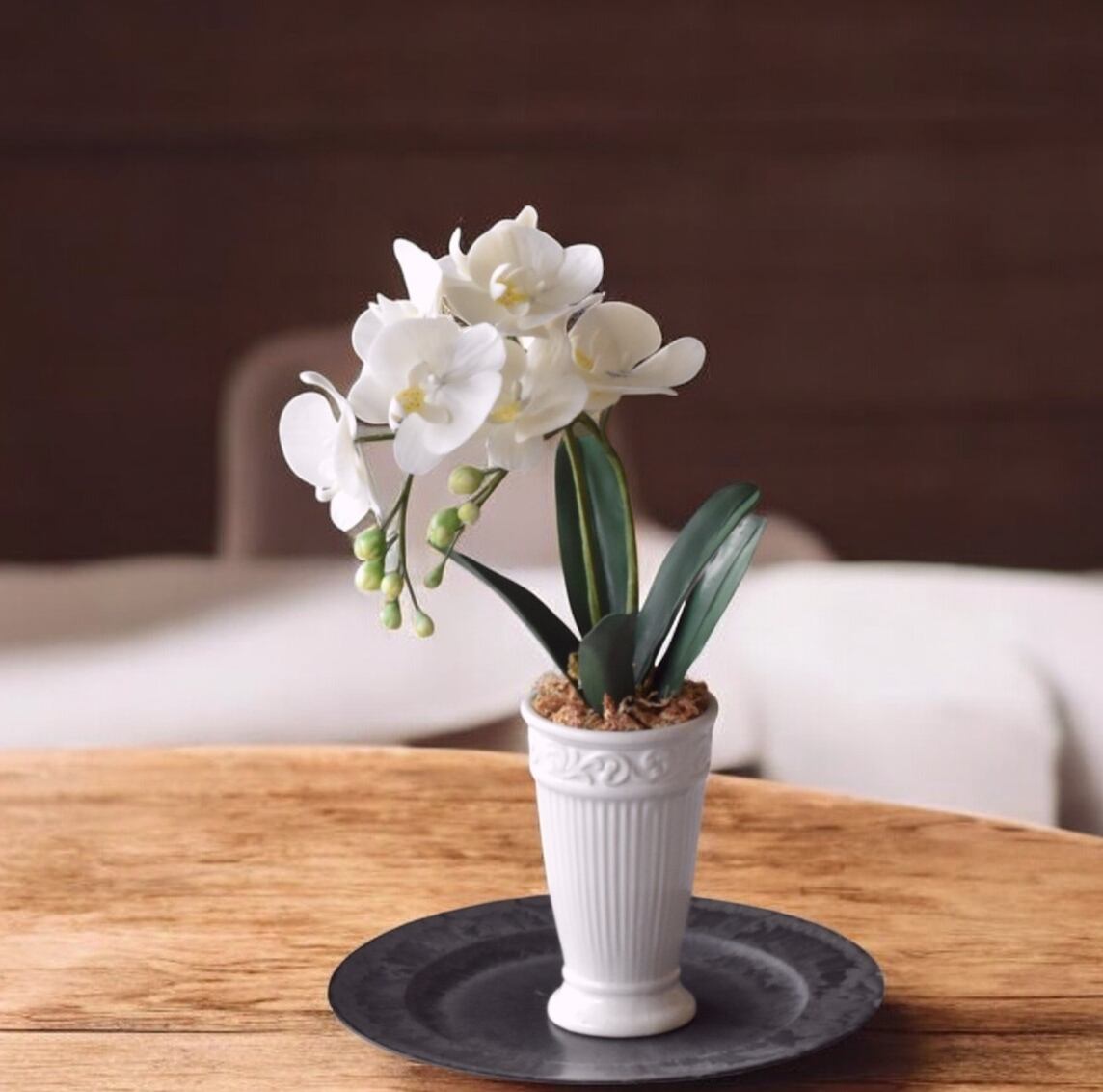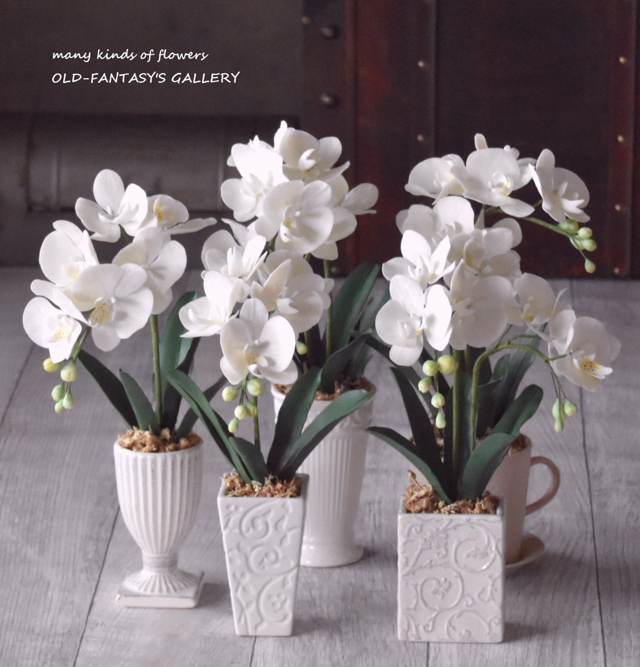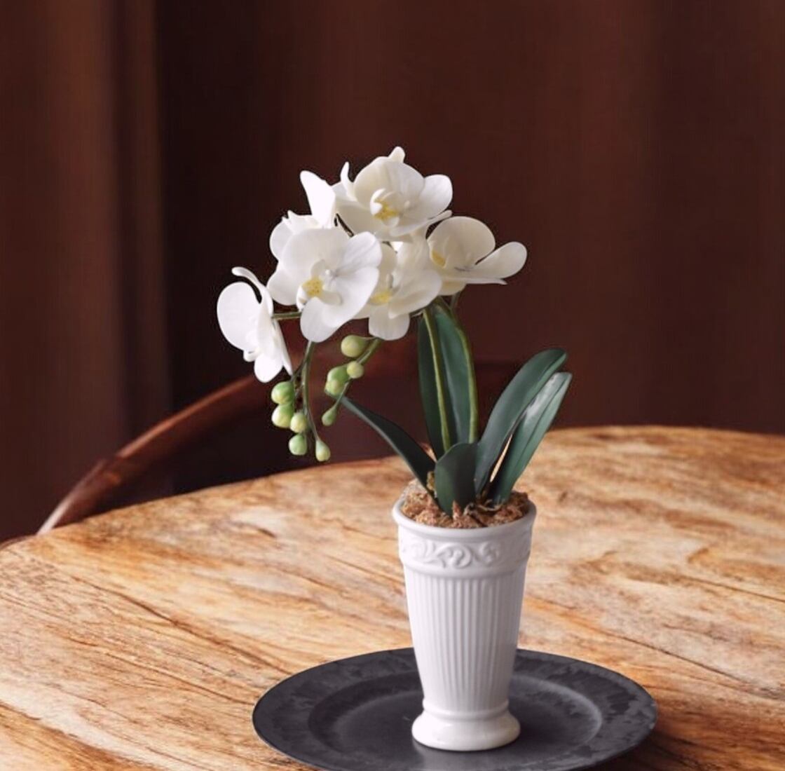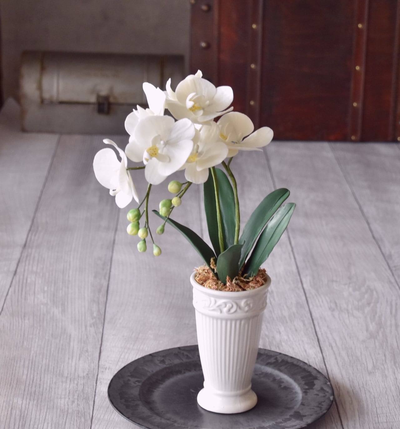 粘土でミニ胡蝶蘭をつくり、エレガントなデザインのフラワーベースに植え込みました。