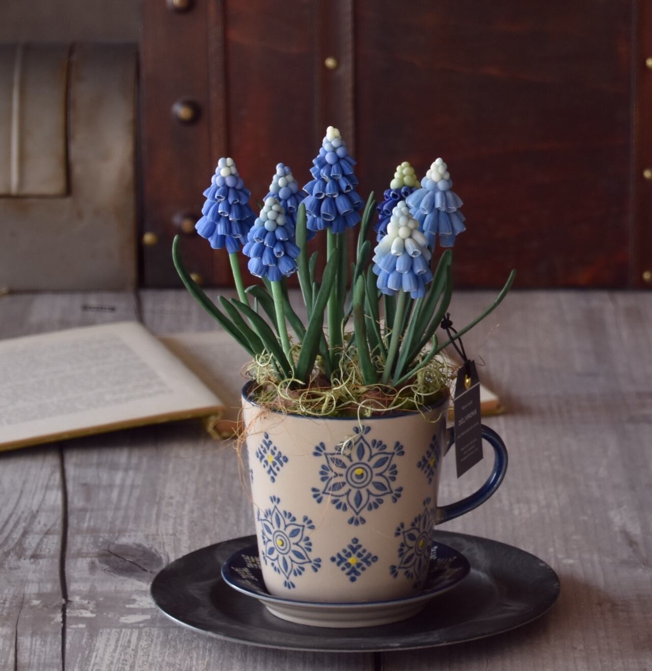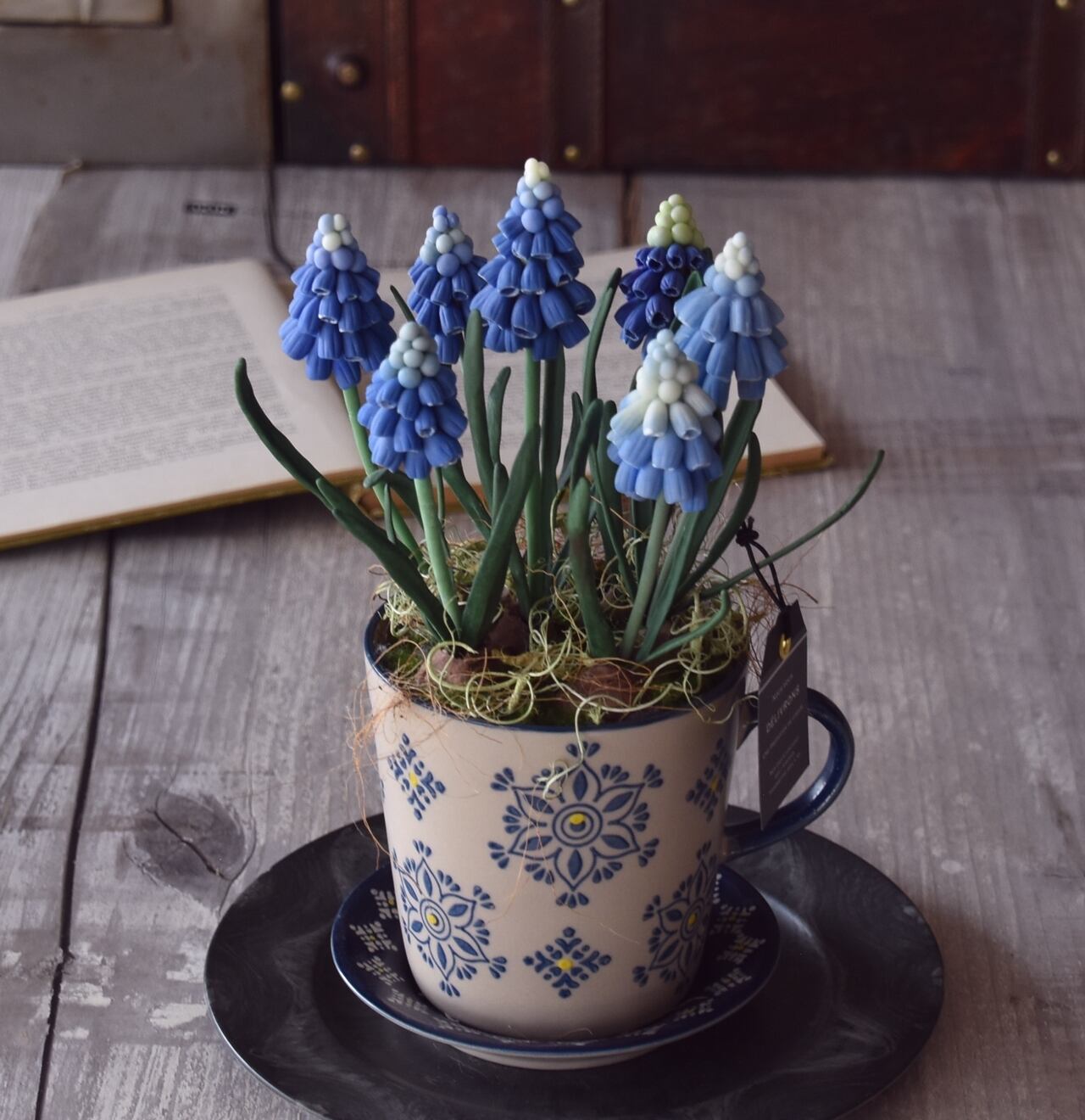 ムスカリを植え込んだ鉢は、ブルーの花柄デザインのカップ&ソーサー型の底穴付きフラワーポットです。