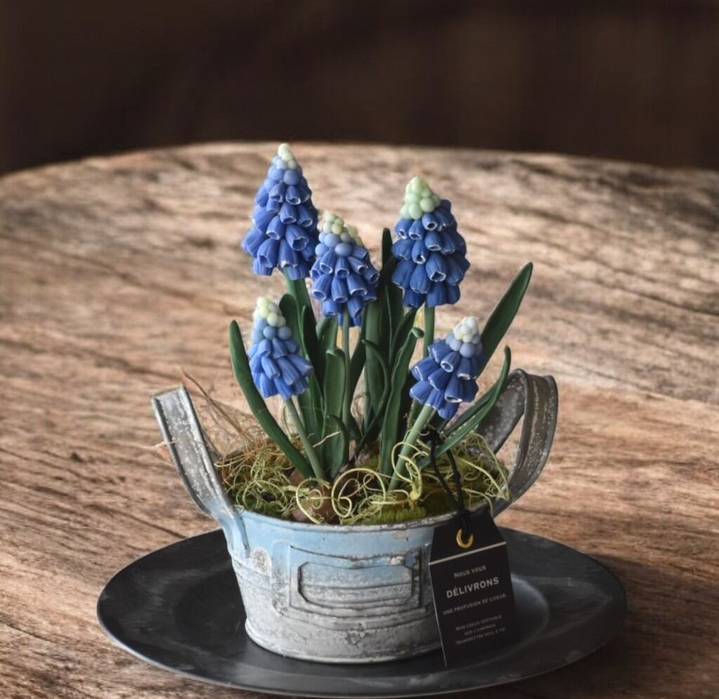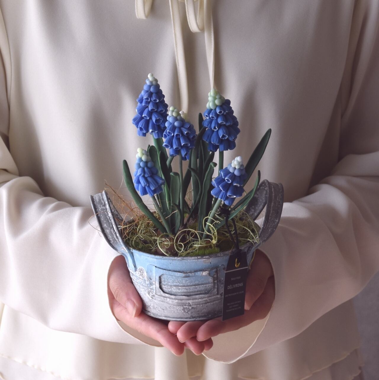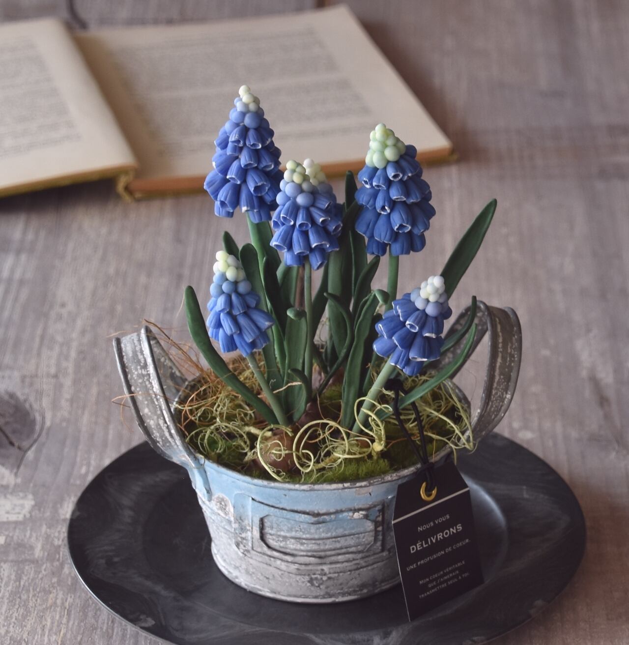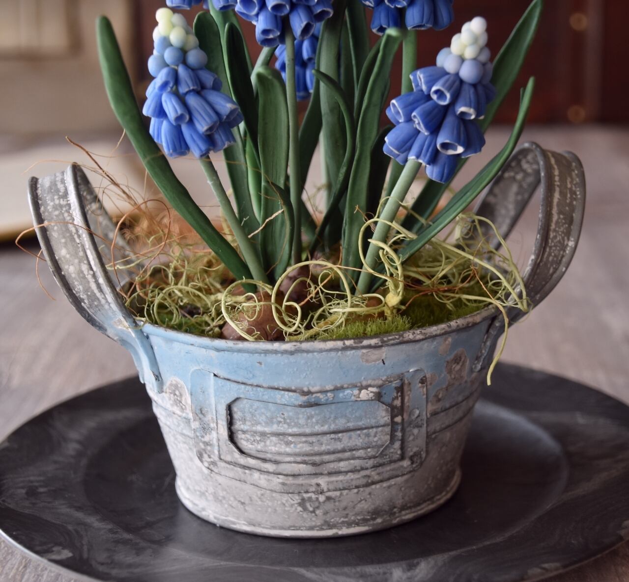 ムスカリは、小さな球根を付けて、アンティーク調のブリキポットに植え込みました。