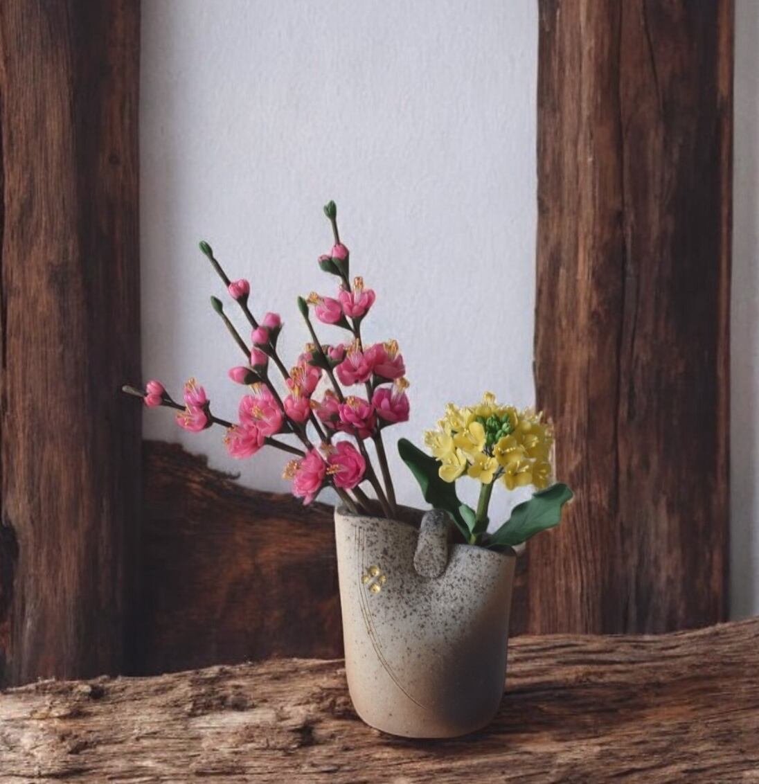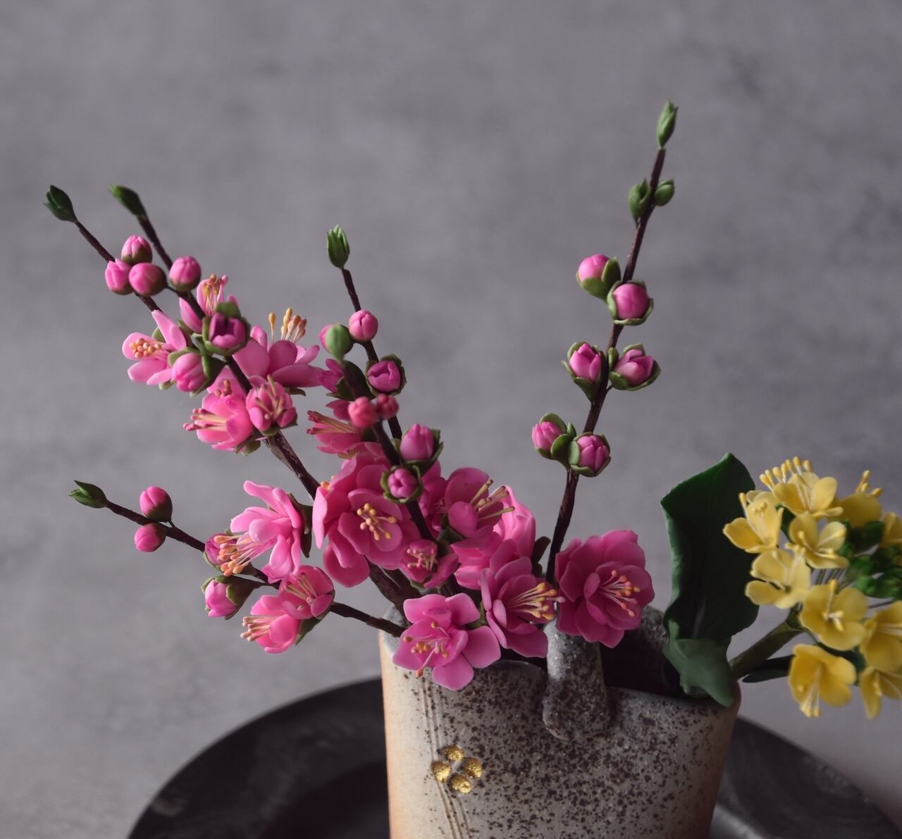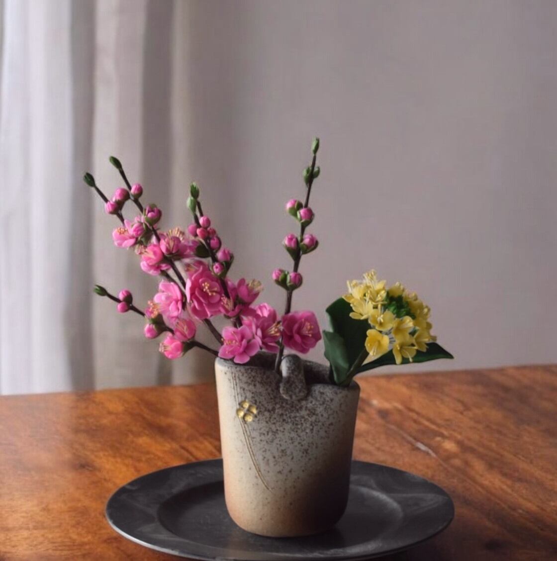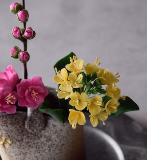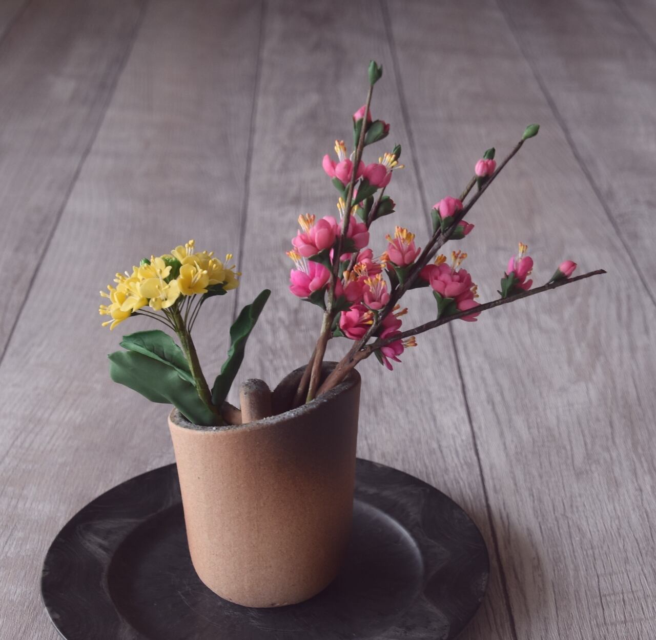 粘土で桃と菜の花をつくり、小ぶりなサイズの信楽焼の花器に活けました。