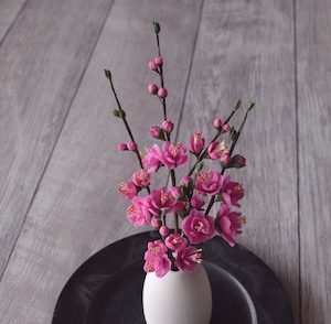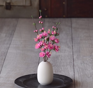 粘土で桃をつくり、シンプルで丸みが可愛い花器に活けました。