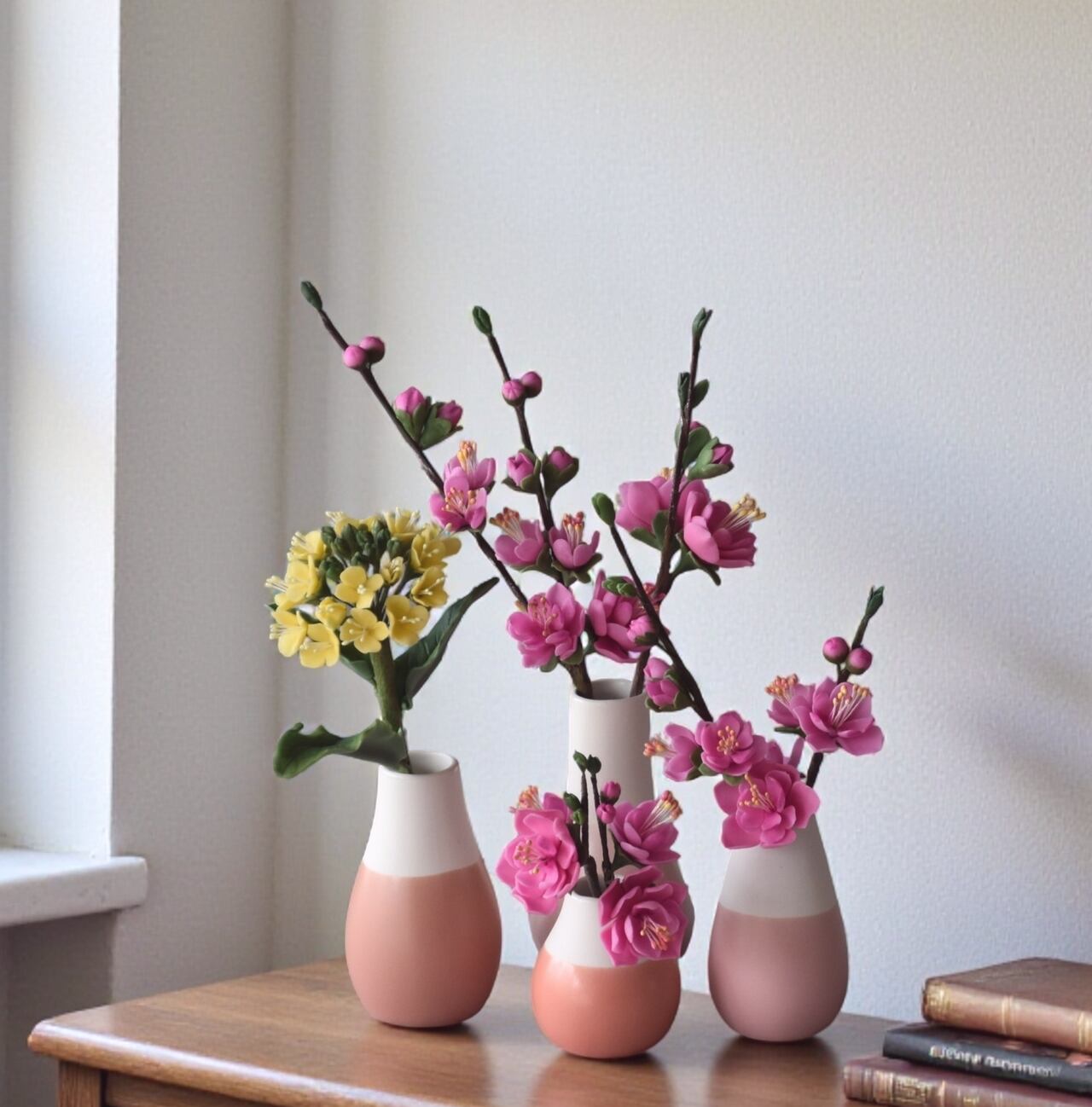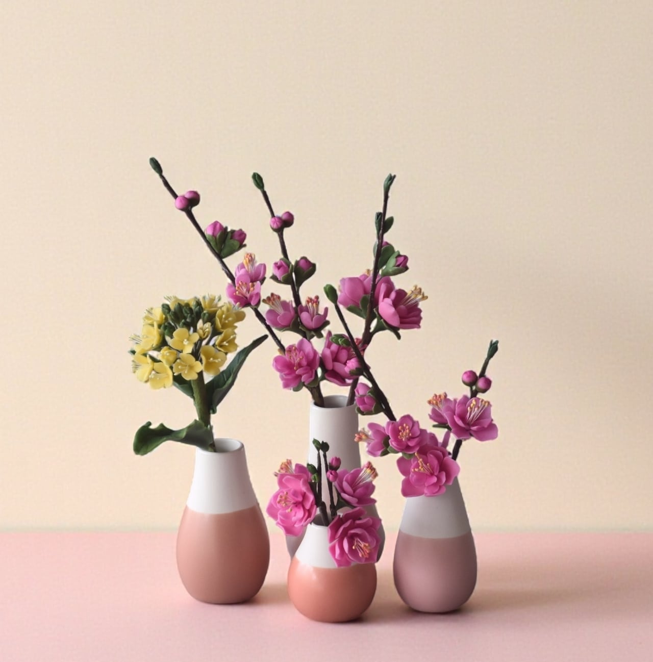 粘土で桃の花と菜の花をつくり、コロリとした形の小さな花器に活けました。