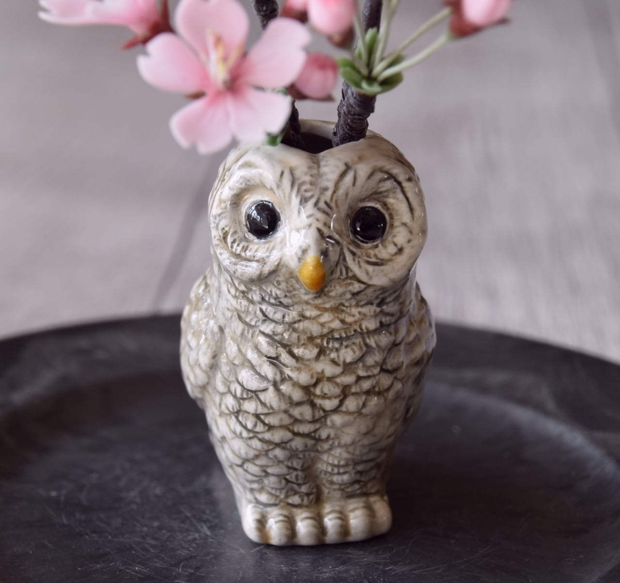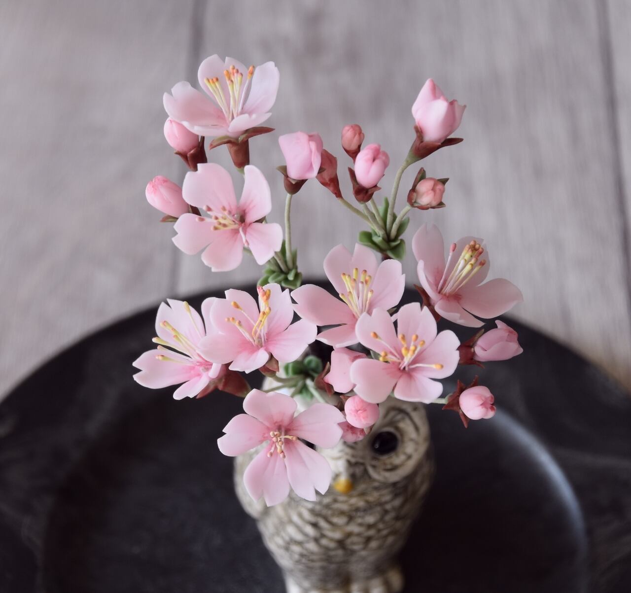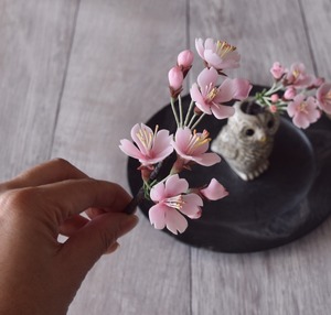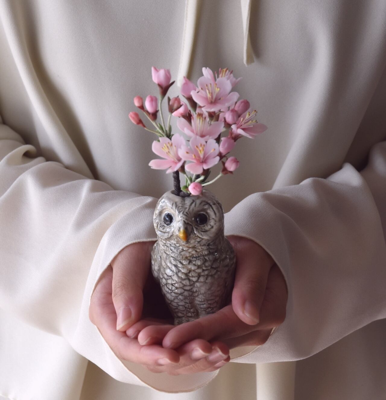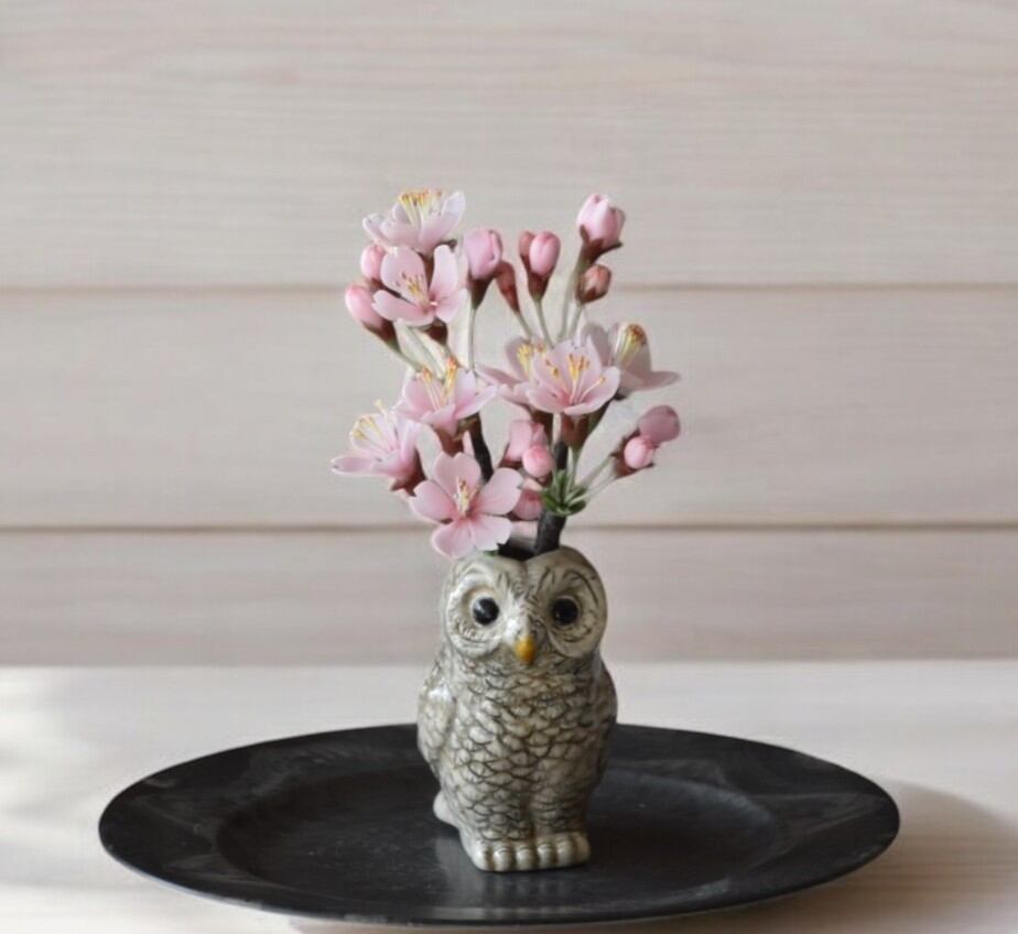 粘土で桜をつくり、フクロウのフラワーベースに活けました。