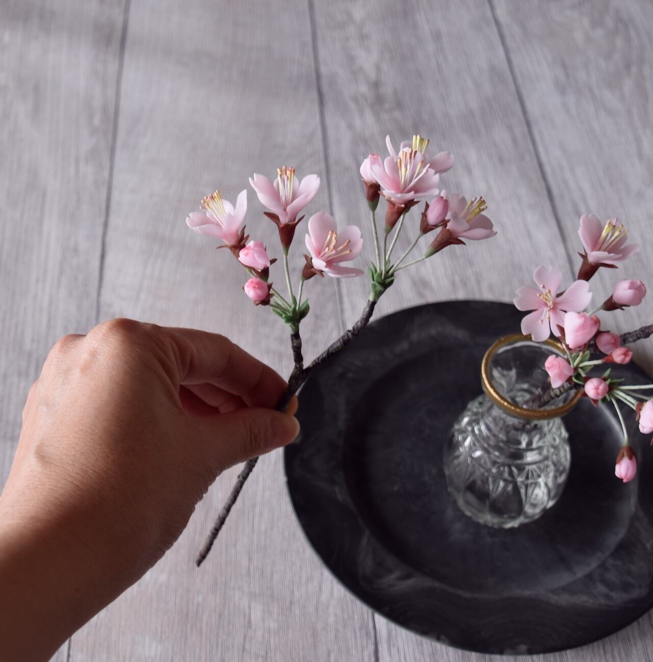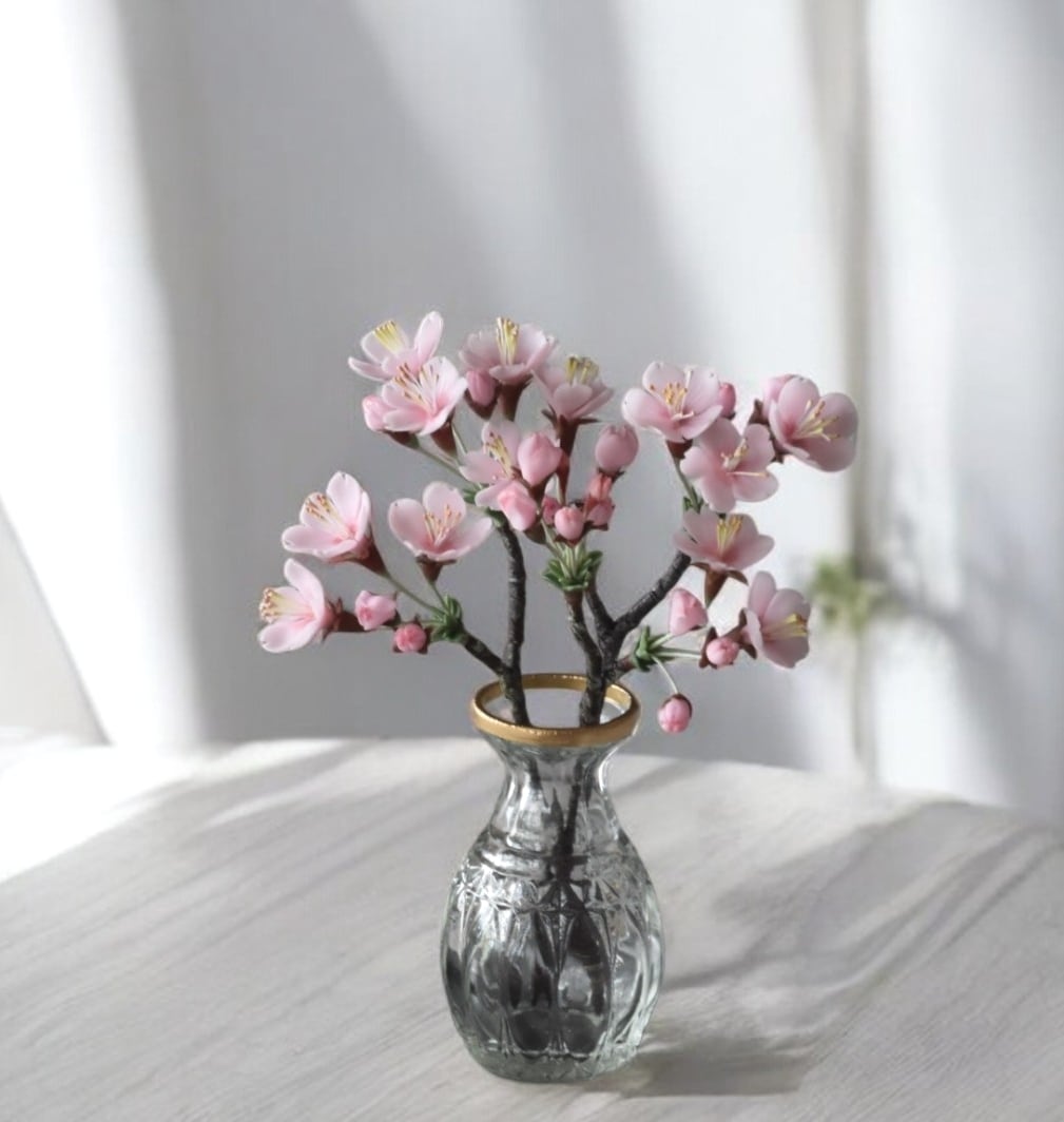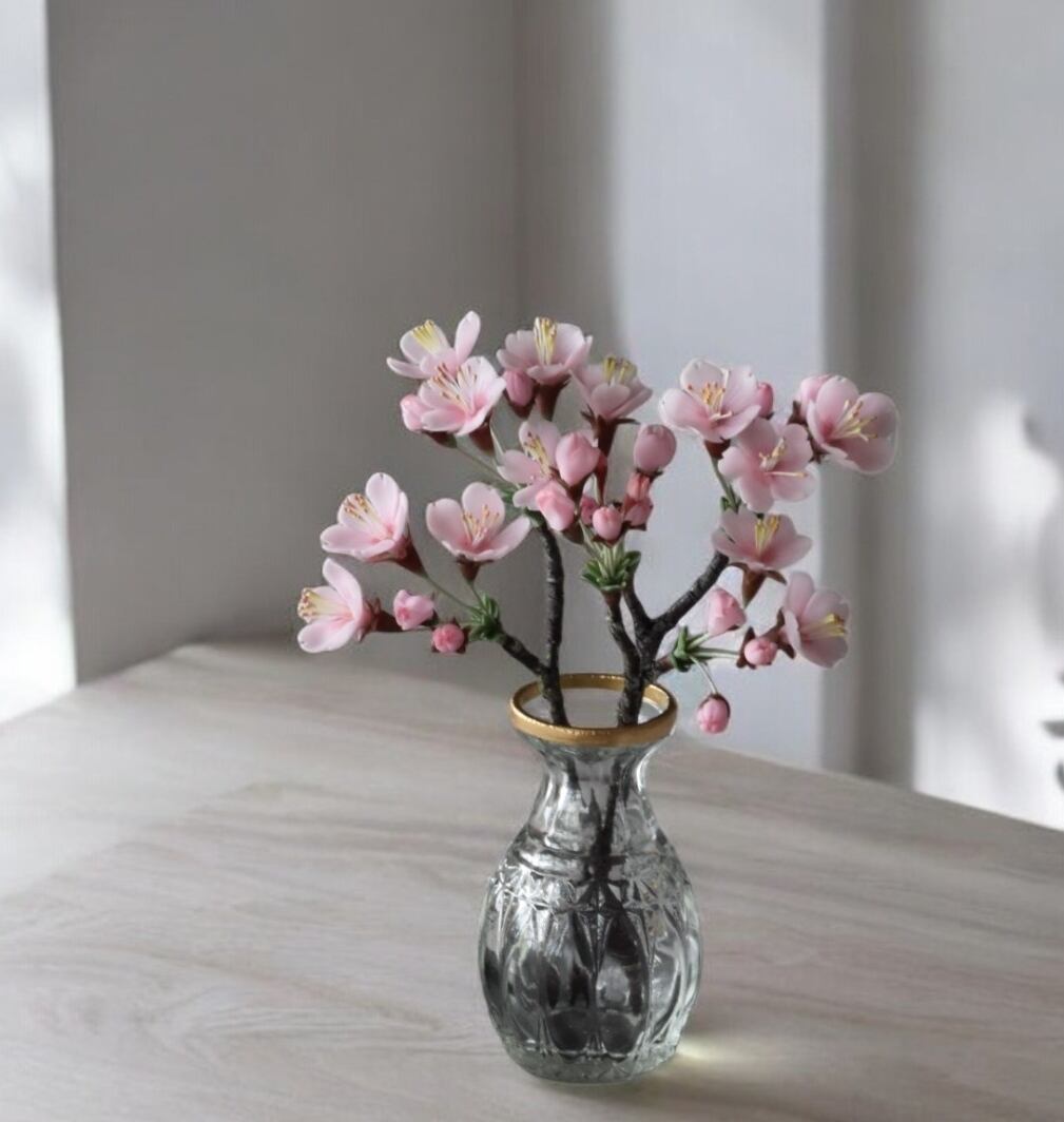 粘土で桜をつくり、おしやれなオルリム・シングルベースに活けました。
