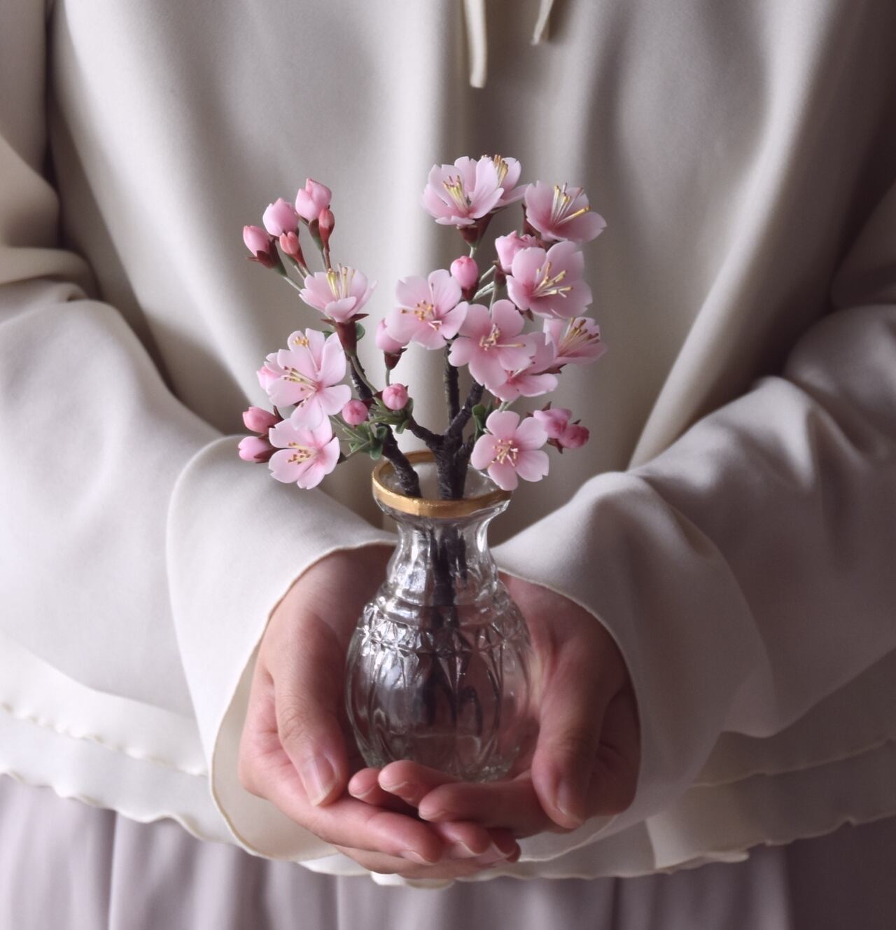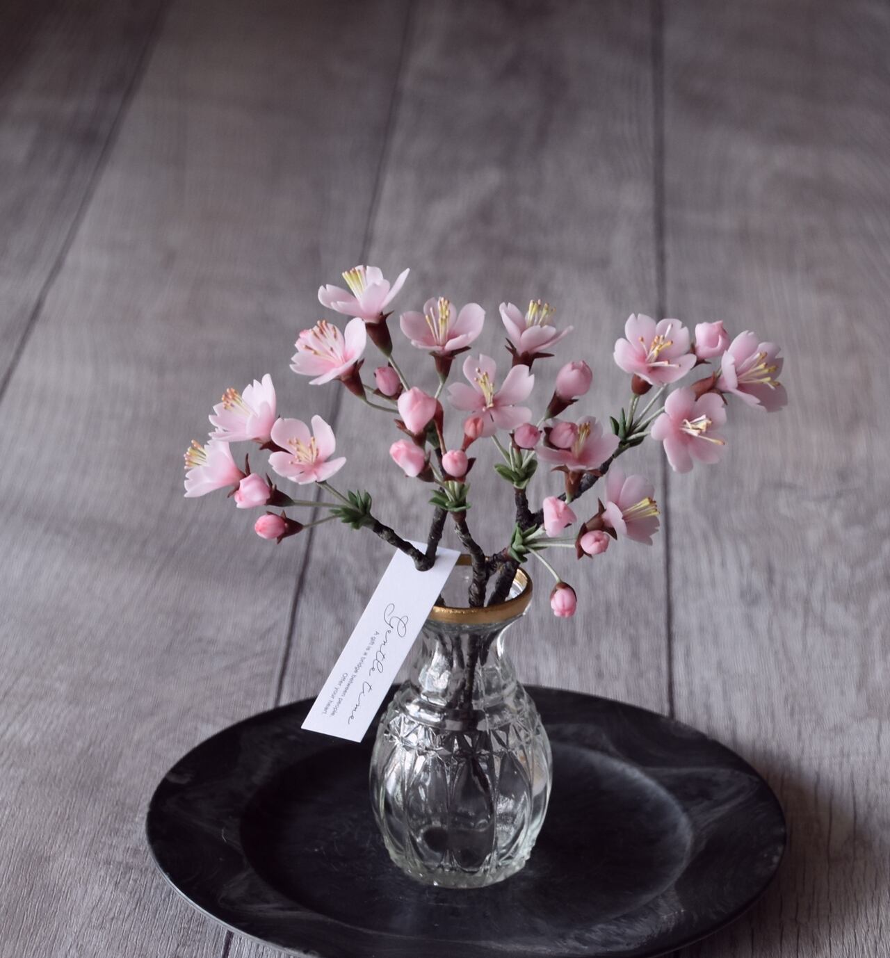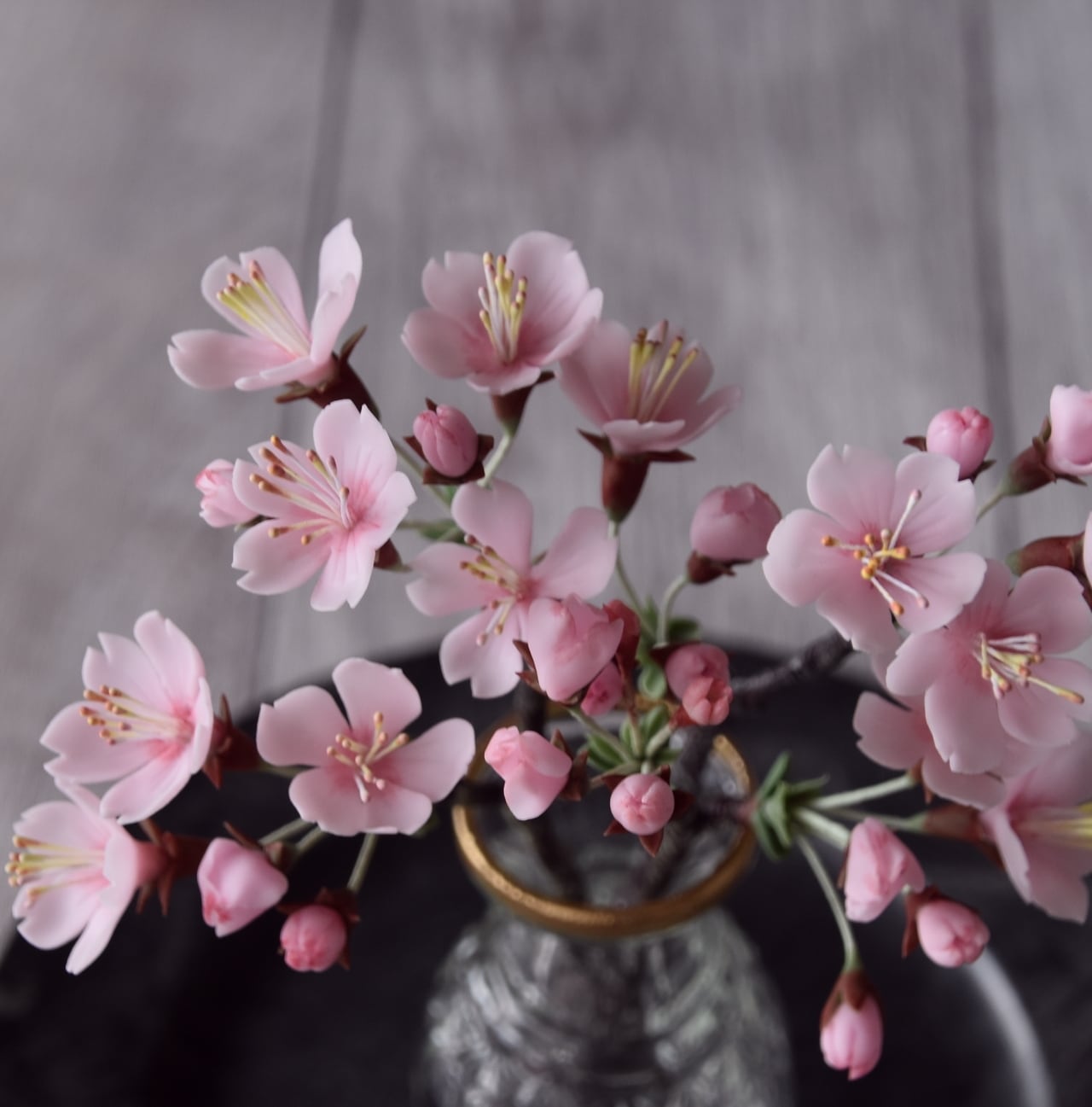 粘土で桜をつくり、おしやれなオルリム・シングルベースに活けました。